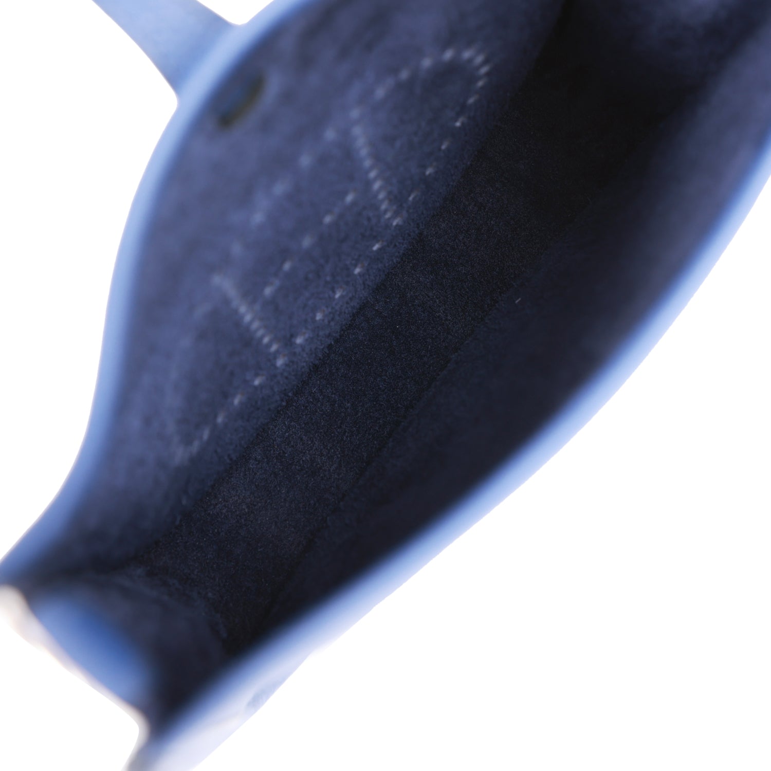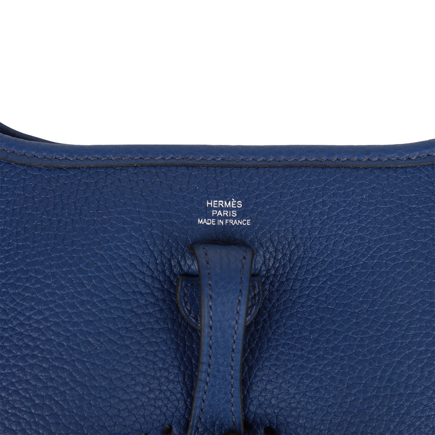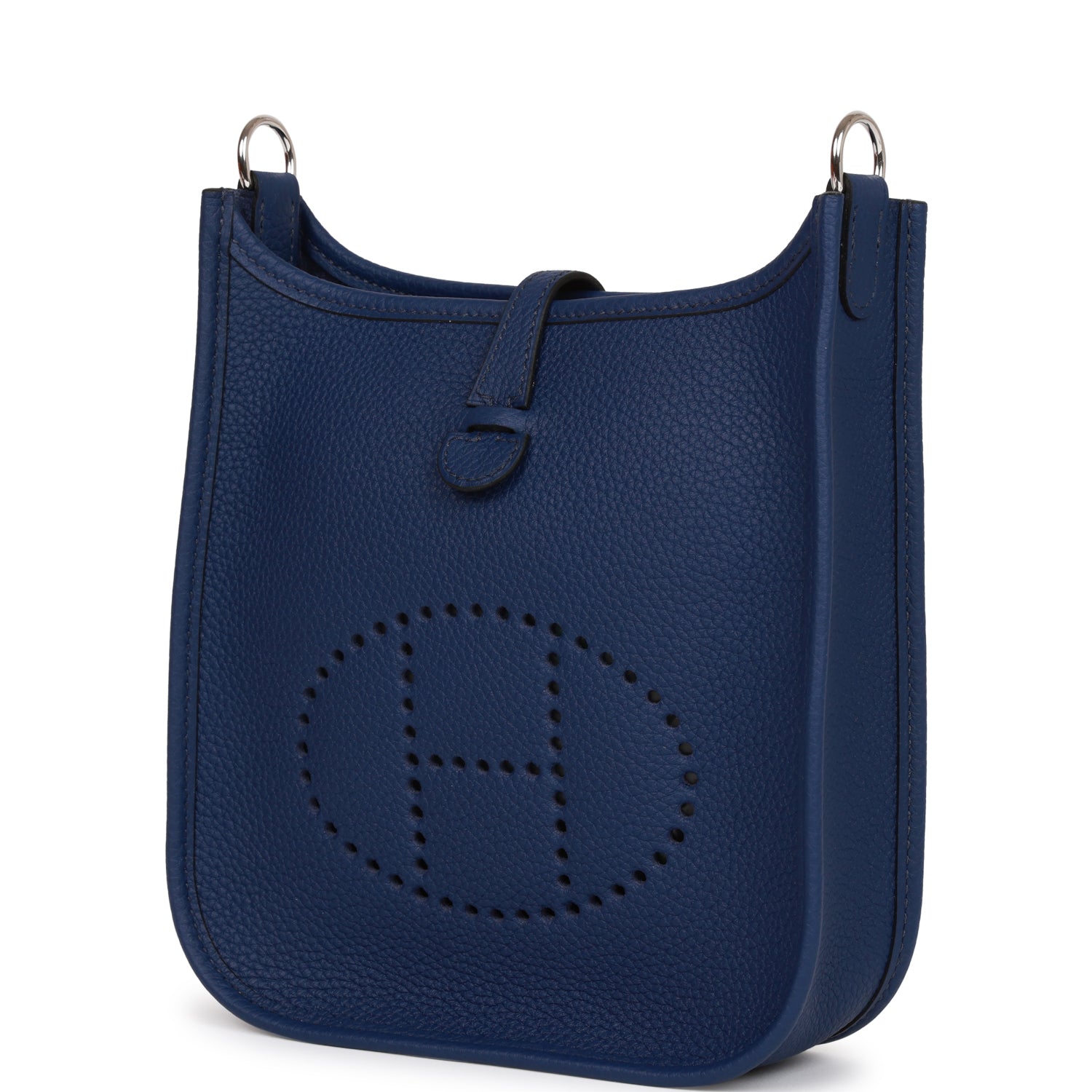 This Evelyne is in Bleu Saphir maurice leather with palladium hardware and has tonal stitching, pull tab top closure and a Bleu Nuit removable canvas and leather shoulder/crossbody strap.