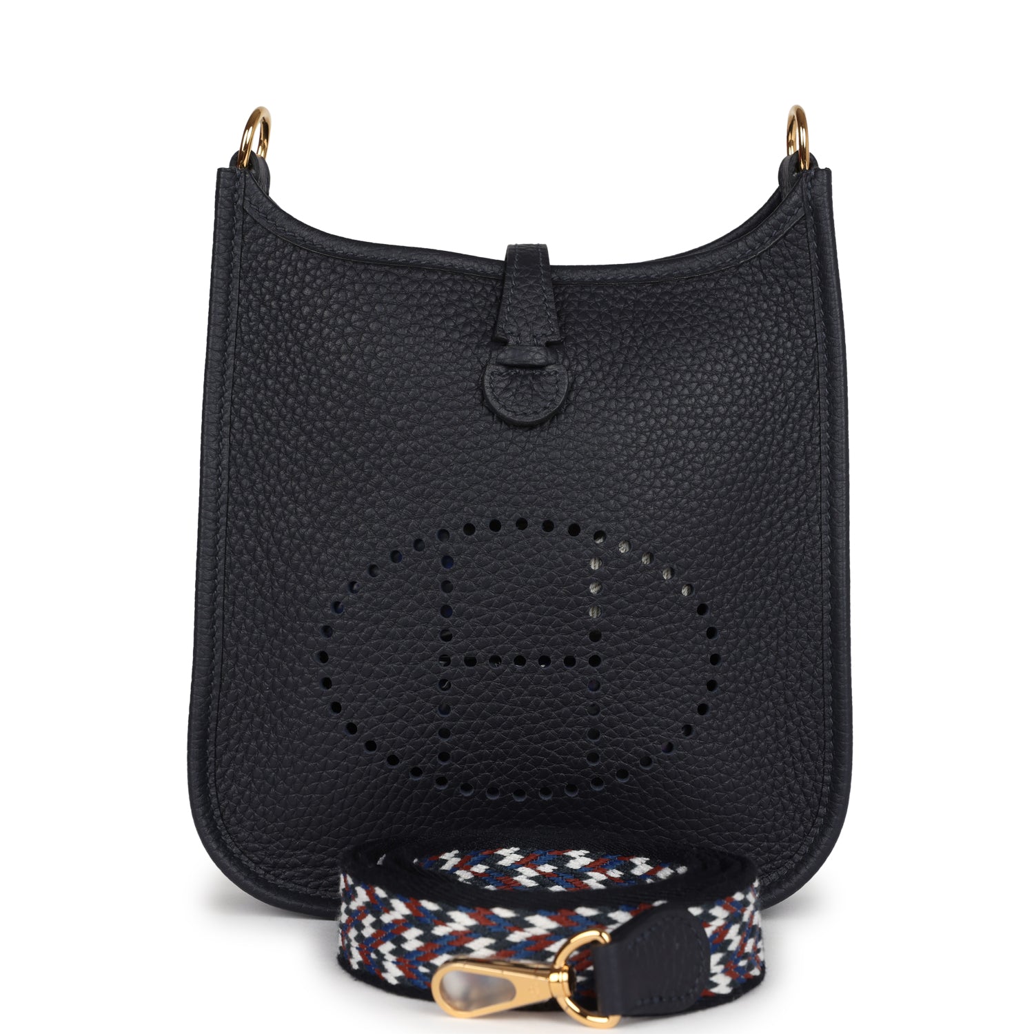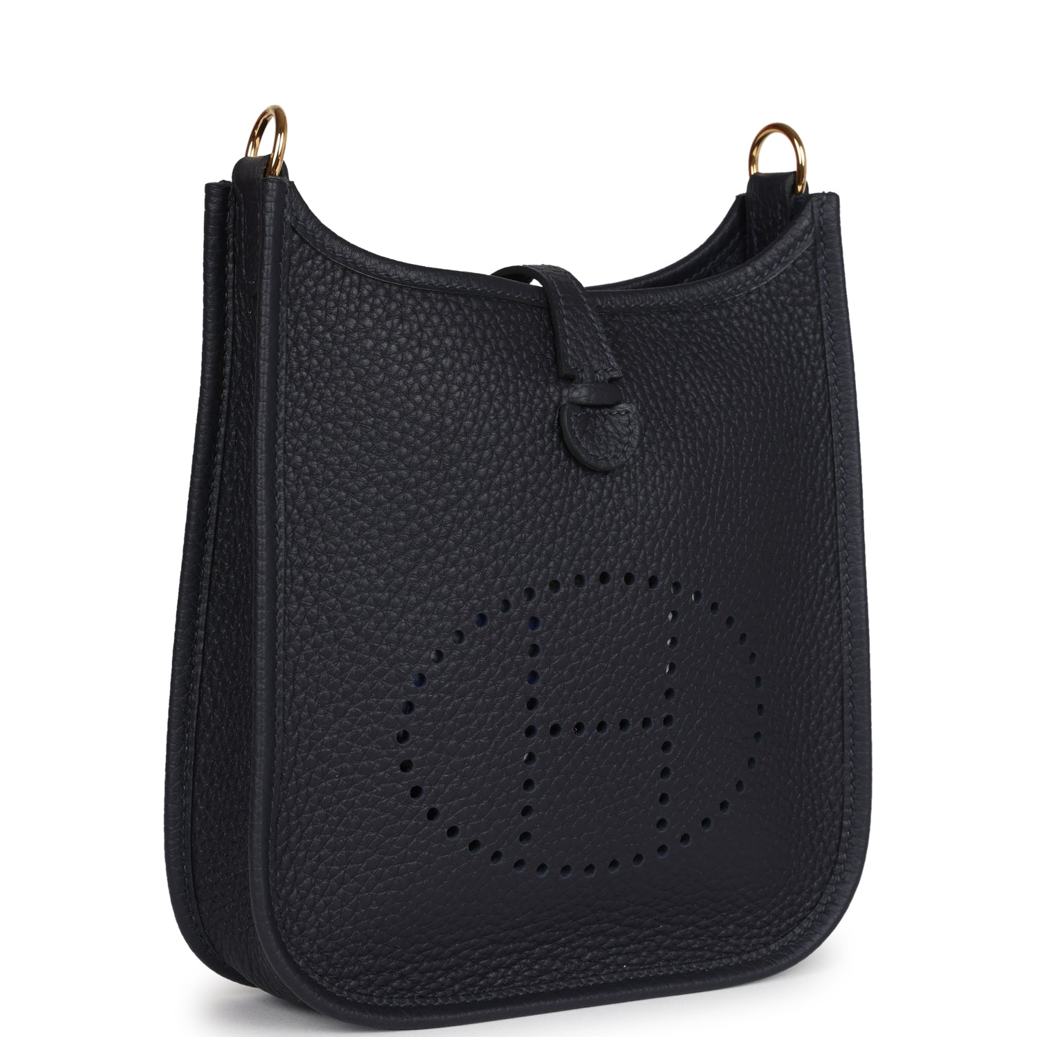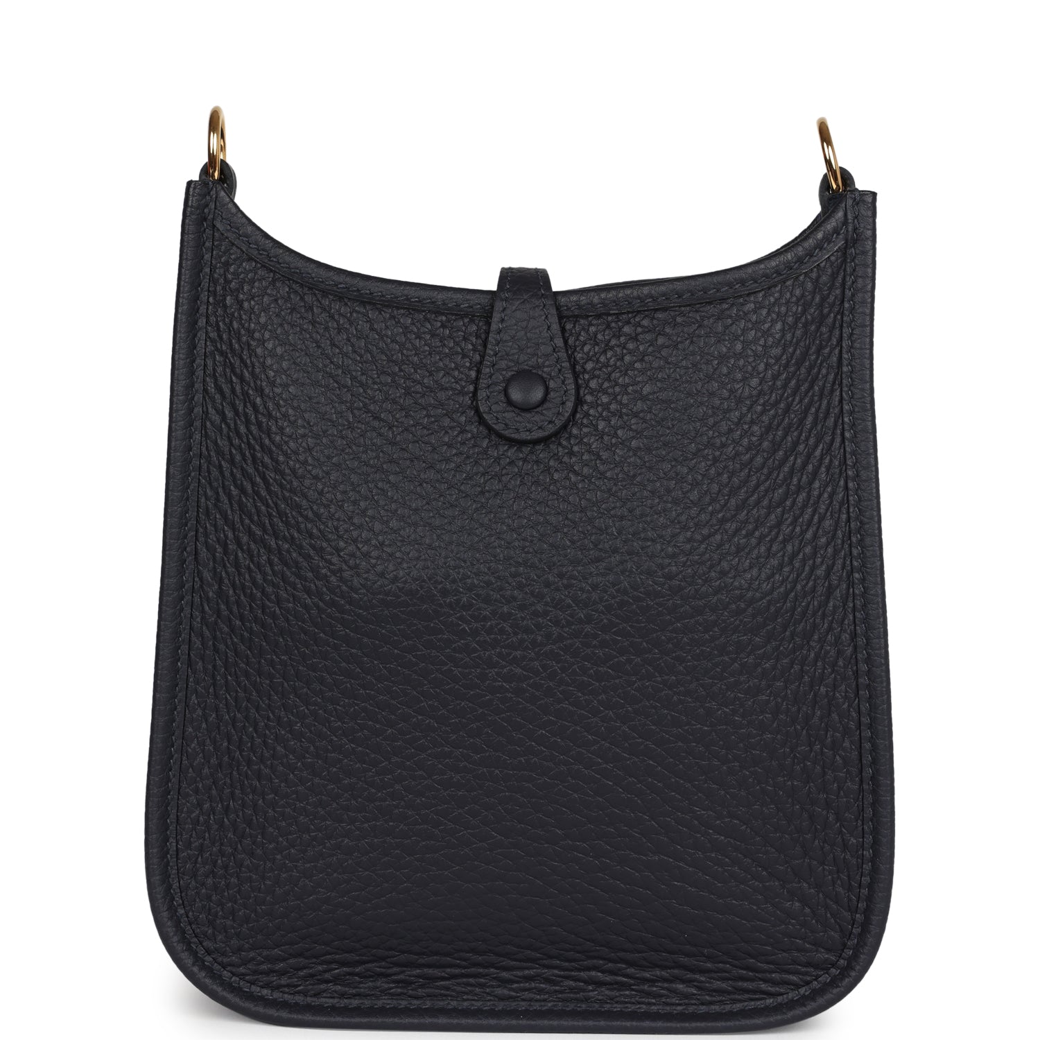 This Evelyne TPM Caban clemence leather with gold hardware, tonal stitching, large perforated H in circle (front), pull tab top snap closure and removable wool/canvas shoulder/crossbody strap.