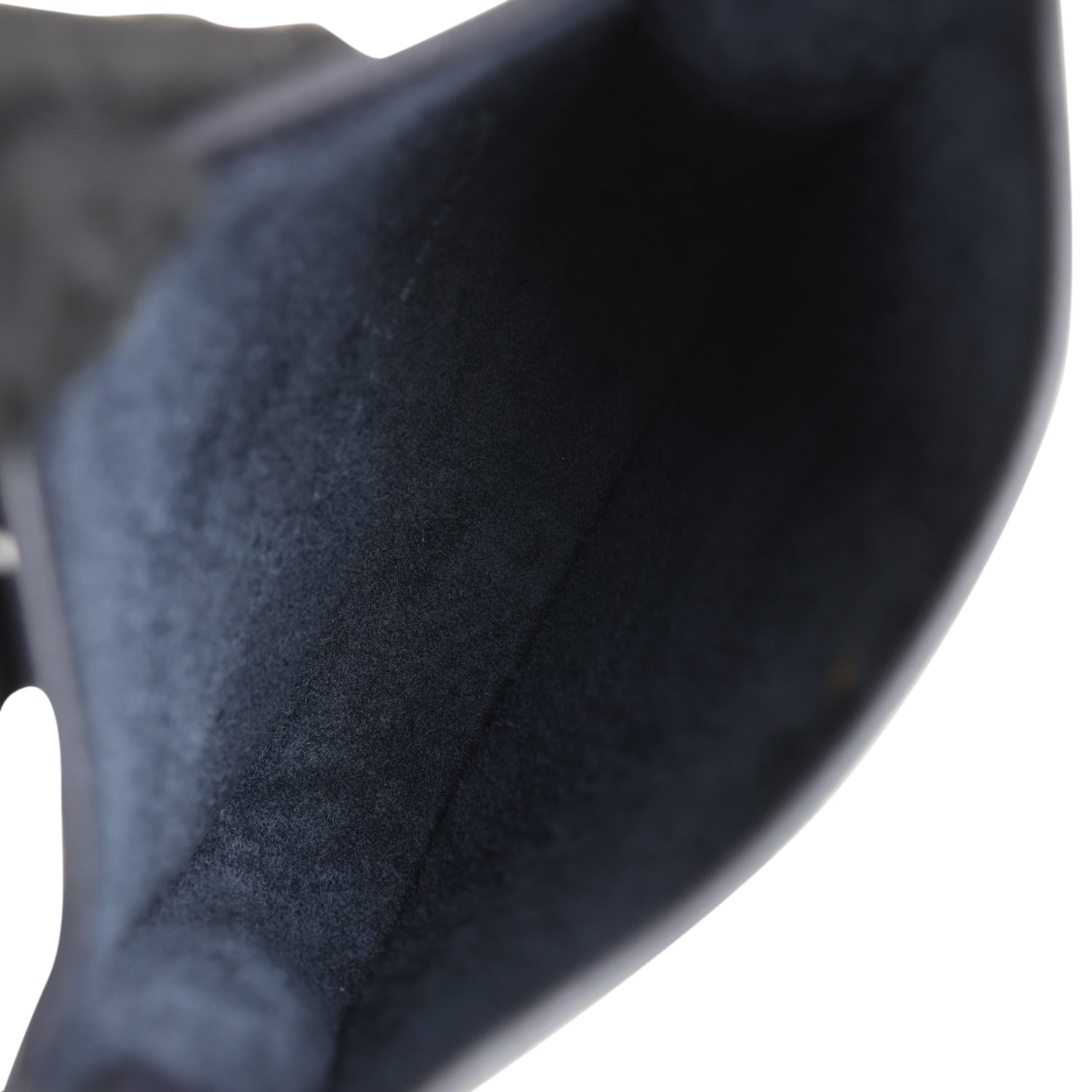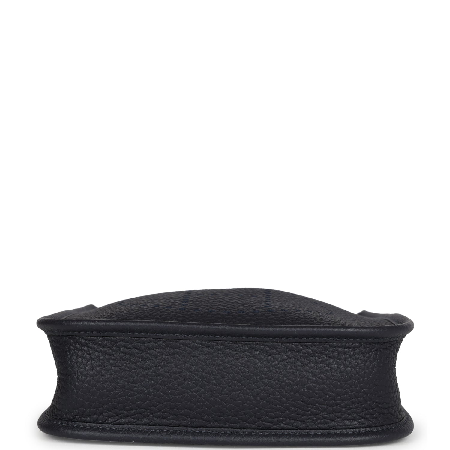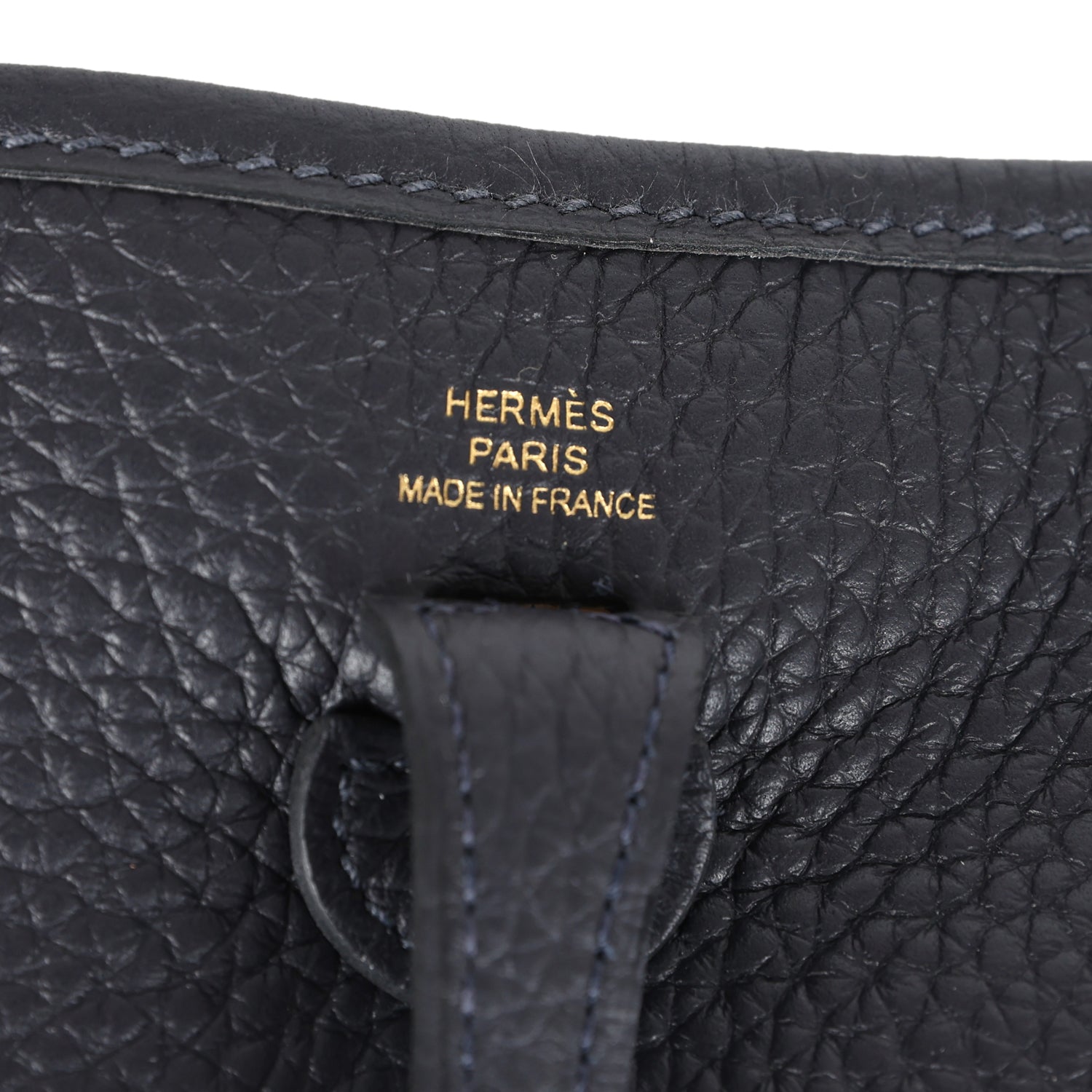 This Evelyne TPM Caban clemence leather with gold hardware, tonal stitching, large perforated H in circle (front), pull tab top snap closure and removable wool/canvas shoulder/crossbody strap.