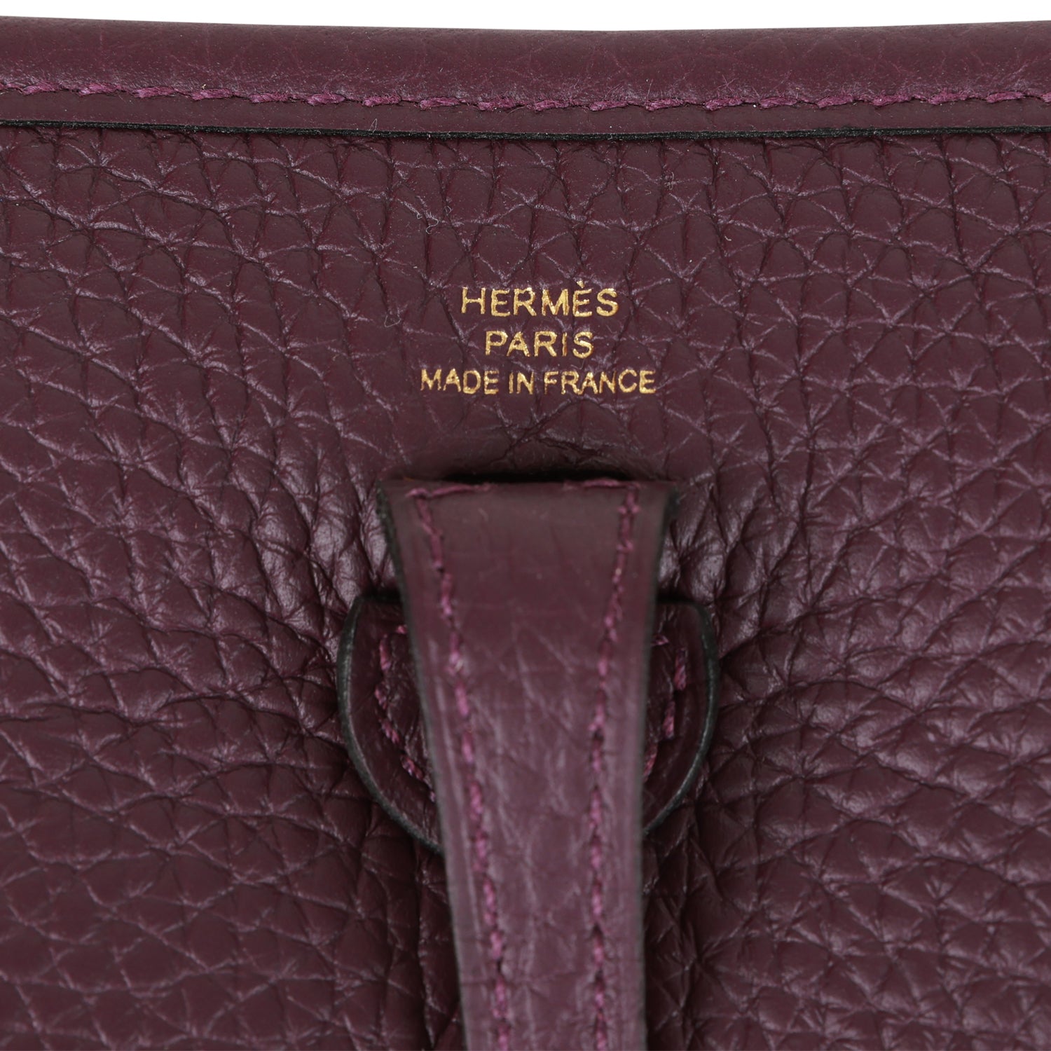 This Evelyne TPM is in Cassis clemence leather with gold hardware and features tonal stitching stitching, pull tab top closure and a Rouge Grenat removable canvas and leather shoulder/crossbody strap.