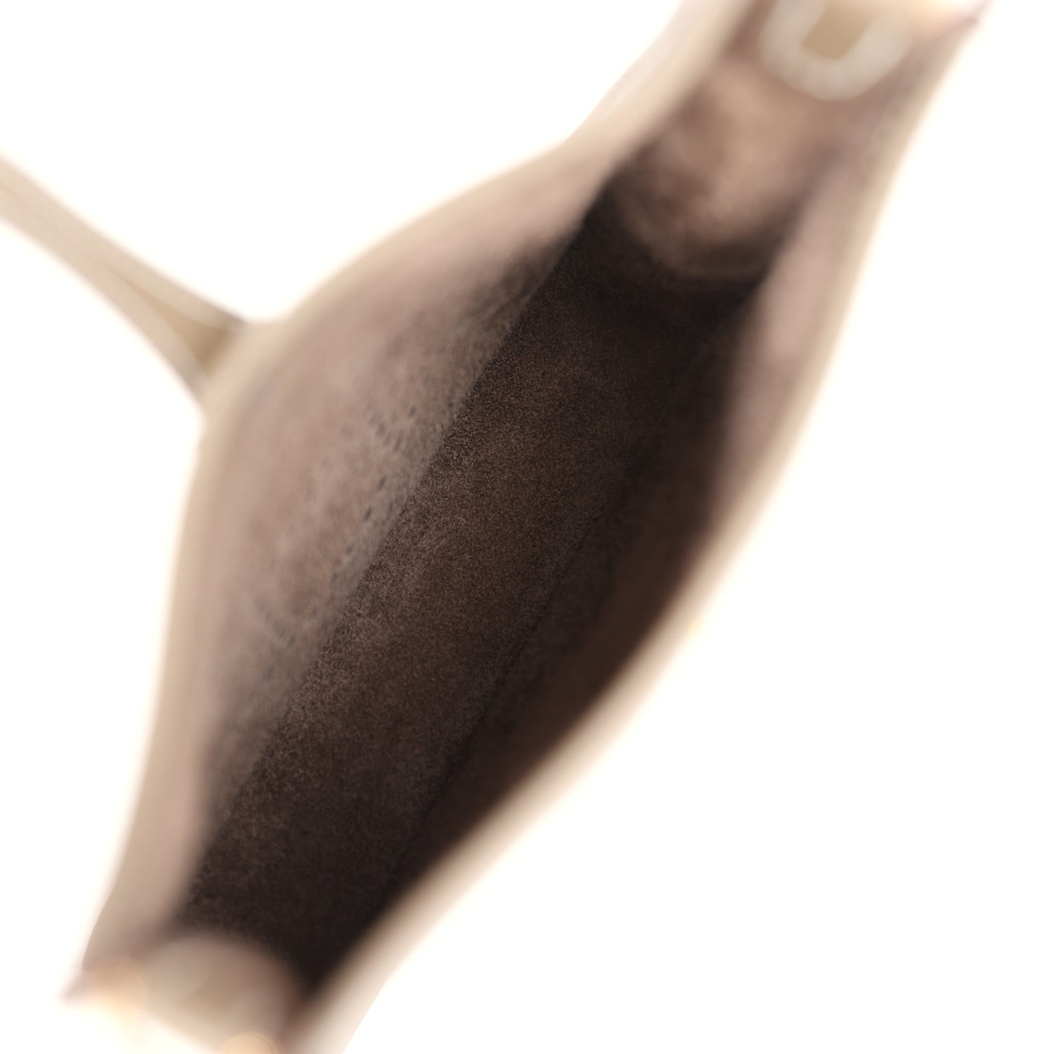 This Evelyne TPM is in Etoupe clemence leather with gold hardware and has contrast stitching, pull tab top closure and a removable canvas and leather shoulder/crossbody strap.