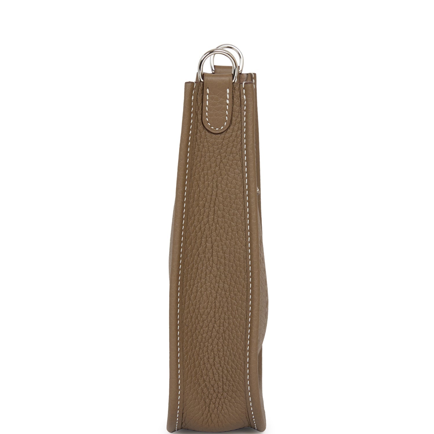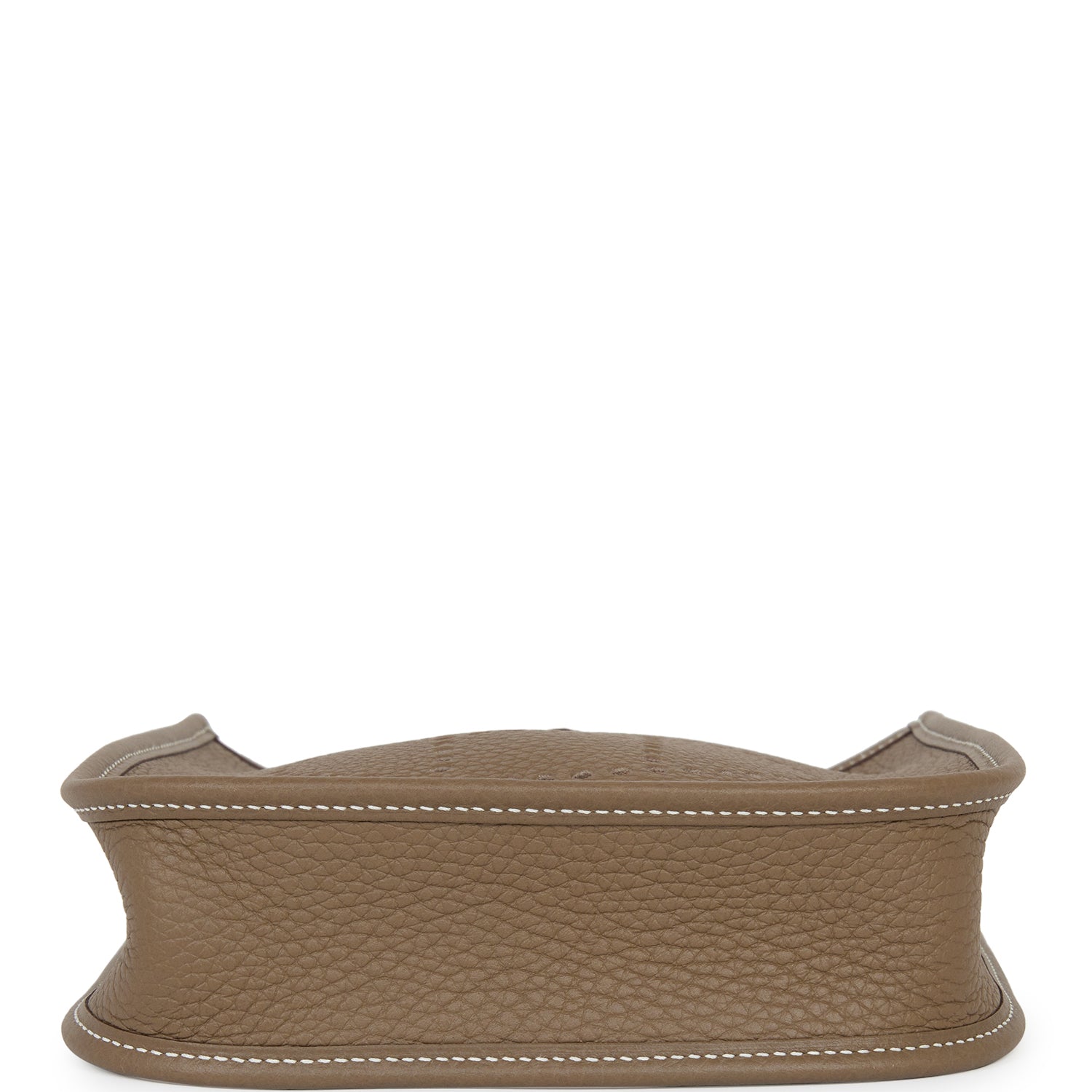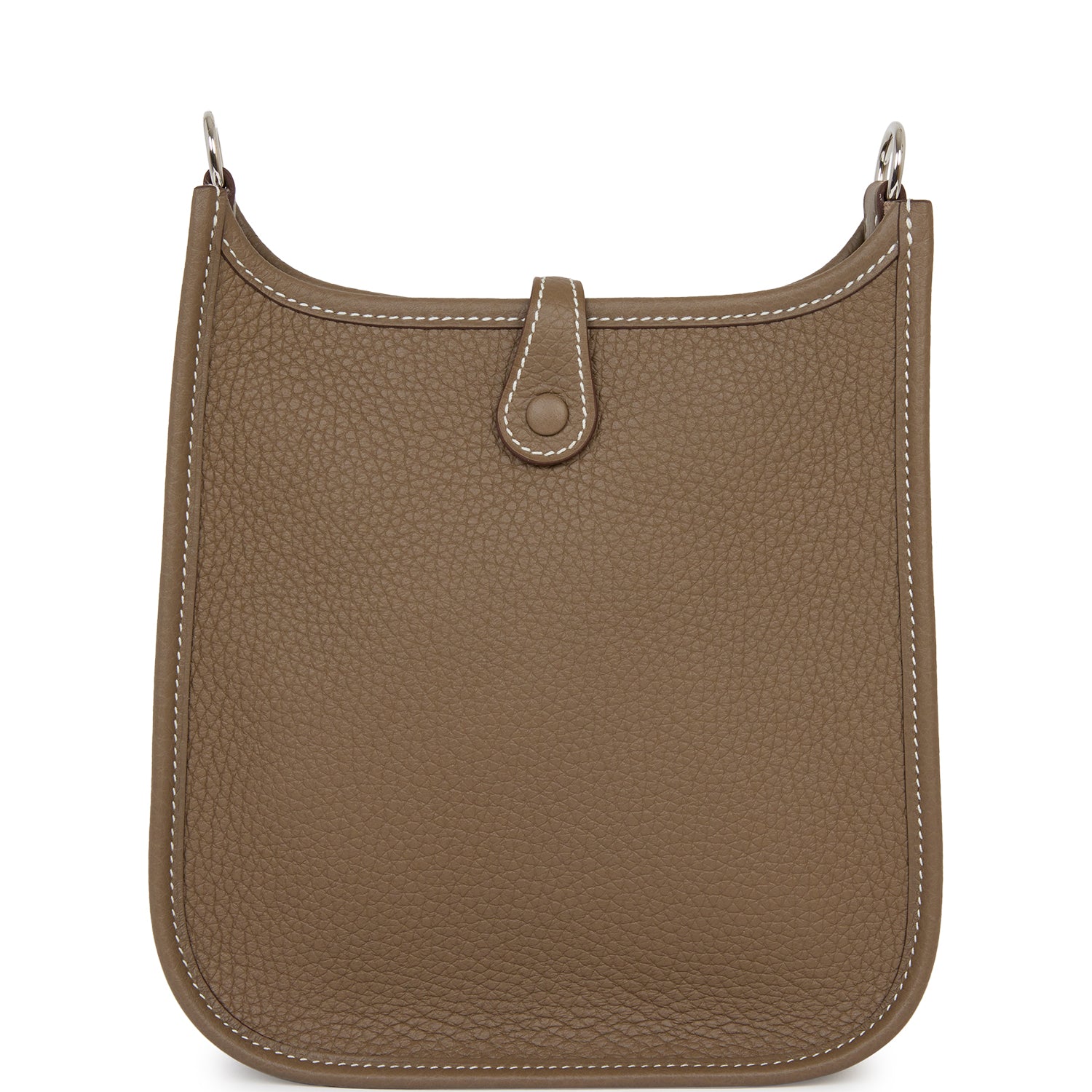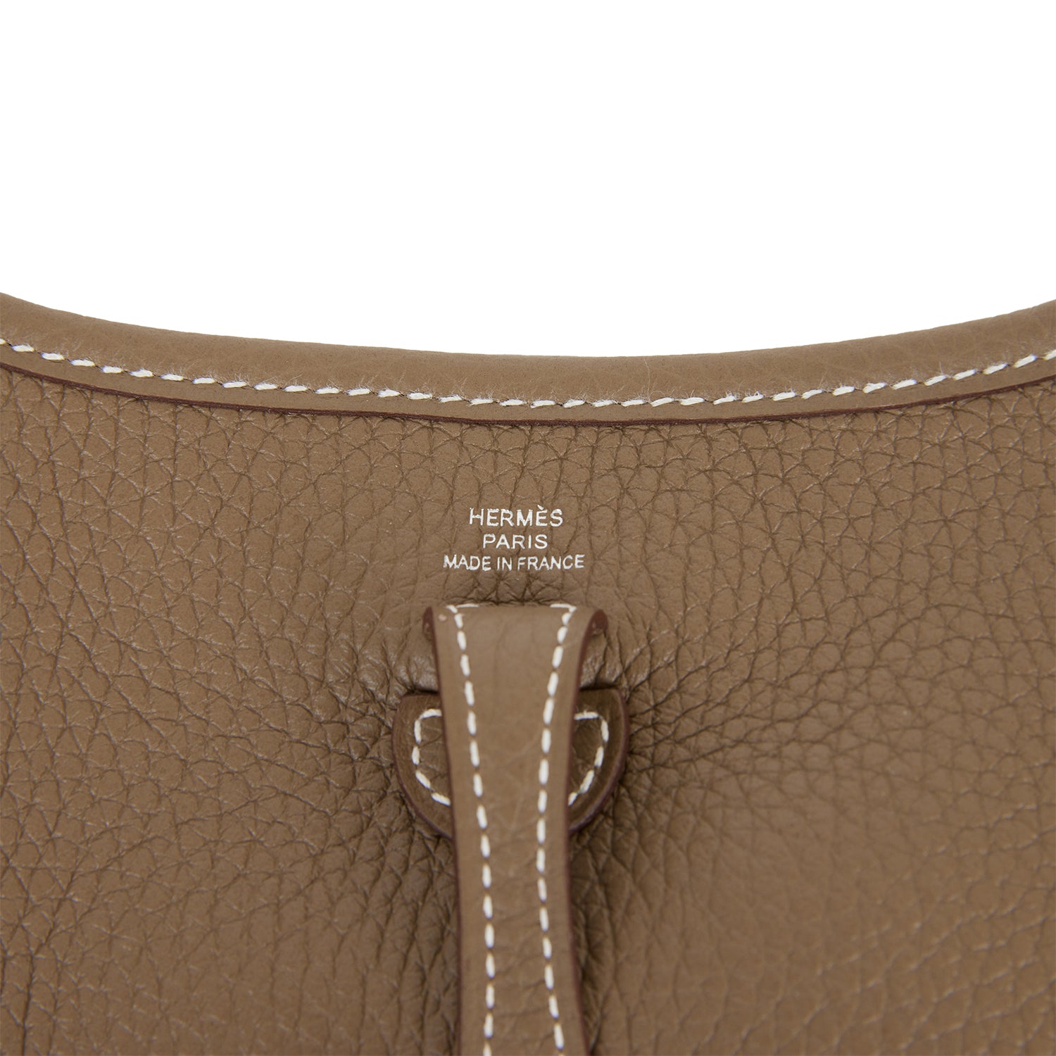 This Evelyne TPM is in Etoupe clemence leather with palladium hardware and has contrast stitching, pull tab top closure and a Bleu Indigo removable canvas and leather shoulder/crossbody strap.