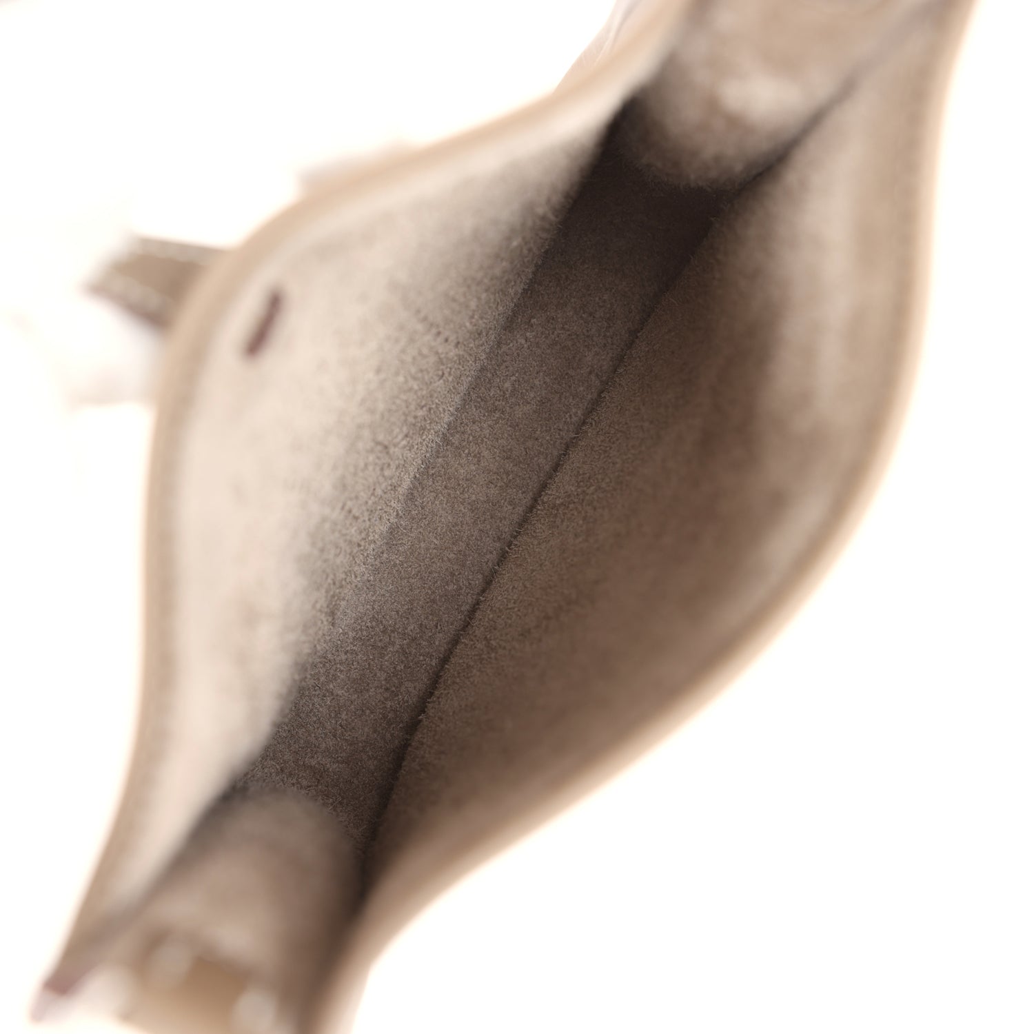 This Evelyne TPM is in Etoupe clemence leather with palladium hardware and has contrast stitching, pull tab top closure and a Bleu Indigo removable canvas and leather shoulder/crossbody strap.