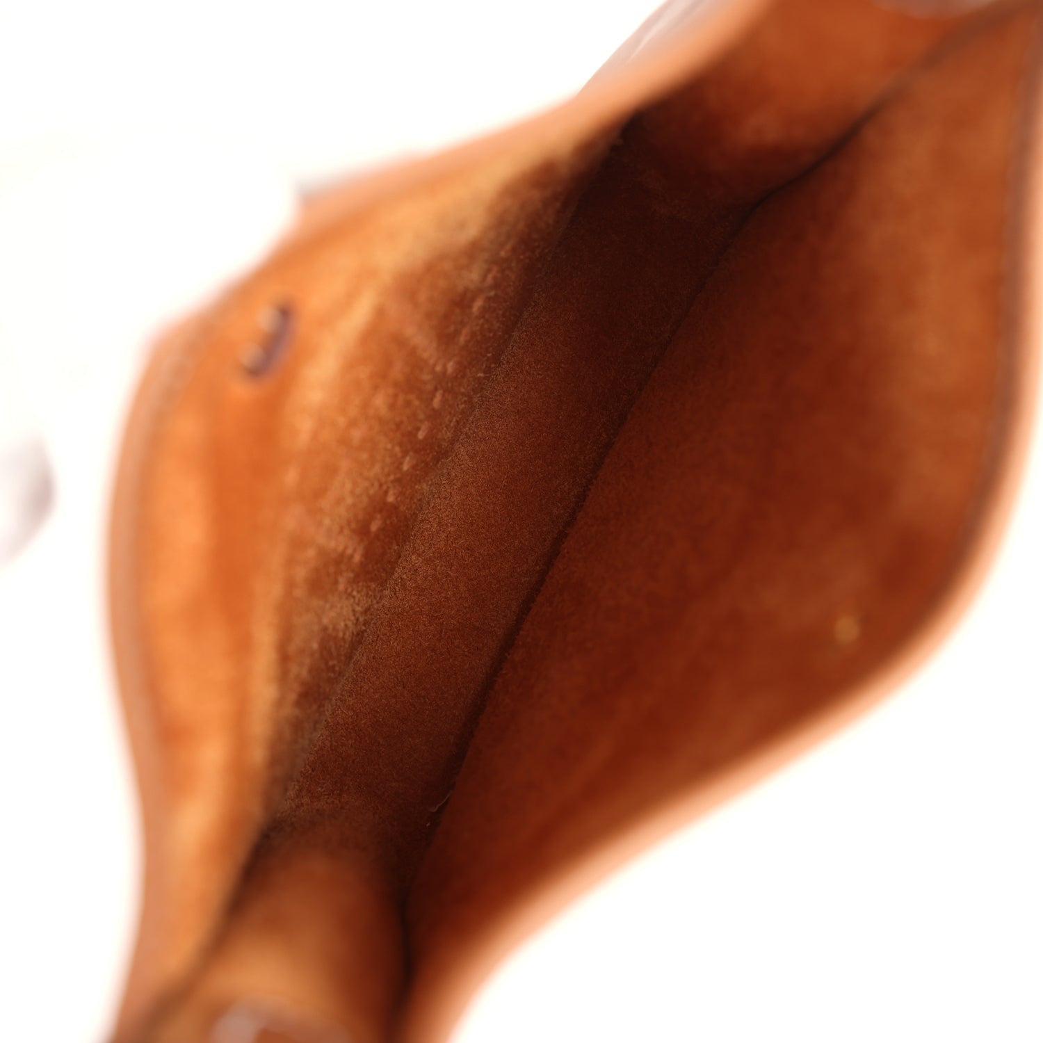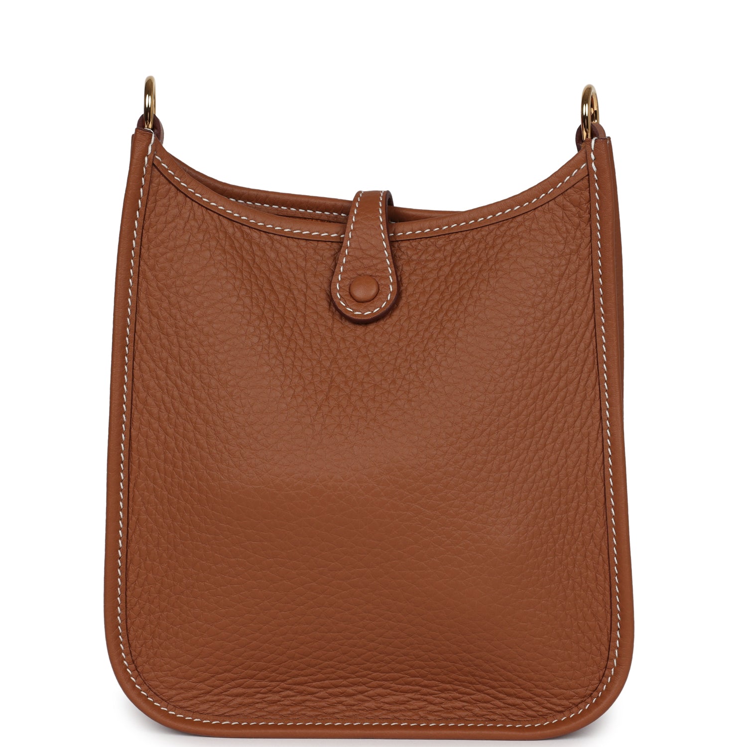 This Evelyne TPM is in Gold clemence leather with gold hardware and features contrast stitching stitching, pull tab top closure and a removable Gold canvas and leather shoulder/crossbody strap.