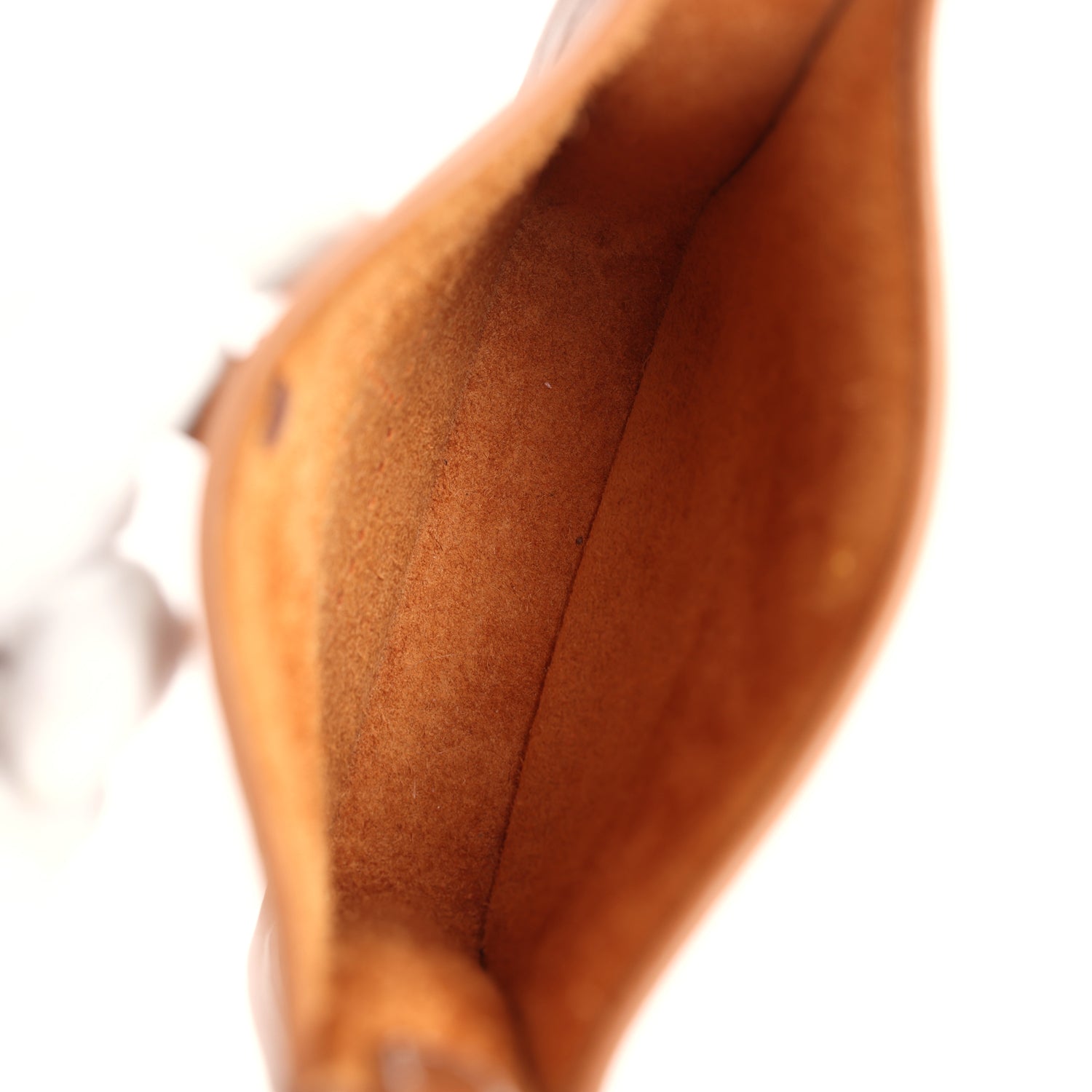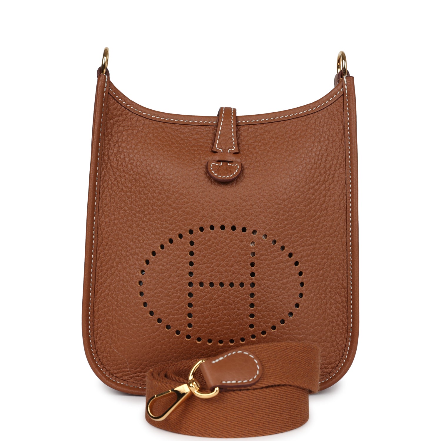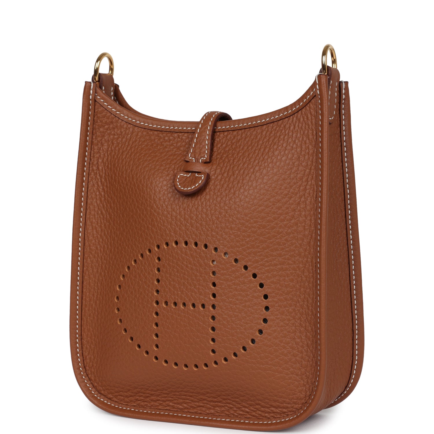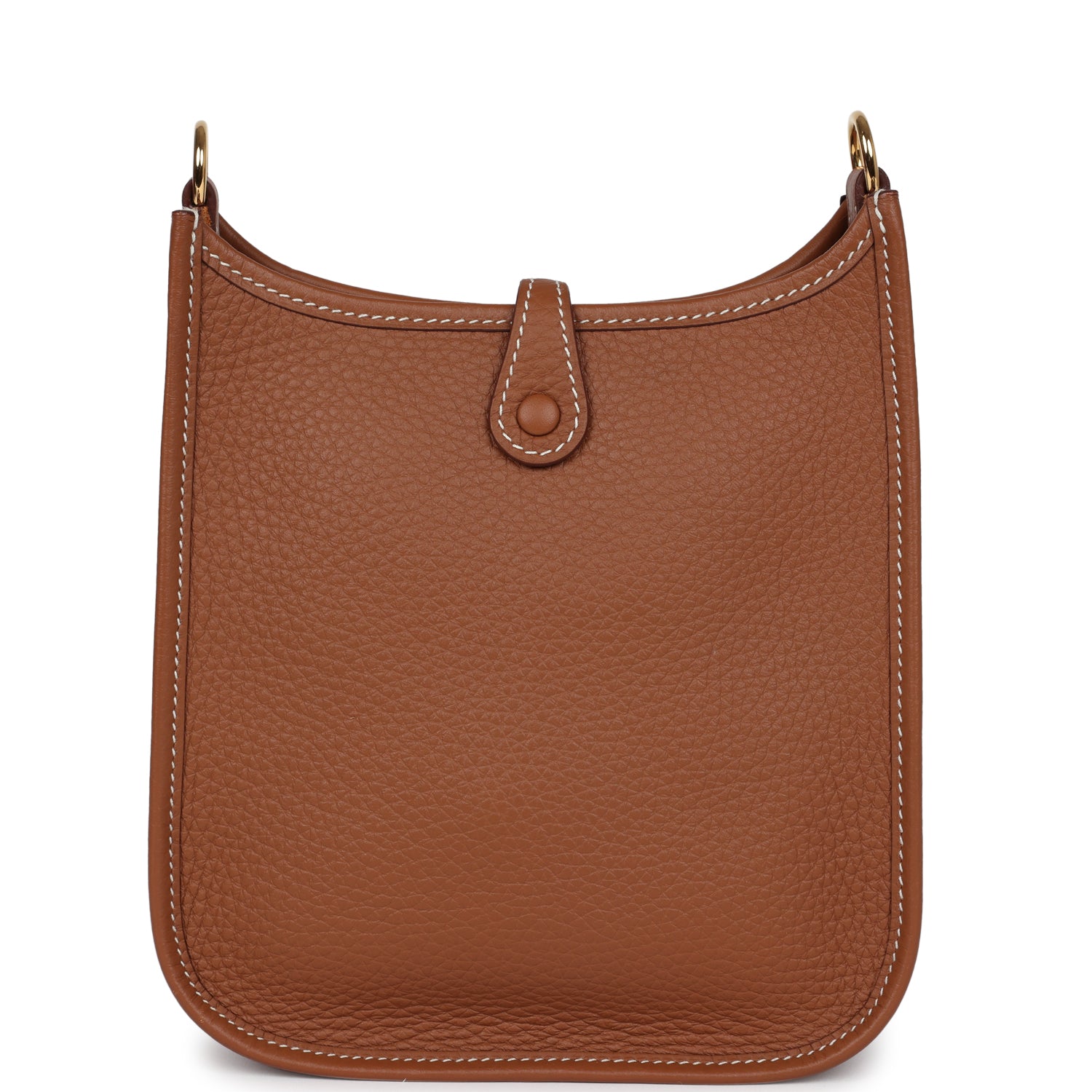 This Evelyne TPM is in Gold clemence leather with gold hardware and features contrast stitching stitching, pull tab top closure and a removable Gold canvas and leather shoulder/crossbody strap.