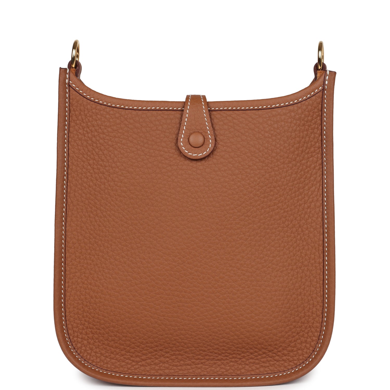 This Evelyne TPM is in Gold clemence leather with gold hardware and features contrast stitching stitching, pull tab top closure and a removable Gold canvas and leather shoulder/crossbody strap.
