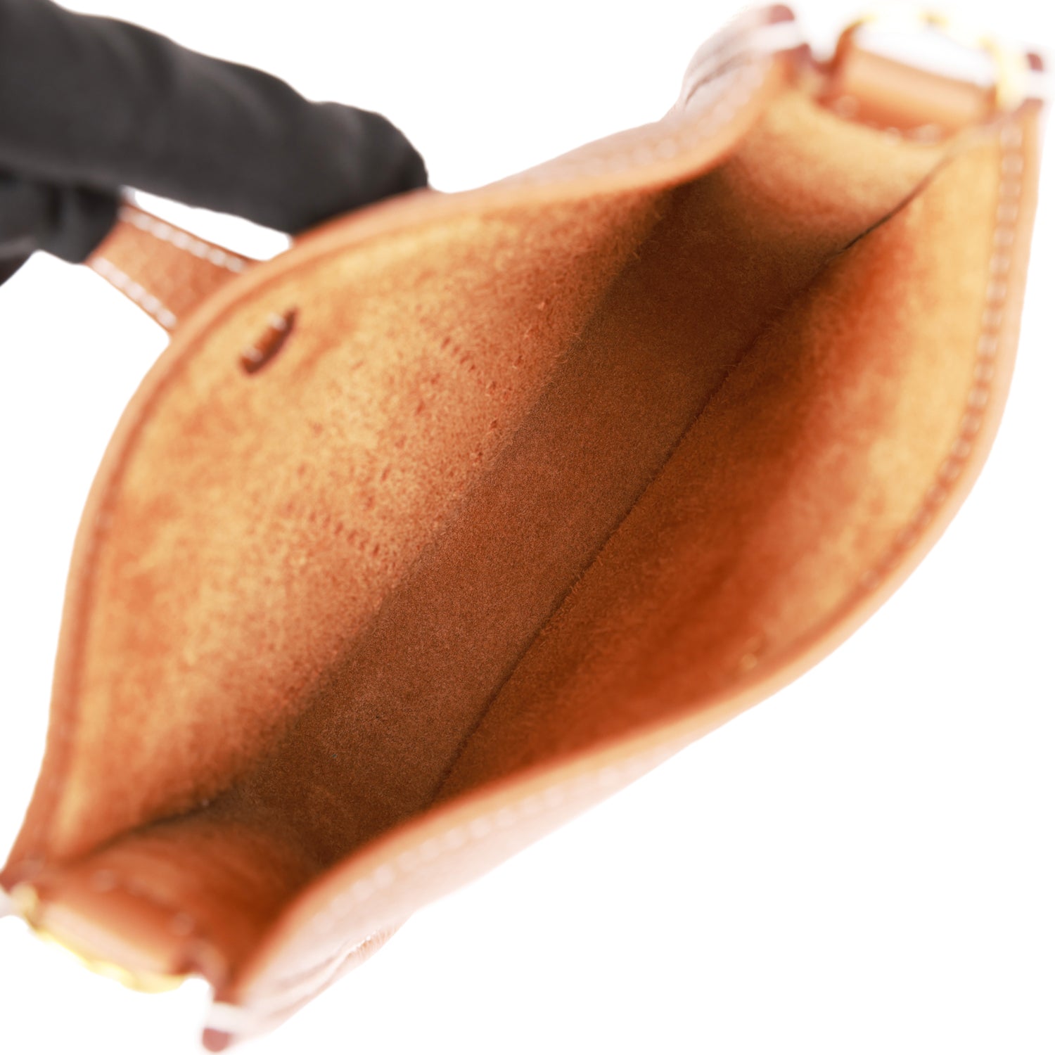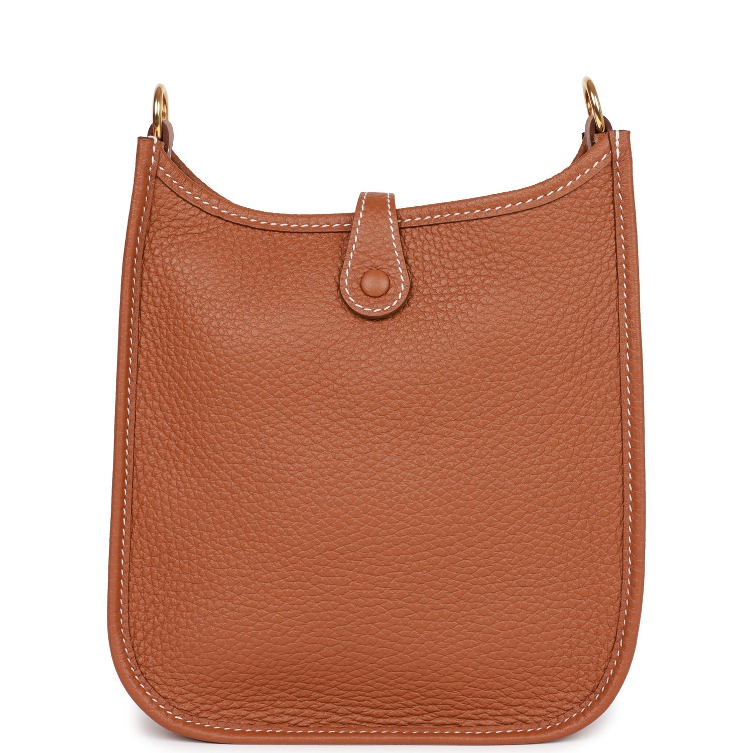 This Evelyne is in Gold clemence leather with gold hardware and has contrast stitching, pull tab top closure and a gold removable canvas and leather shoulder/crossbody strap.