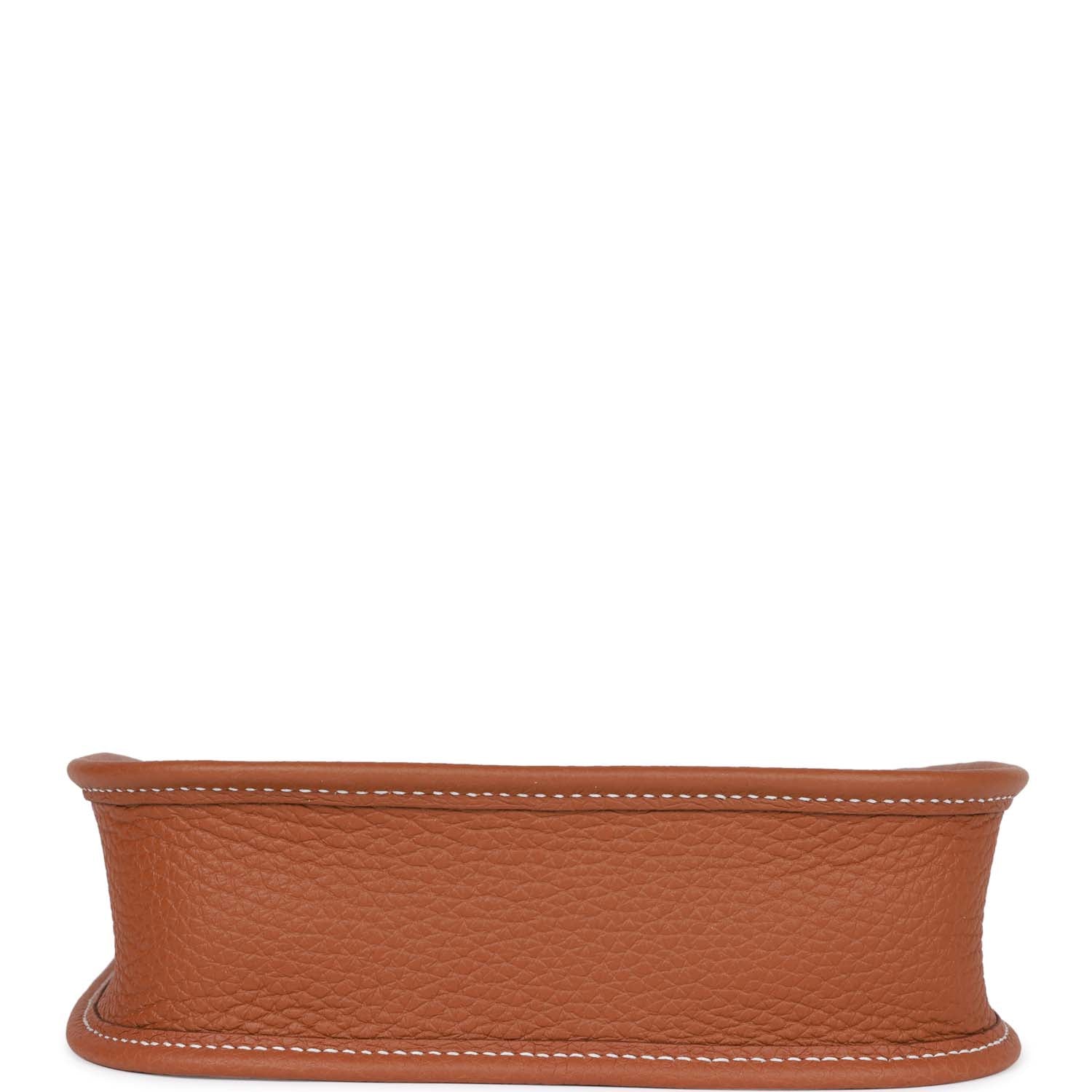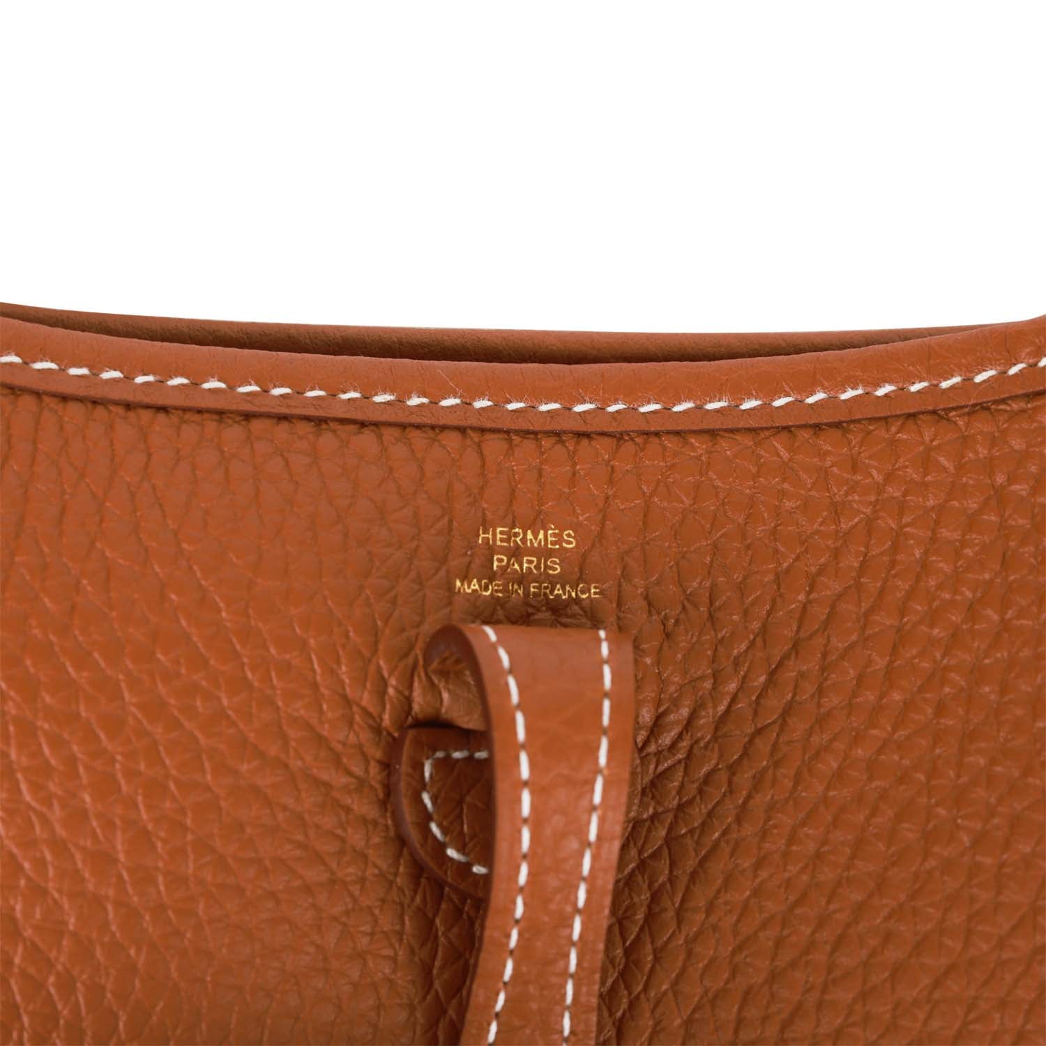 This Evelyne TPM messenger bag is in Gold clemence leather with gold hardware, a large perforated H in circle at the front, pull tab top snap closure and removable gold canvas and leather shoulder/crossbody strap