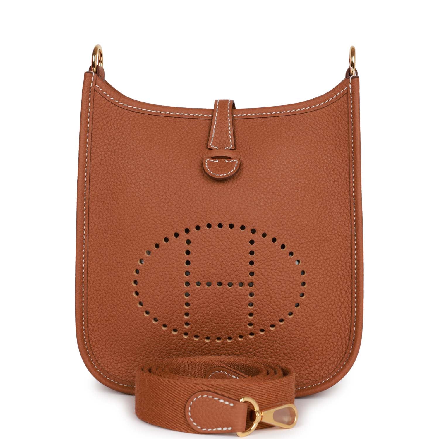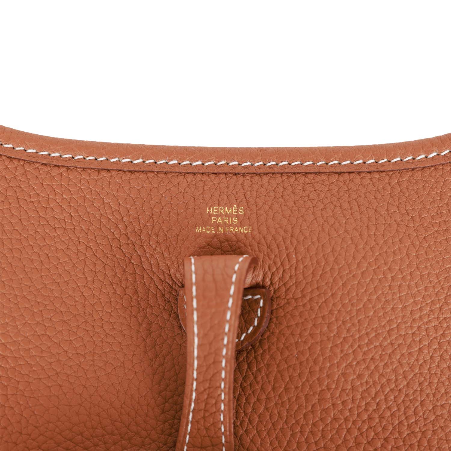 This Evelyne is in Gold clemence leather with gold hardware and has contrast stitching, pull tab top closure and a gold removable canvas and leather shoulder/crossbody strap.