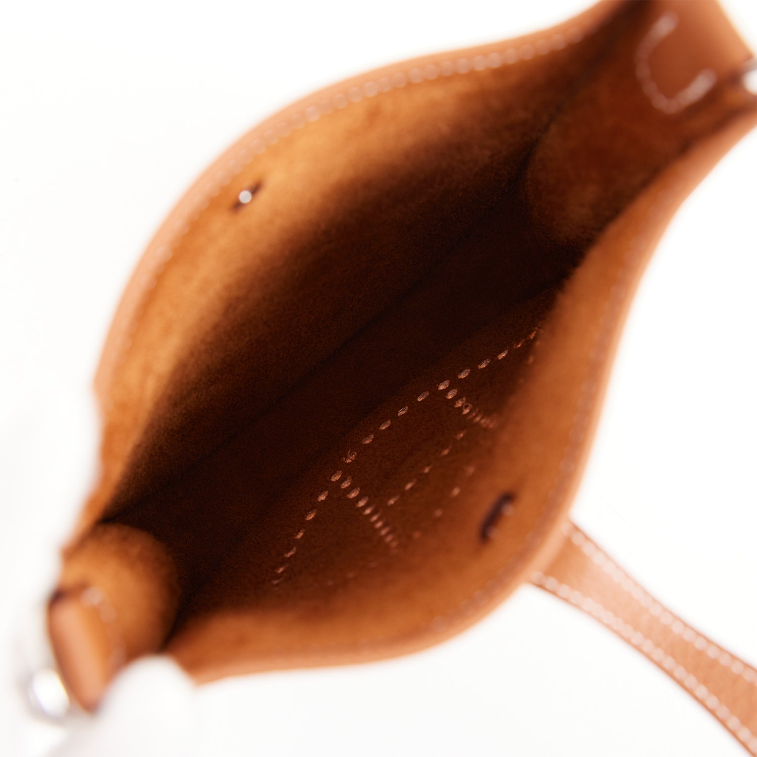 This Evelyne is in Gold clemence leather with palladium hardware and has contrast stitching, pull tab top closure and a gold removable canvas and leather shoulder/crossbody strap.