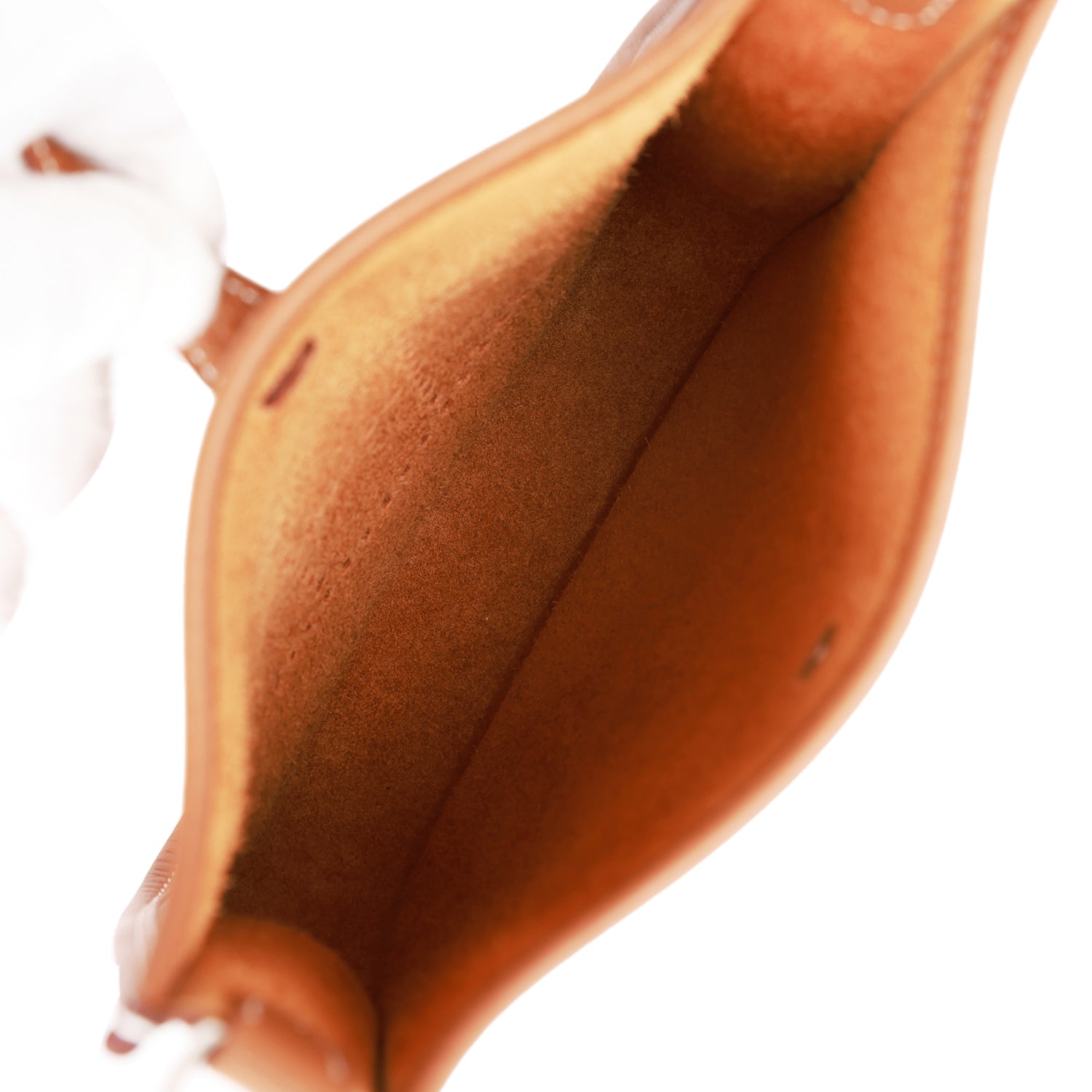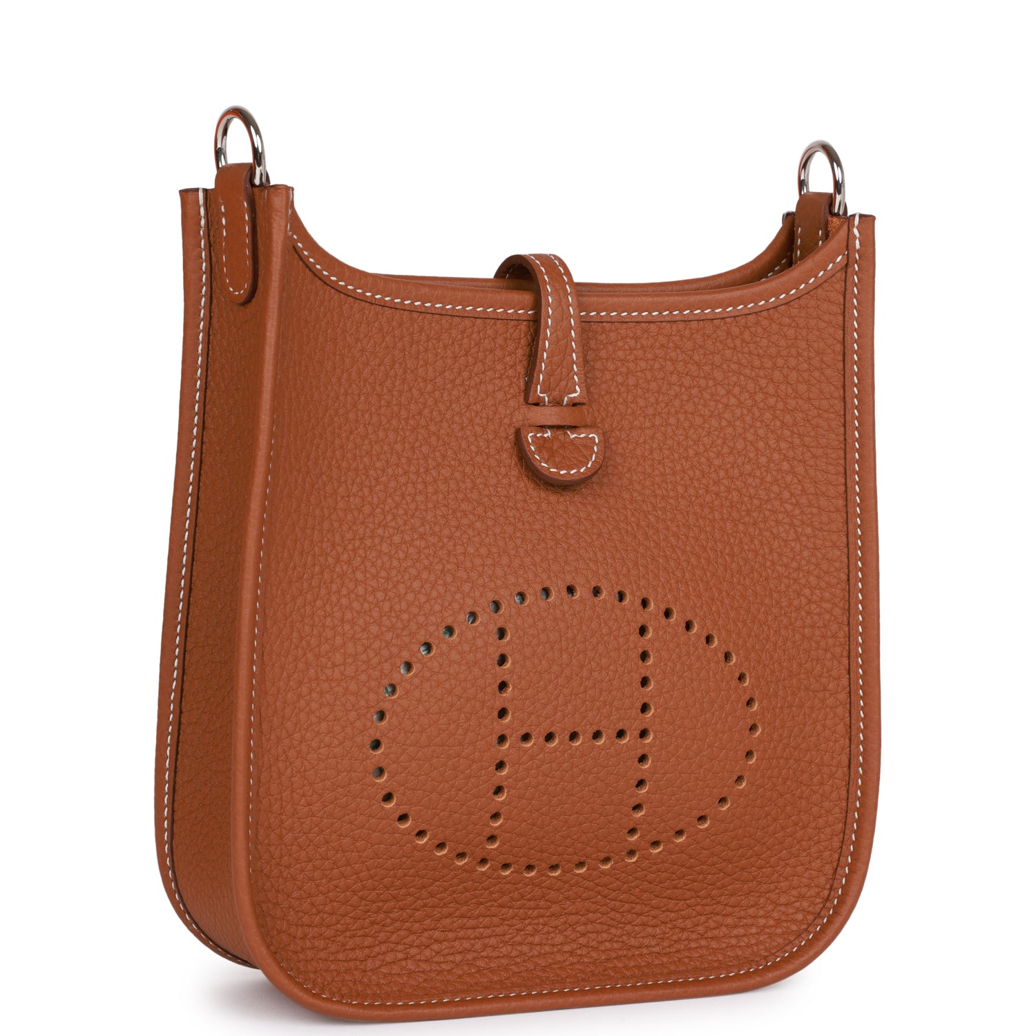 This Evelyne is in Gold clemence leather with palladium hardware and has contrast stitching, pull tab top closure and a gold removable canvas and leather shoulder/crossbody strap.