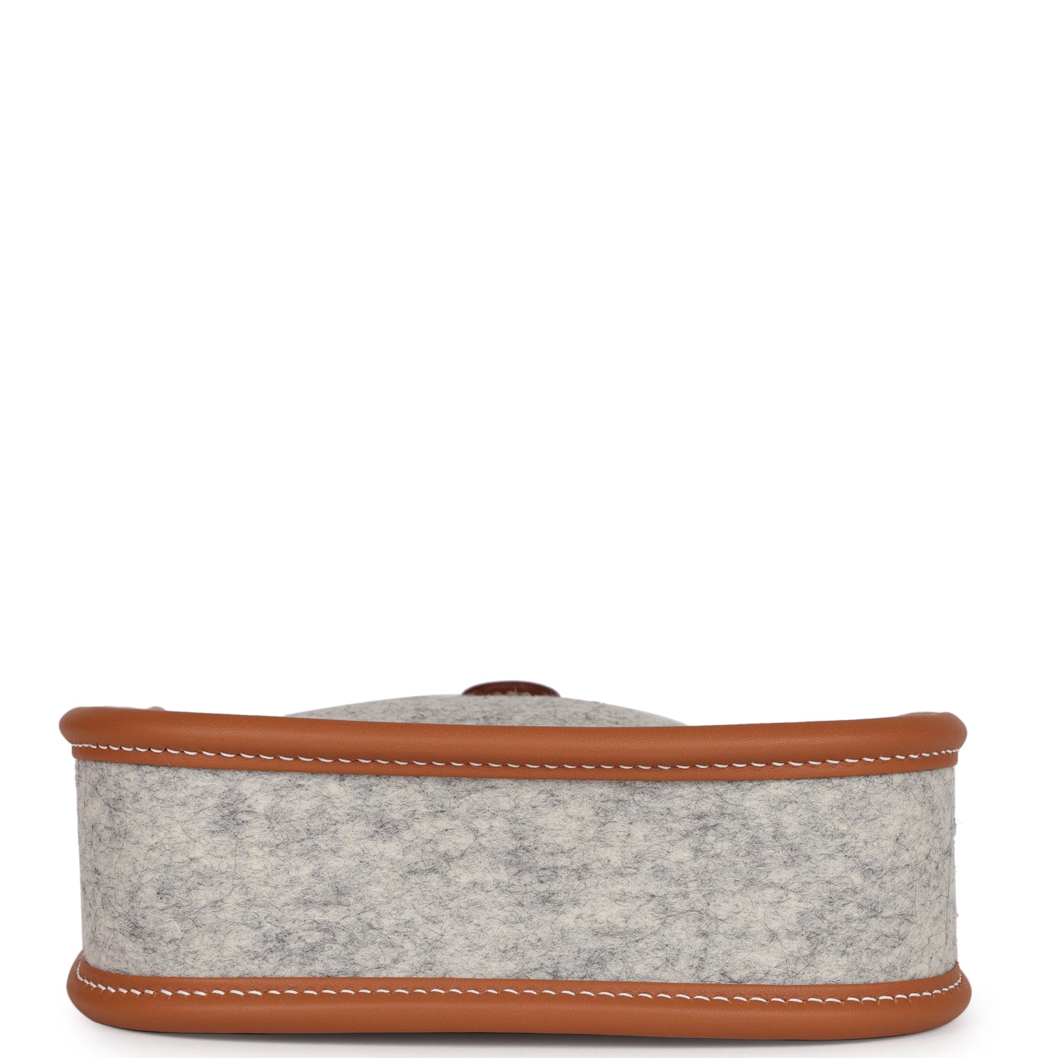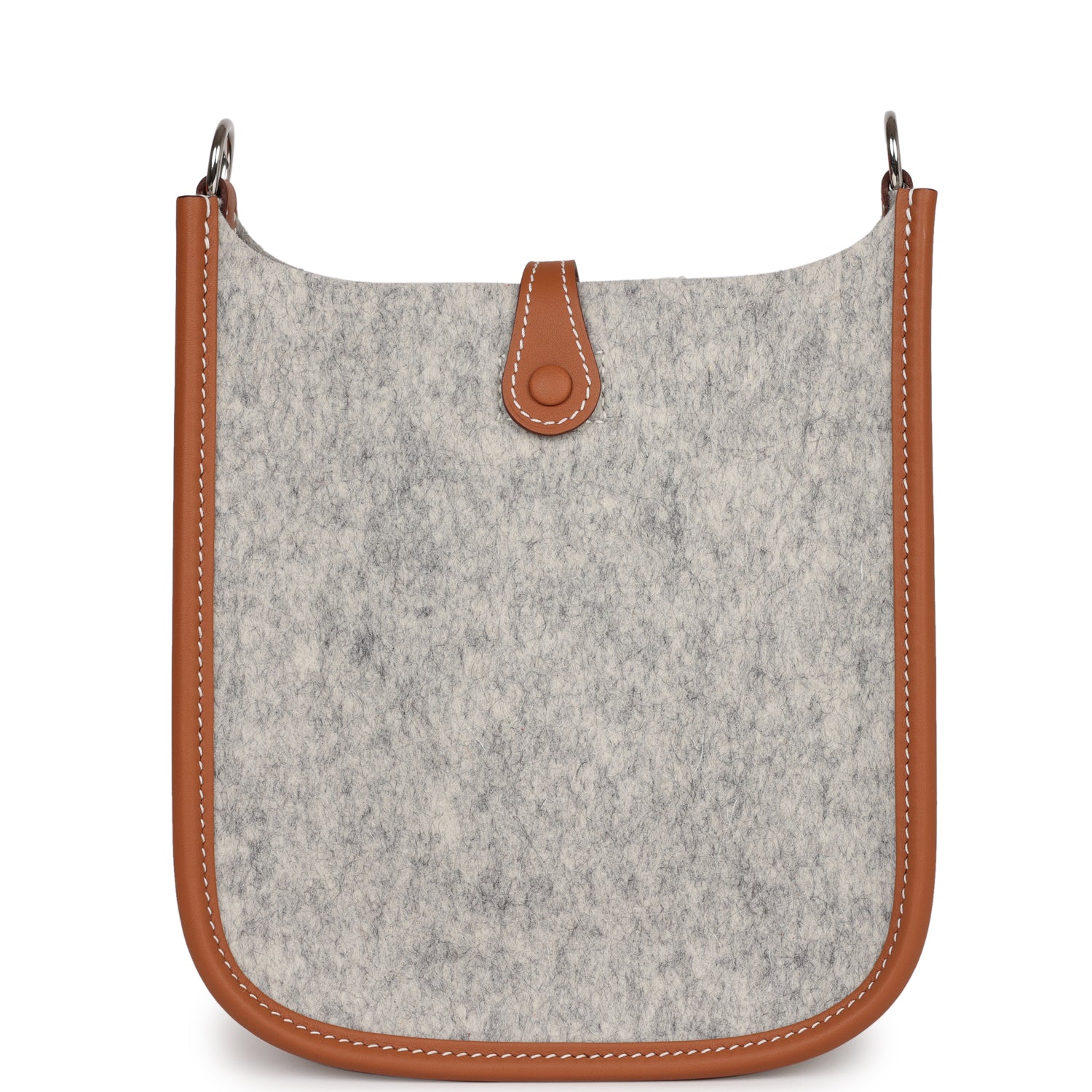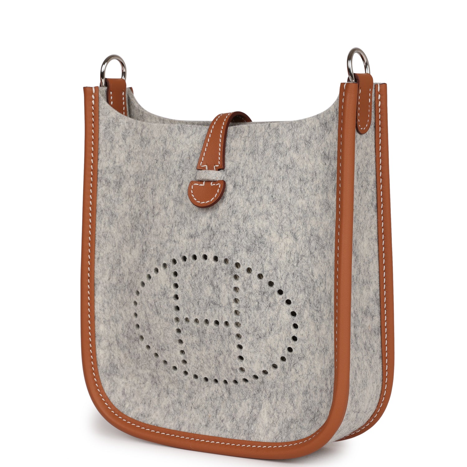 This Evelyne TPM is in Gris Clair wooly felt and Gold swift leather with palladium hardware and features contrast stitching stitching, pull tab top closure and a gold removable canvas and leather shoulder/crossbody strap.