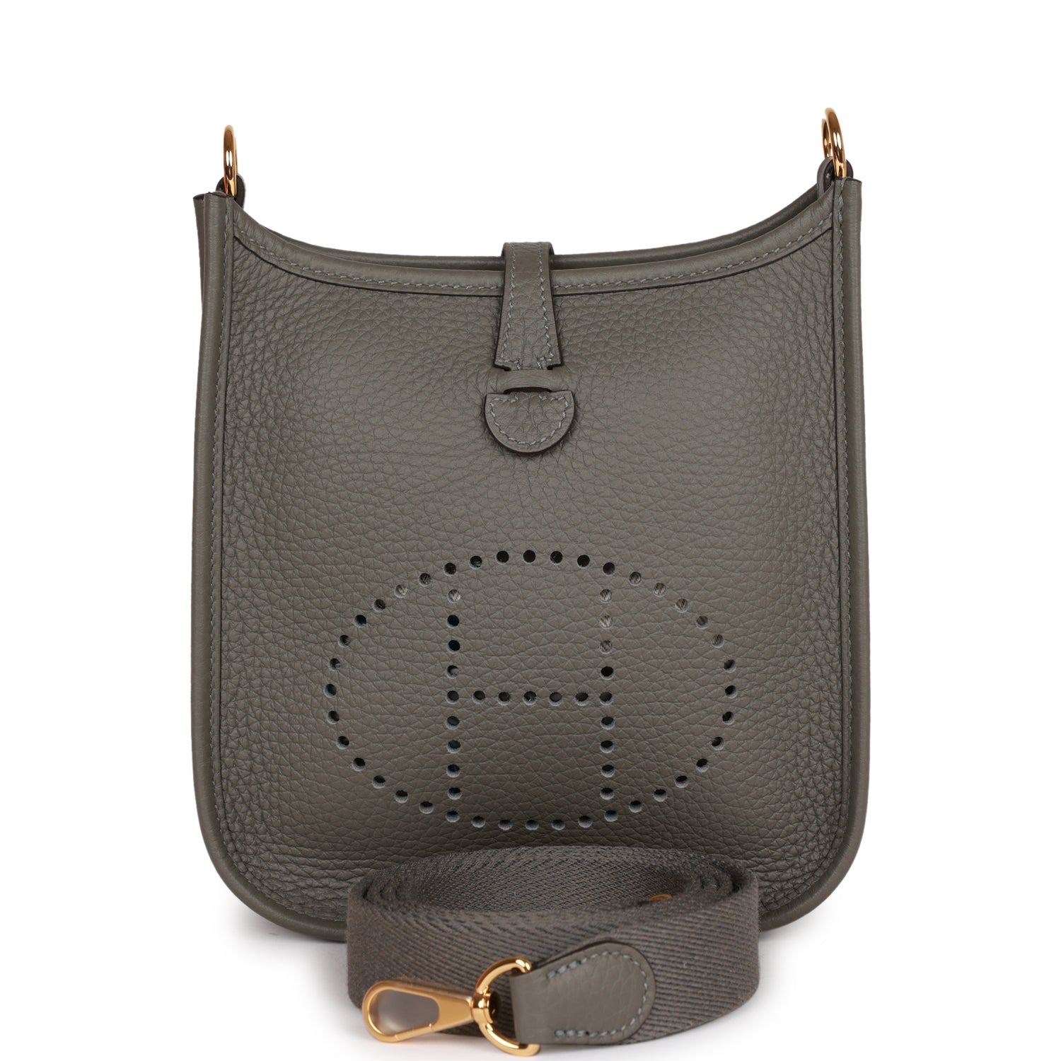 This Evelyne TPM is in Gris Meyer clemence leather with gold hardware and features tonal stitching stitching, pull tab top closure and a Gris Meyer removable canvas and leather shoulder/crossbody strap.