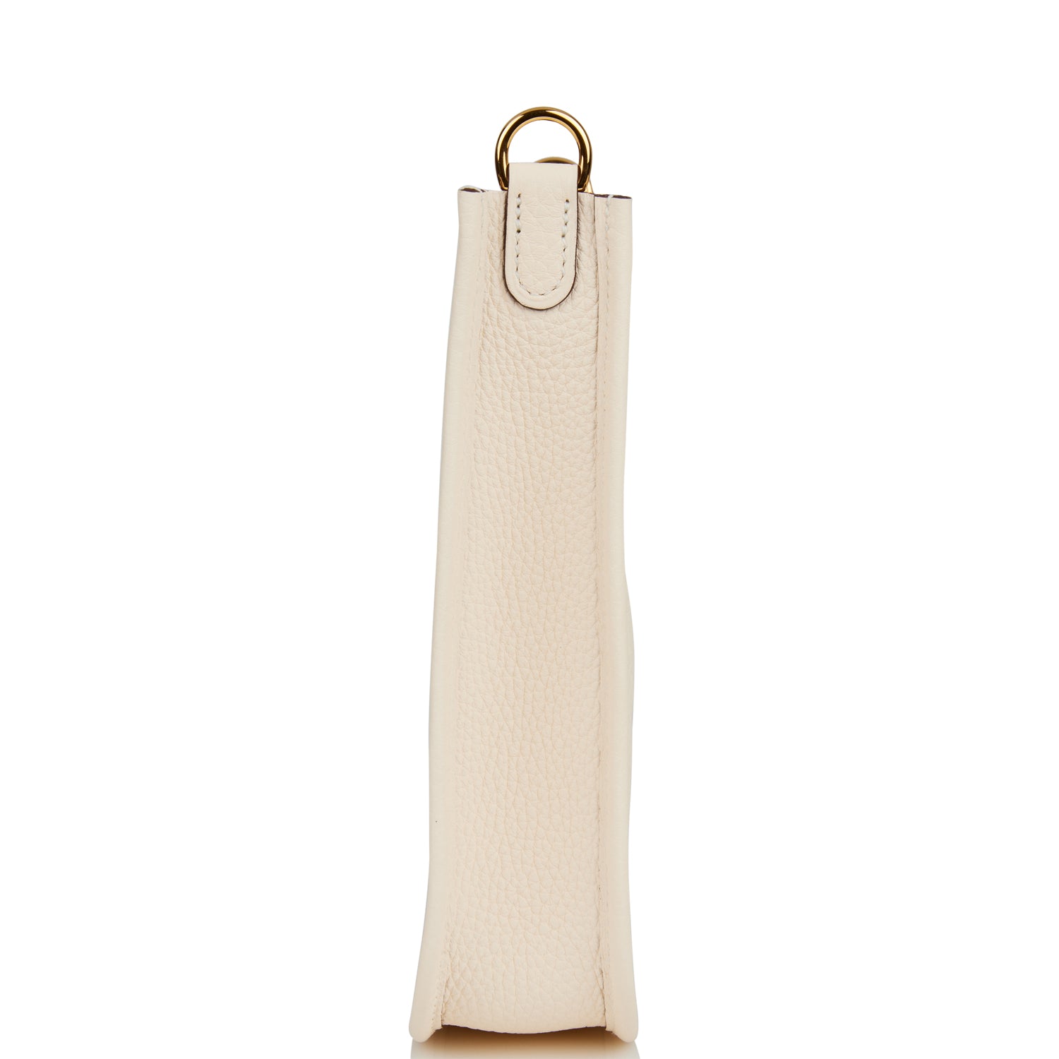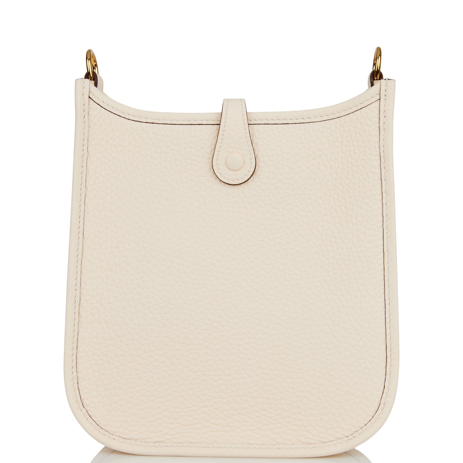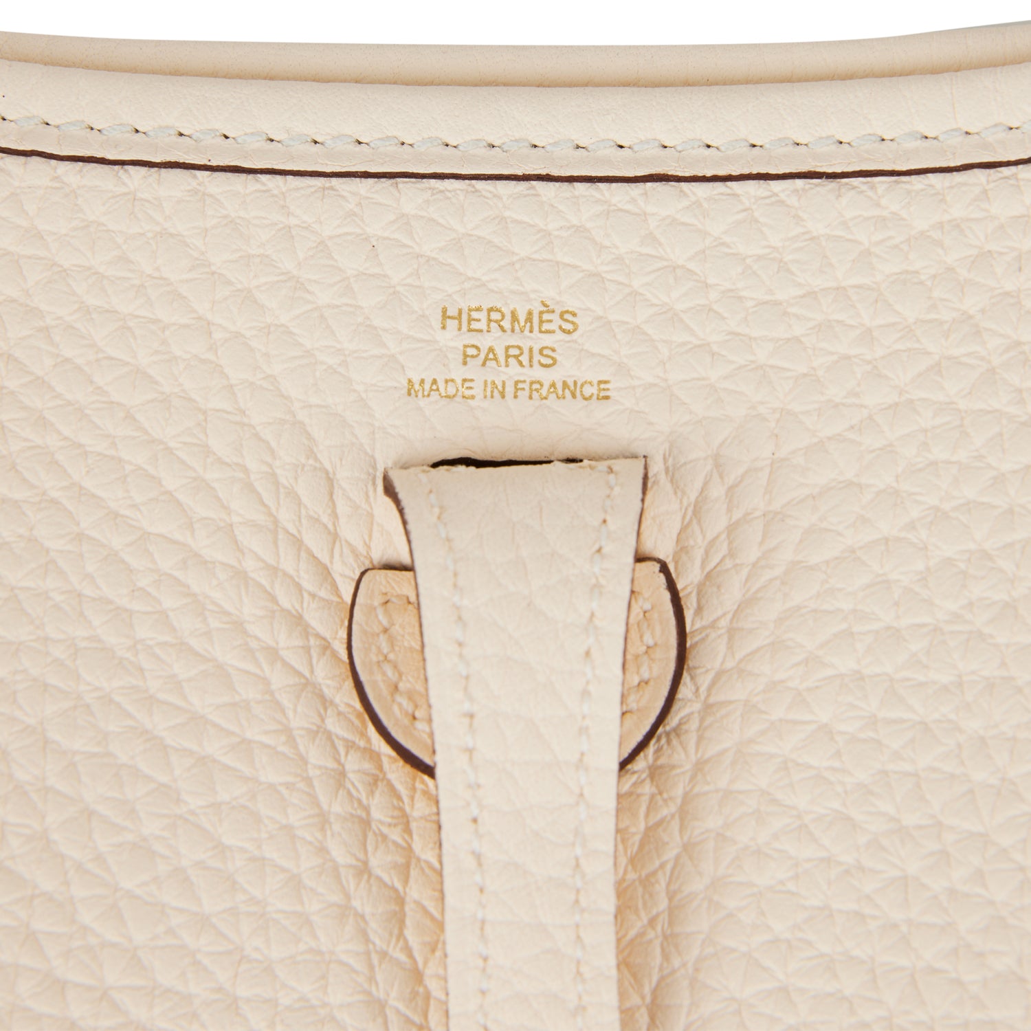 This Evelyne TPM is in Nata clemence leather with gold hardware and features tonal stitching stitching, pull tab top closure and a white removable canvas and leather shoulder/crossbody strap.