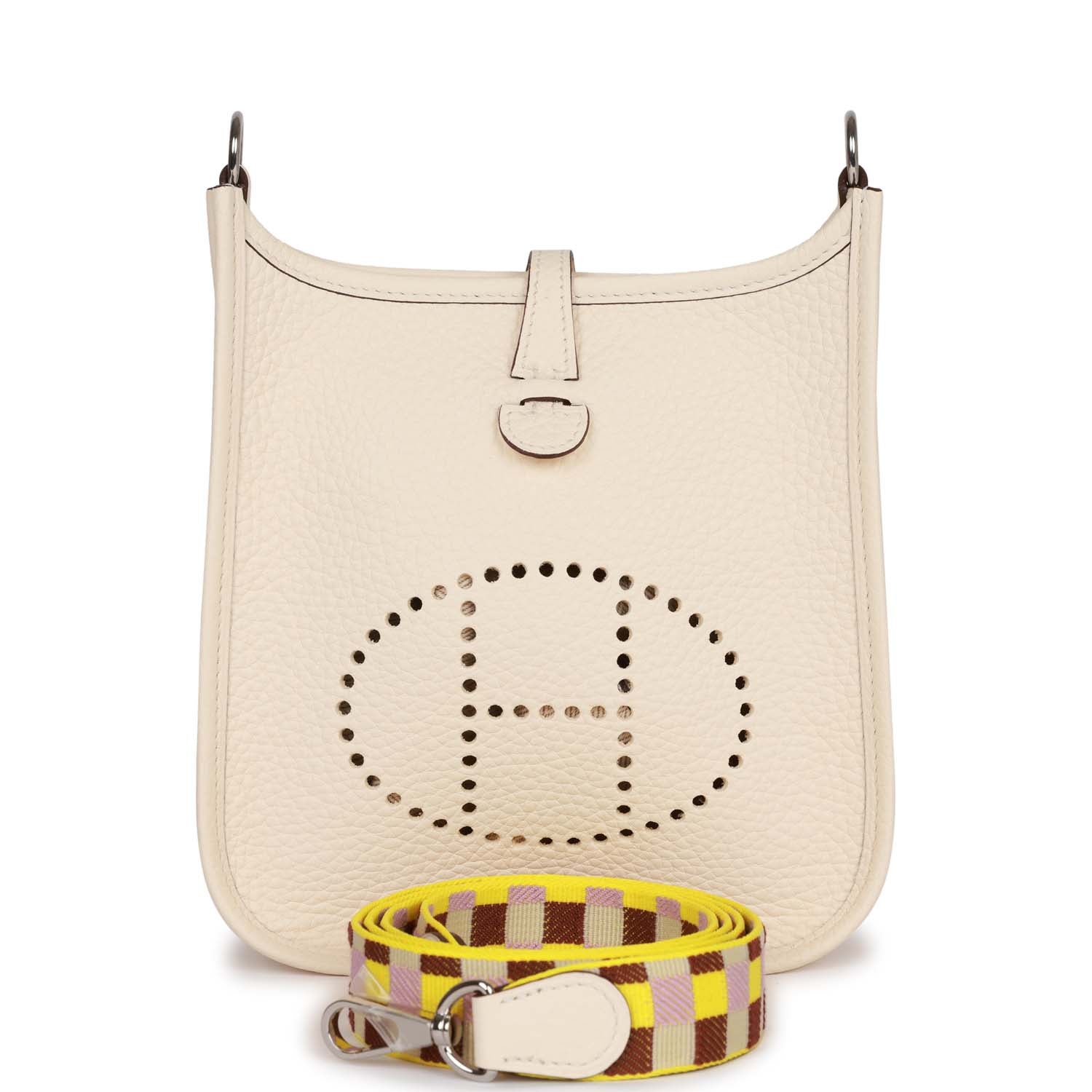 This Evelyne TPM is in Nata clemence leather with palladium hardware and features tonal stitching stitching, pull tab top closure and a detachable quadrille canvas and leather shoulder/crossbody strap.