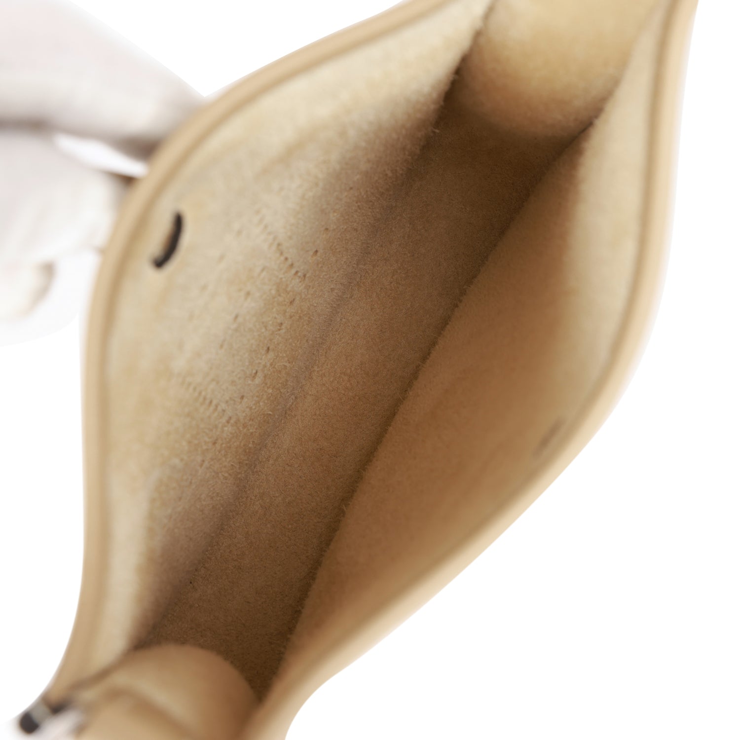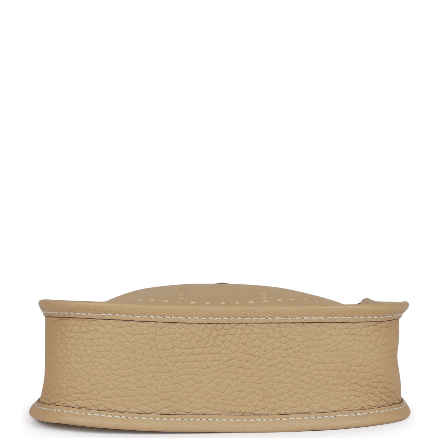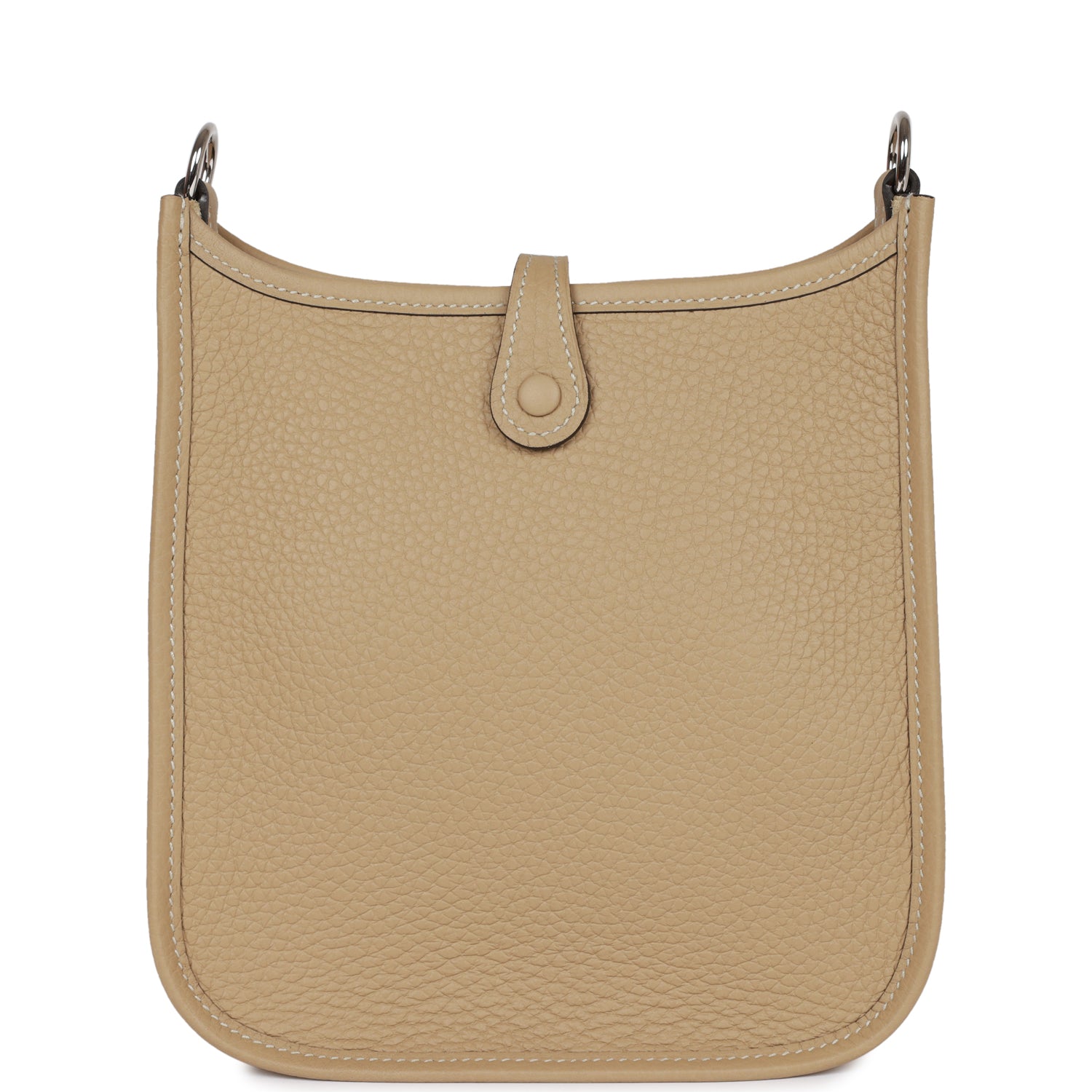 This Evelyne TPM is in Trench clemence leather with palladium hardware and features tonal stitching stitching, pull tab top closure and a Trench removable canvas and leather shoulder/crossbody strap.