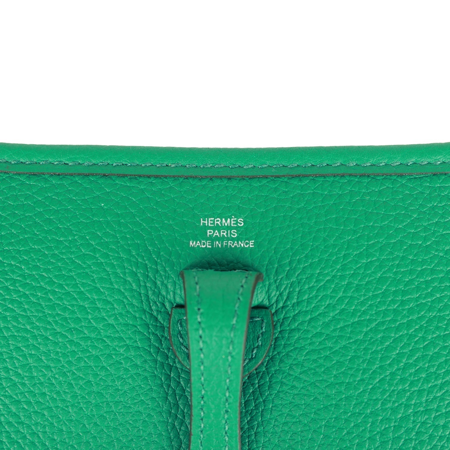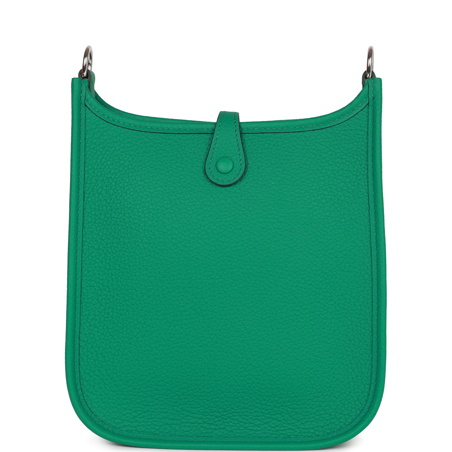 This Evelyne TPM is in Vert Jade maurice leather with palladium hardware and features tonal stitching stitching, pull tab top closure and a Vert Jade removable canvas and leather shoulder/crossbody strap.