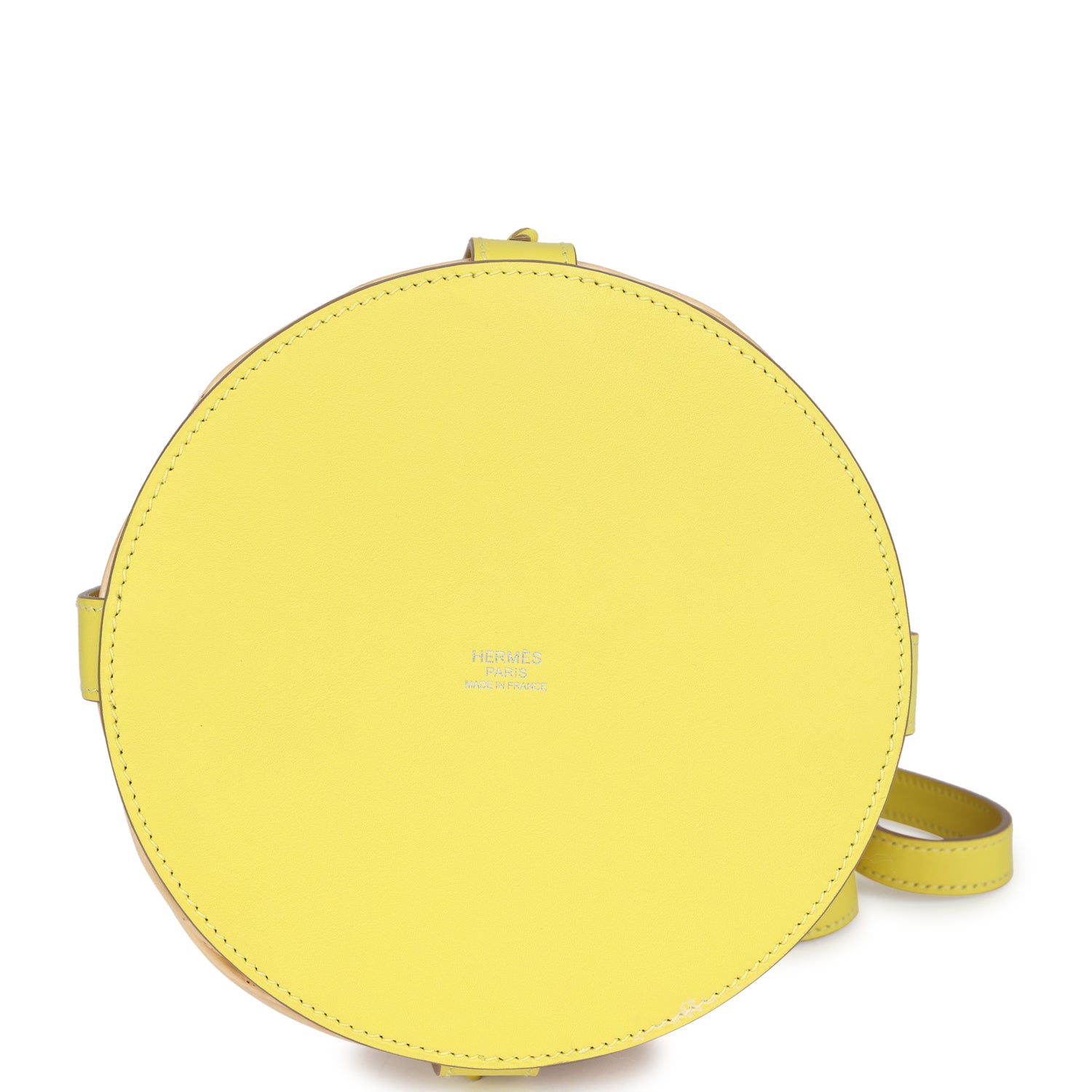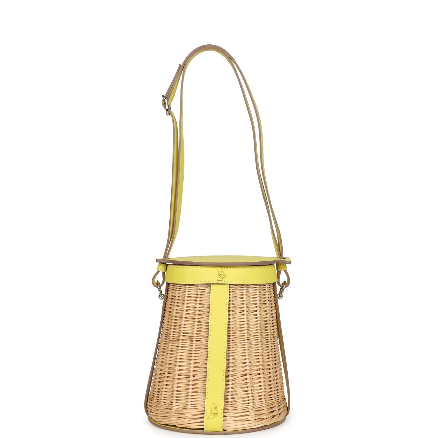 This limited edition Farming Picnic Bag is in Naturel Osier Wicker and Lime swift leather with palladium hardware, featuring tonal stitching, lime swift trimming, flat leather shoulder strap and Lid top closure.
