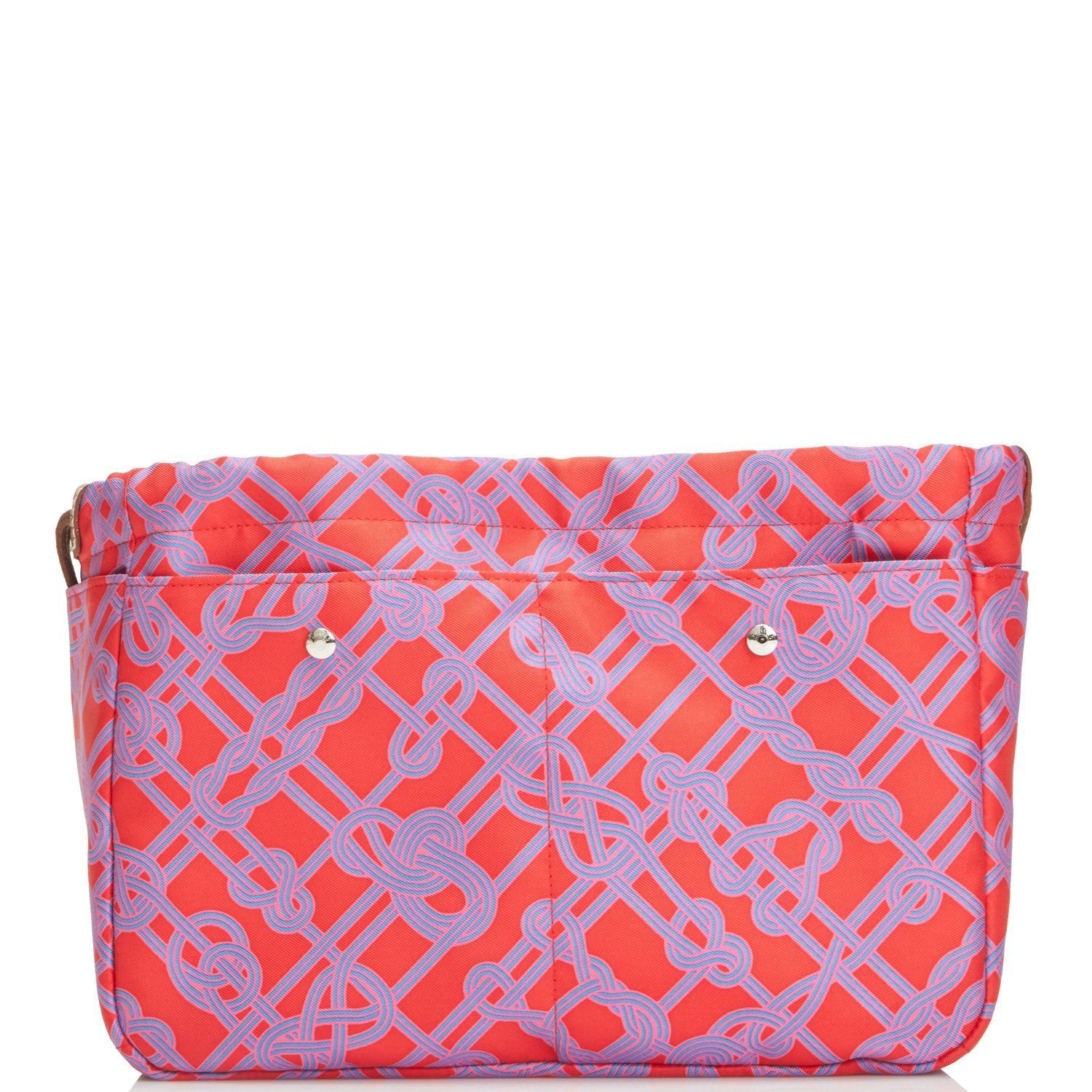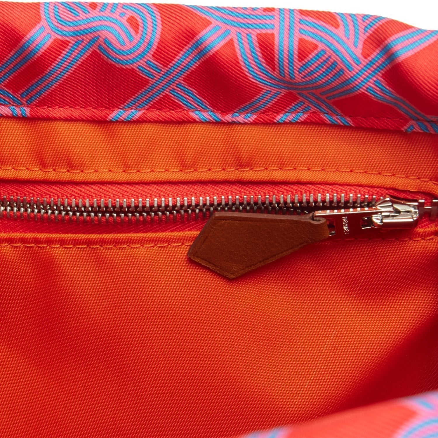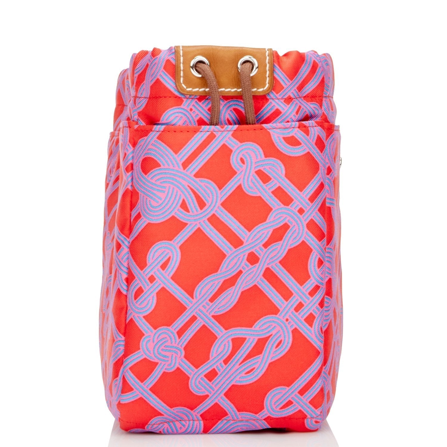 This Fourbi in the 25 size is in Rouge de Coeur Noeud Marin silk and barenia leather with palladium hardware and has various exterior pockets with two cinch cords on each side.