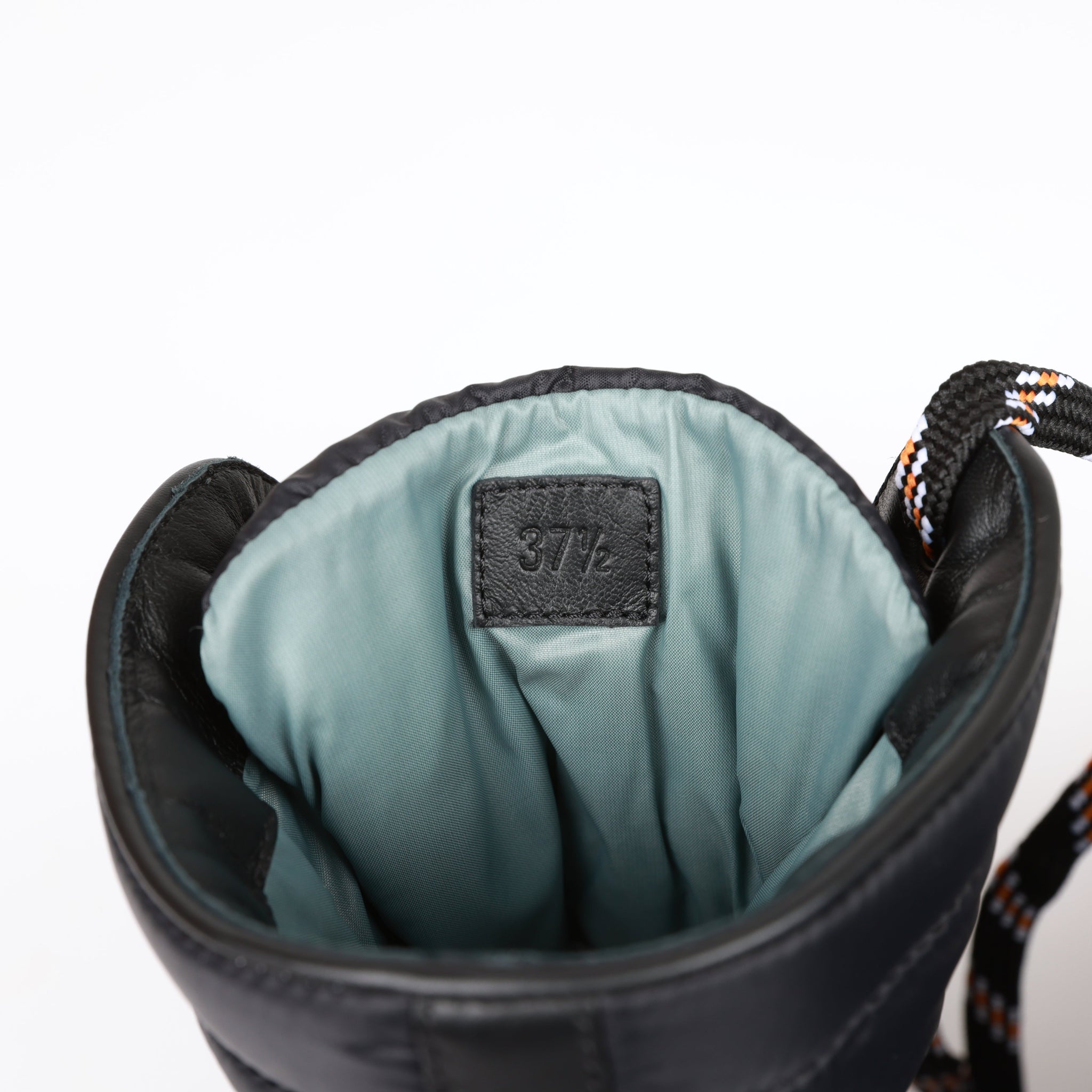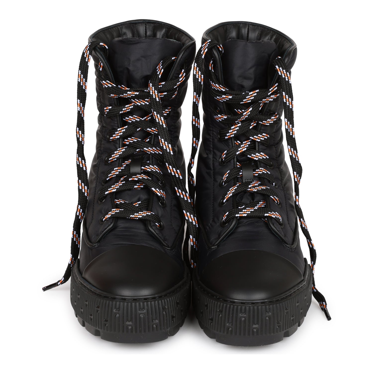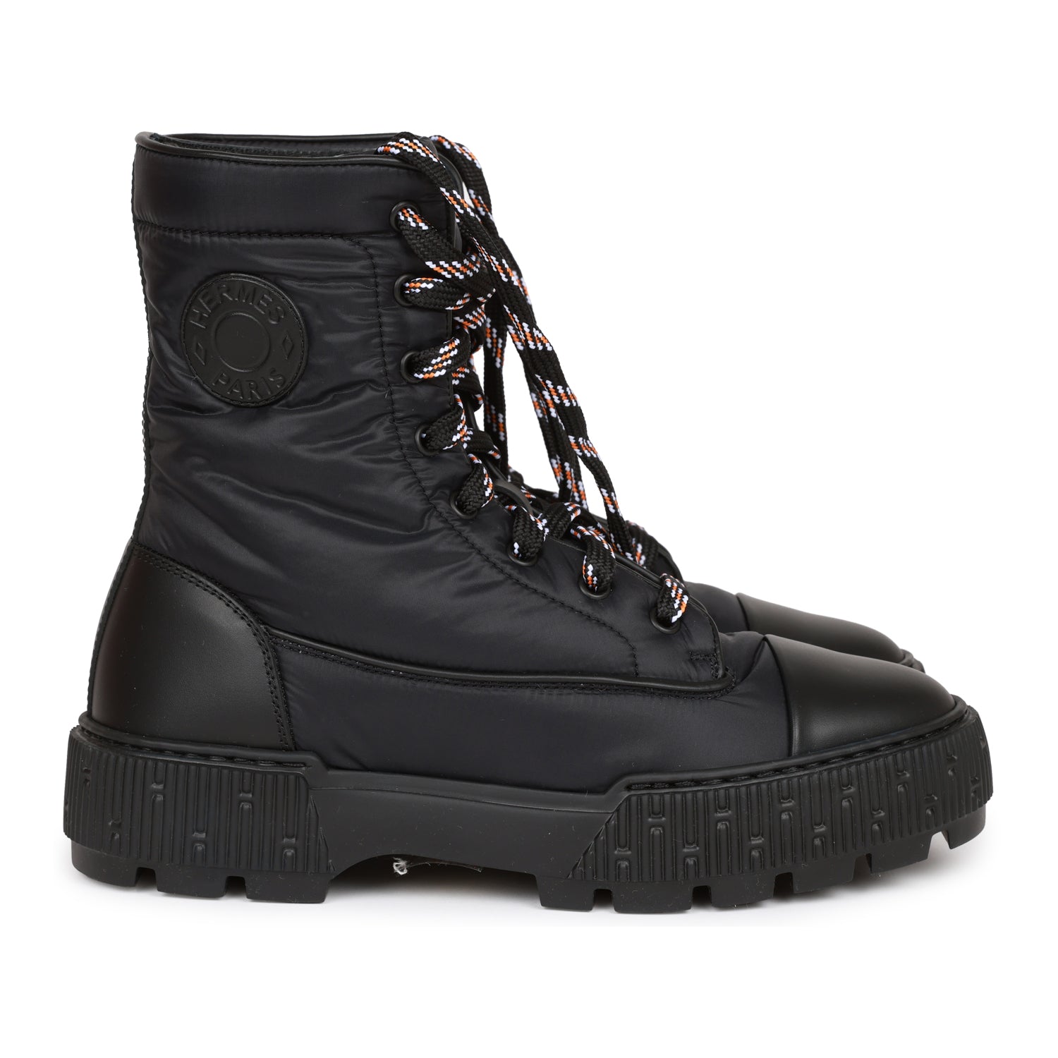 This pair of Fresh Ankle Boots are in black calfskin and black parachute fabric with tonal stitching and feature a rubber sole.