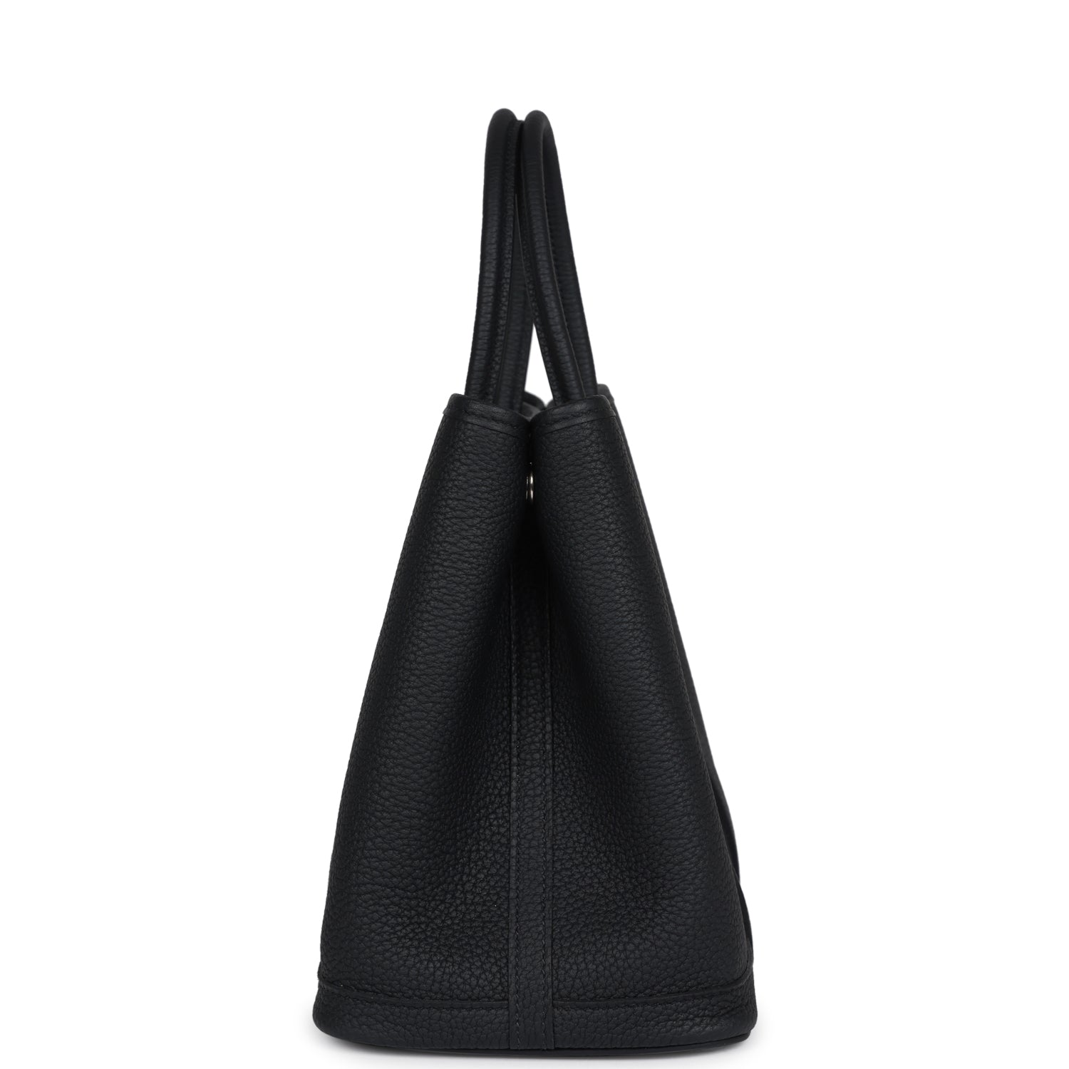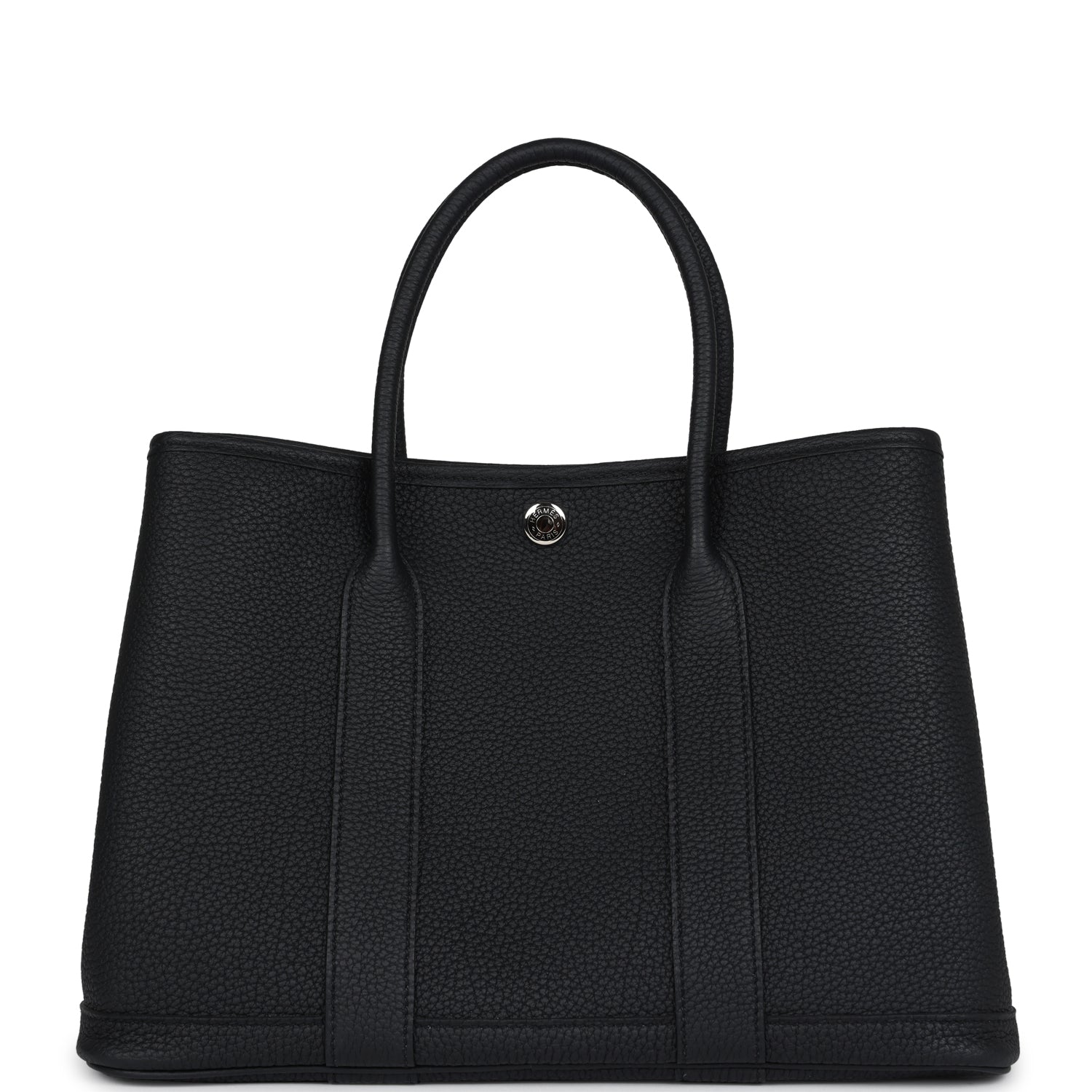 This Garden Party is of Black negonda leather with palladium hardware and classic toile herringbone lining, tonal stitching, one engraved palladium front snap closure with two snap closures on side to adjust bag width. This bag features two top handles and flat interior zipper pocket with engraved zipper pull.