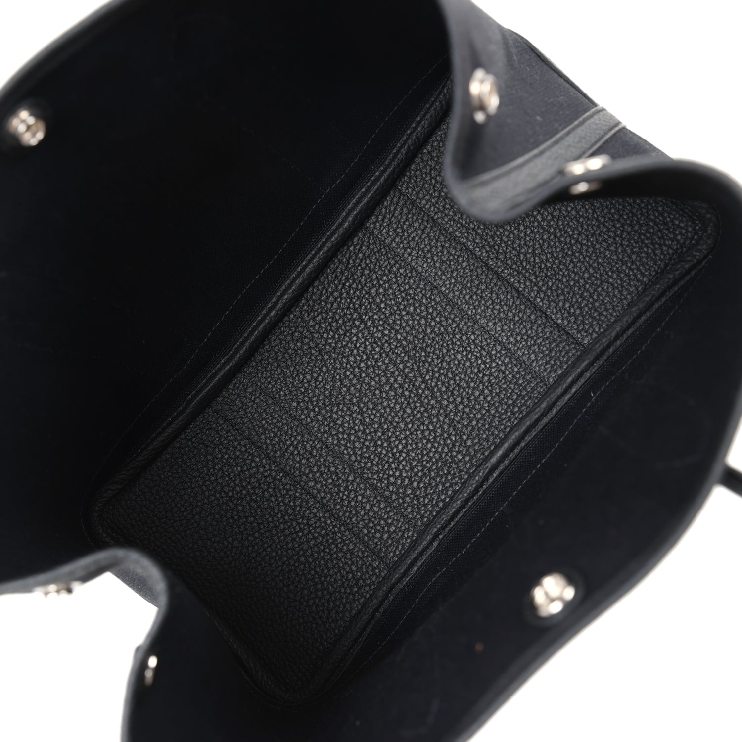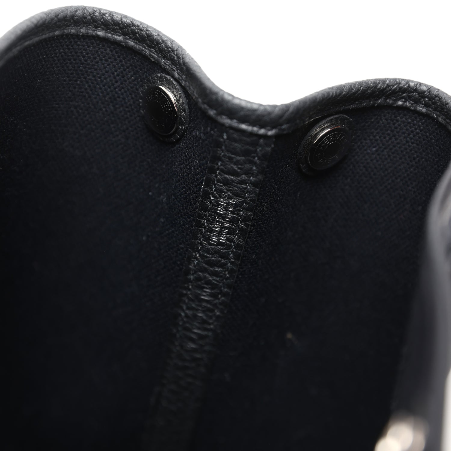 This Hermès Garden Party is in Black Toile H canvas and Negonda leather with palladium hardware, and features tonal stitching, one engraved palladium front snap closure with two snap closures on side to adjust bag width. This bag features two leather top handles.
