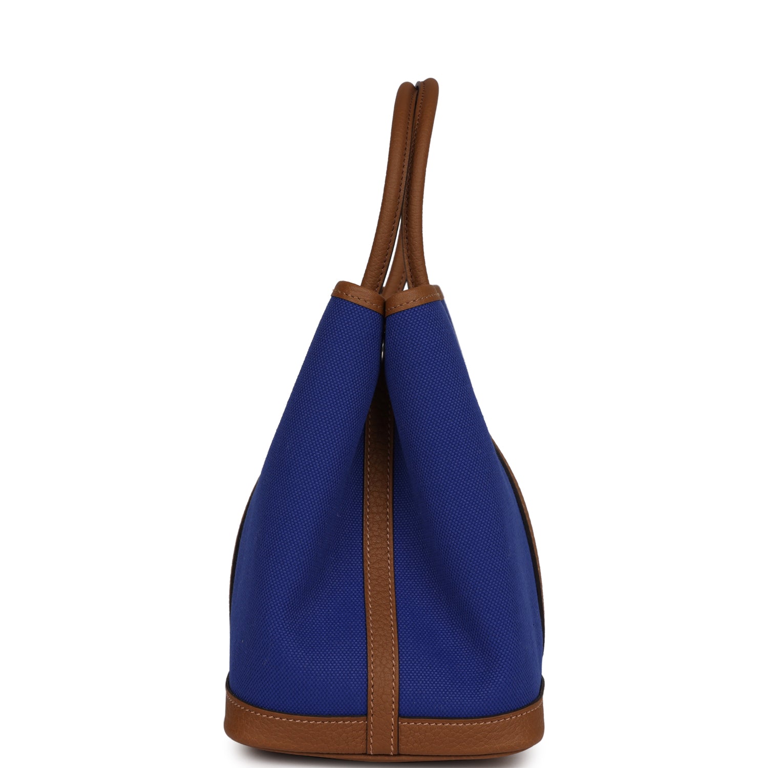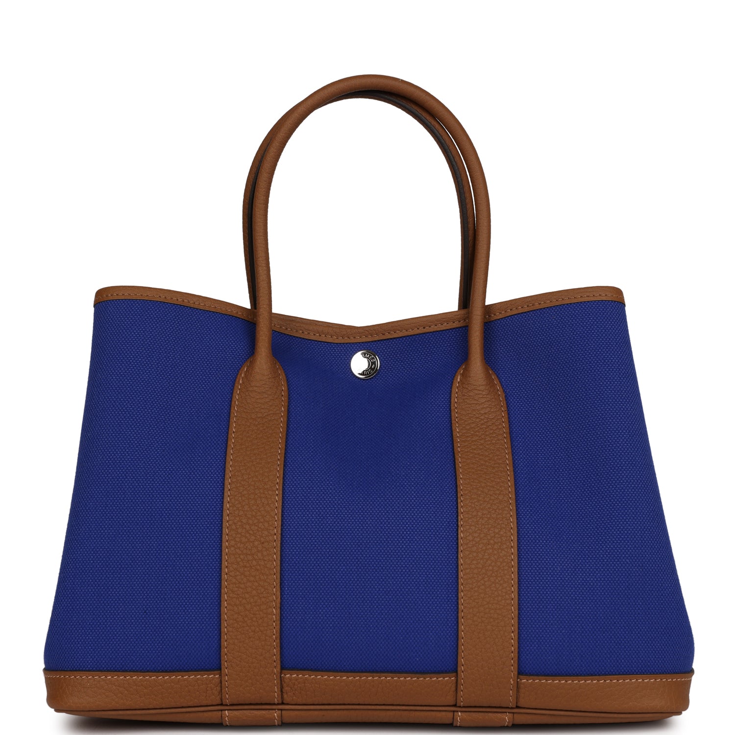 This Garden Party 30 is in Bleu Electrique Toile and Alezan Negonda with Palladium Hardware, contrast stitching, one engraved palladium front snap closure with two snap clousres on the side to adjust bag width. This bag features two top handles