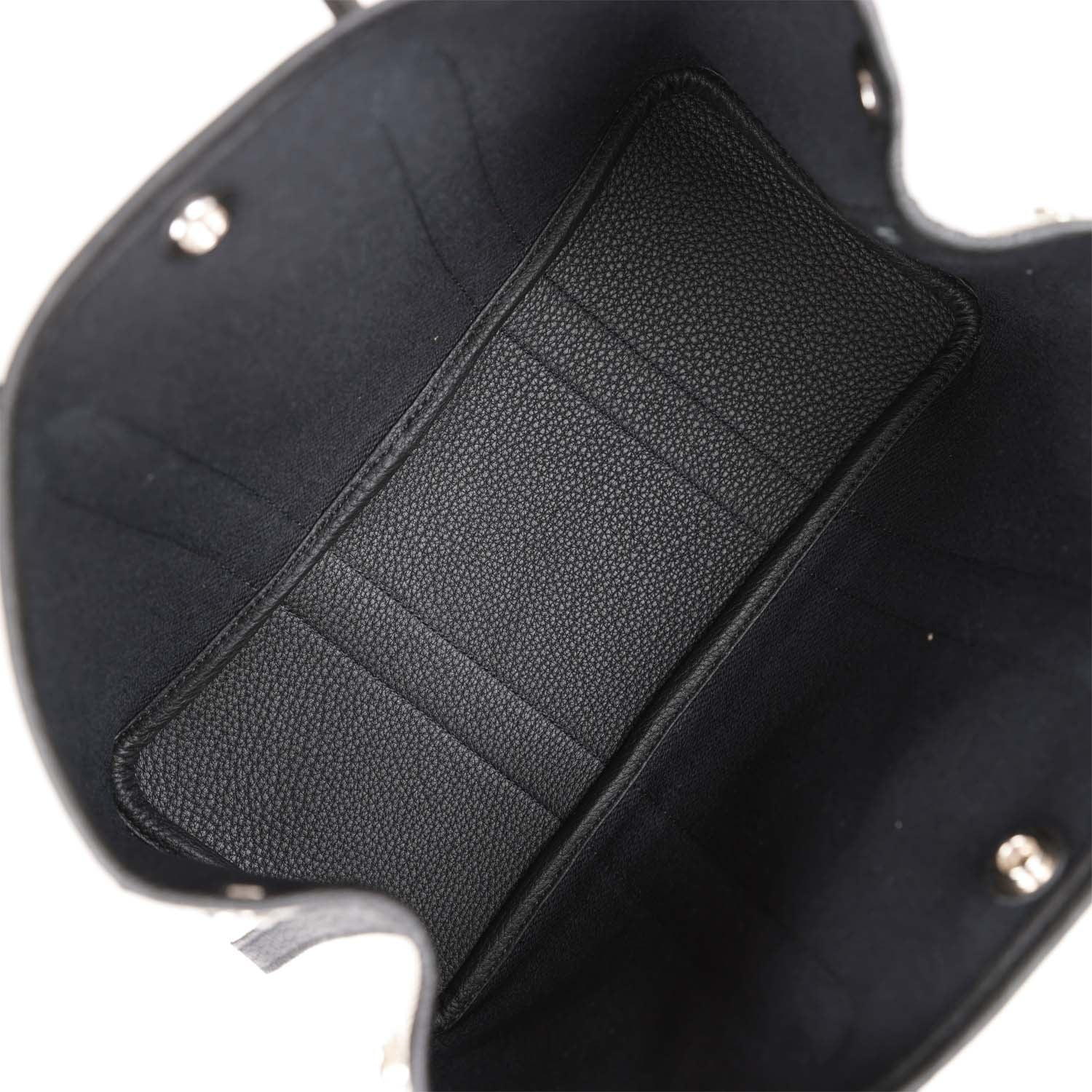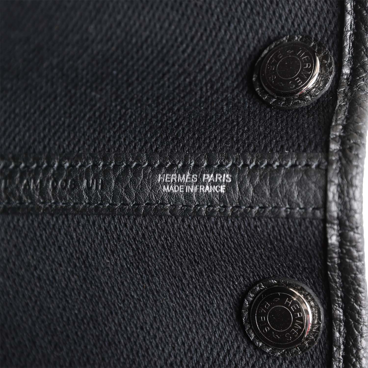 Hermes Ecru Toile and Black Garden Party 30 in Negonda leather with classic toile herringbone lining, one engraved palladium front snap closure with two snap closures on side to adjust bag width. This bag features two top handles and flat interior zipper pocket with engraved zipper pull.