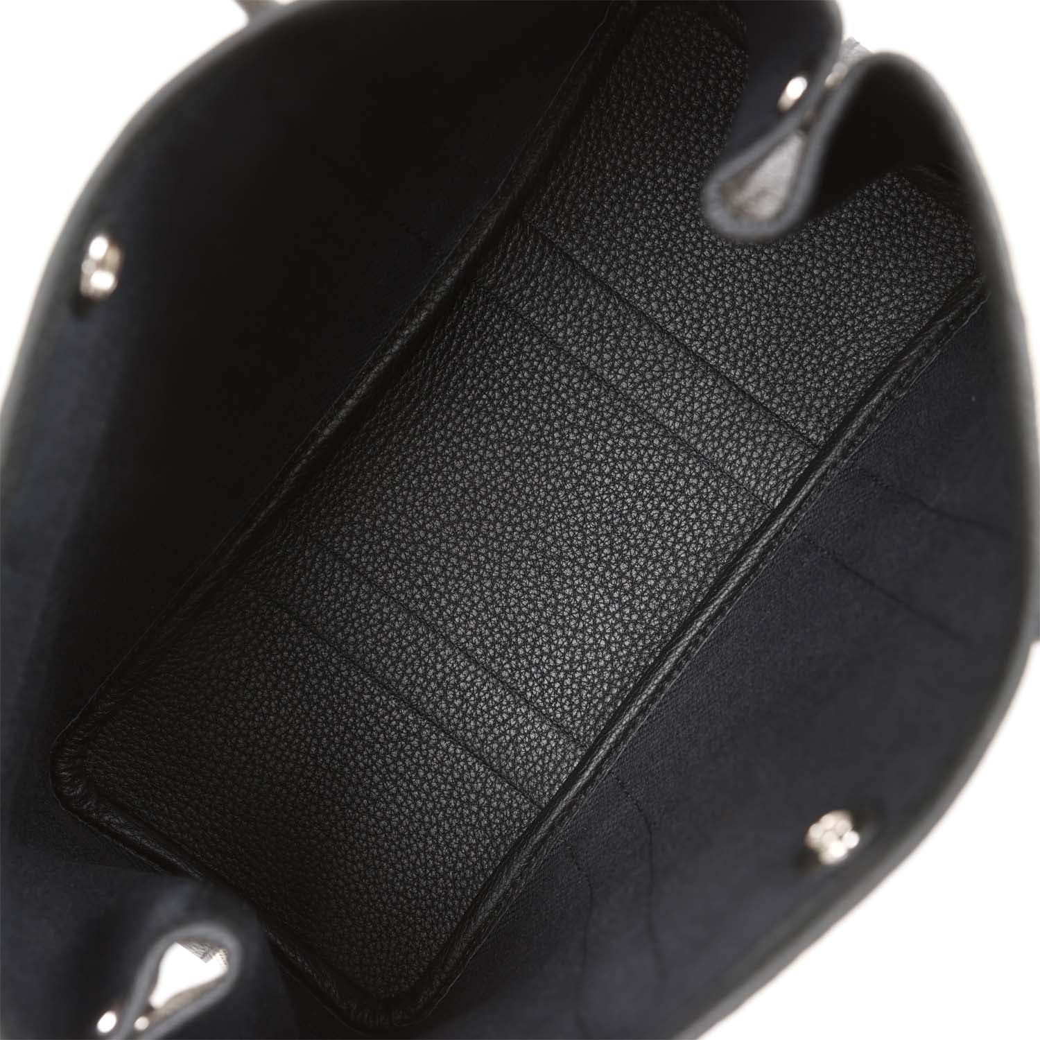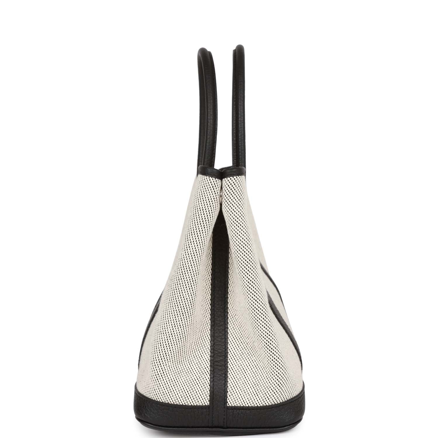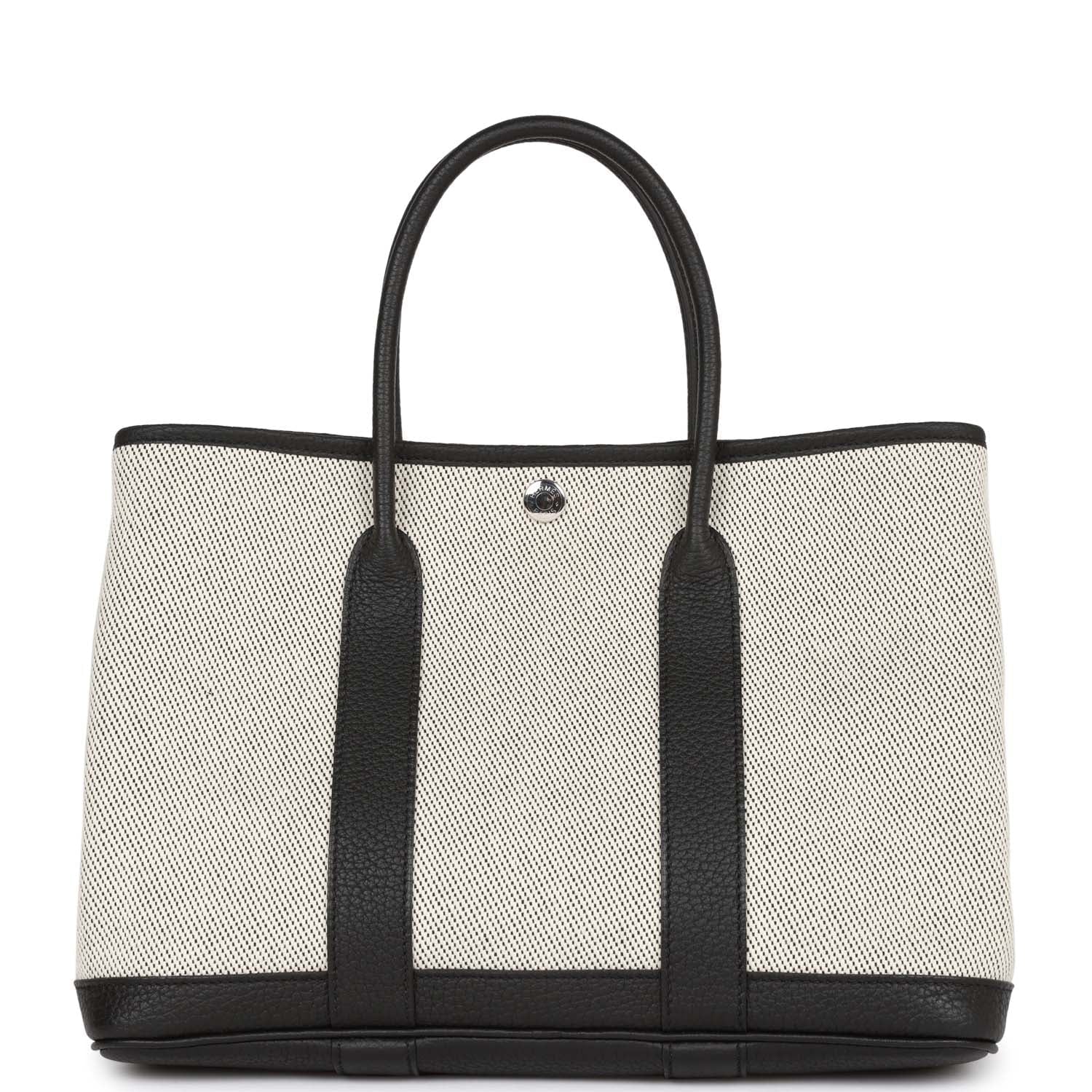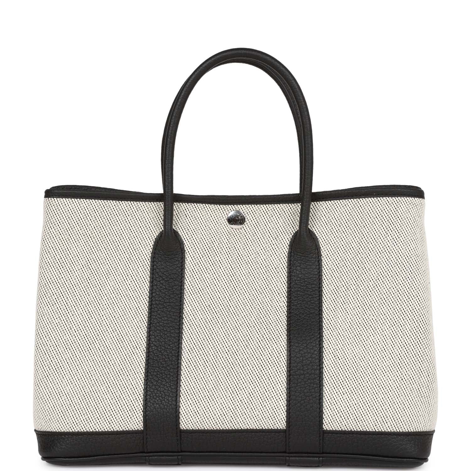 Hermes Ecru Toile and Black Garden Party 30 in Negonda leather with classic toile herringbone lining, one engraved palladium front snap closure with two snap closures on side to adjust bag width. This bag features two top handles and flat interior zipper pocket with engraved zipper pull.