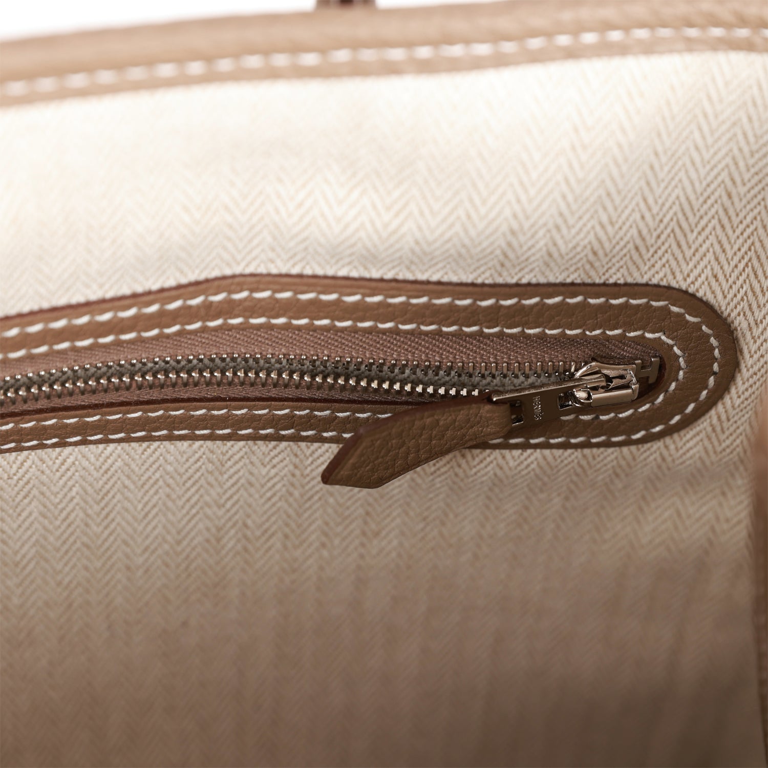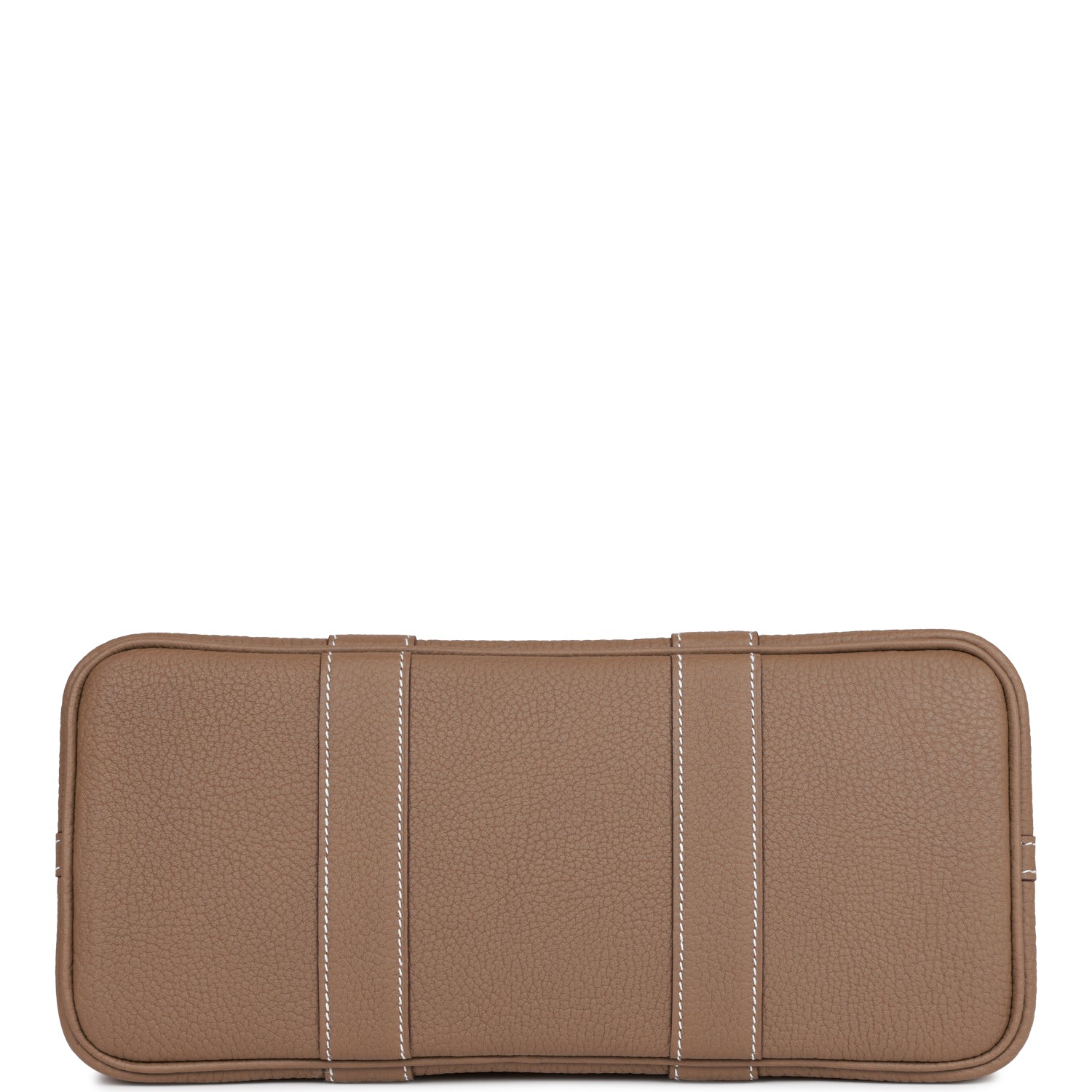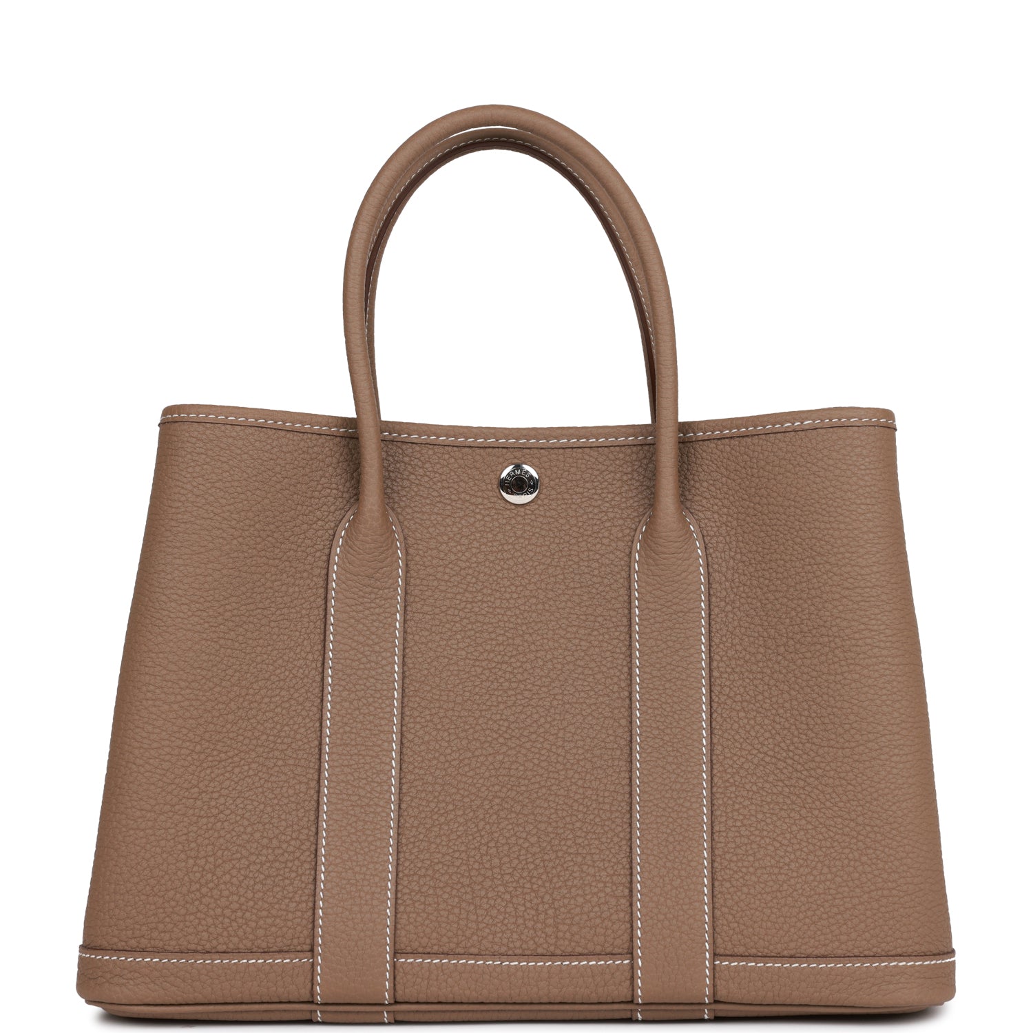Hermes Garden Party 30cm of Etoupe Negonda with palladium plated hardware and features contrast stitching, Clou de Selle snap closure and double rolled handles.