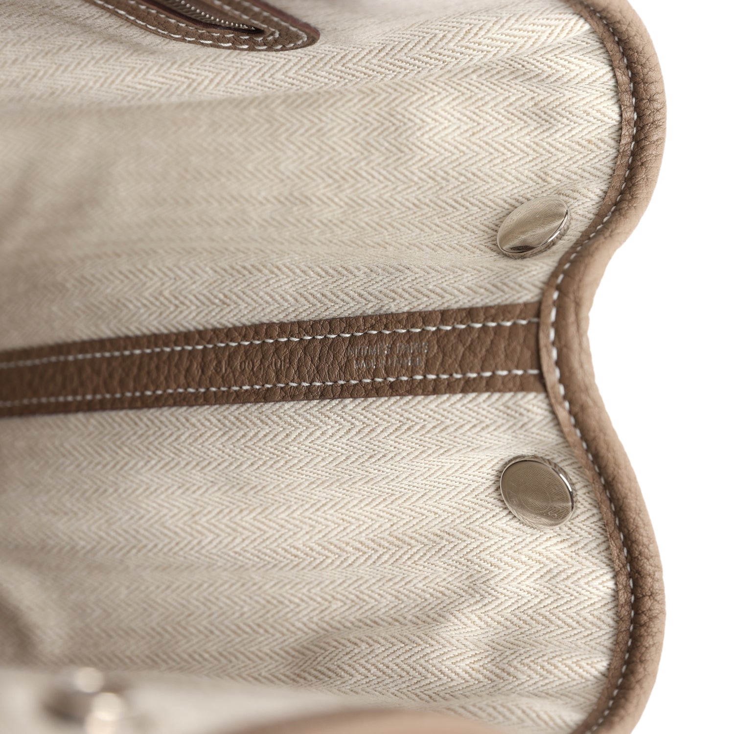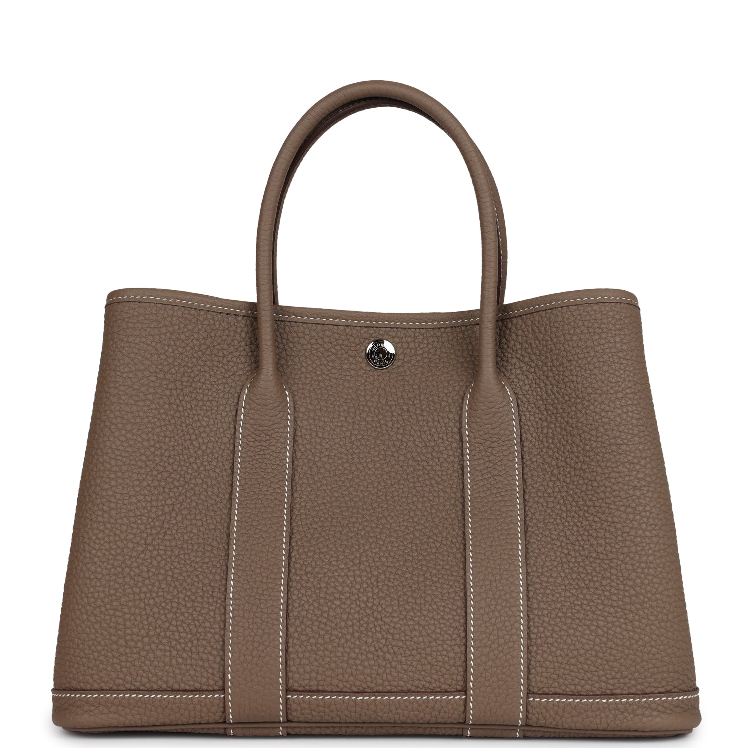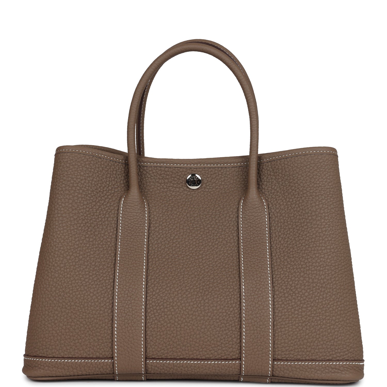 This Hermes Garden Party is in Etoupe Negonda leather with palladium hardware, contrast stitching, one engraved palladium front snap closure with two snap closures on side to adjust bag width. This bag features two top handles and flat interior zipper pocket with engraved zipper pull.