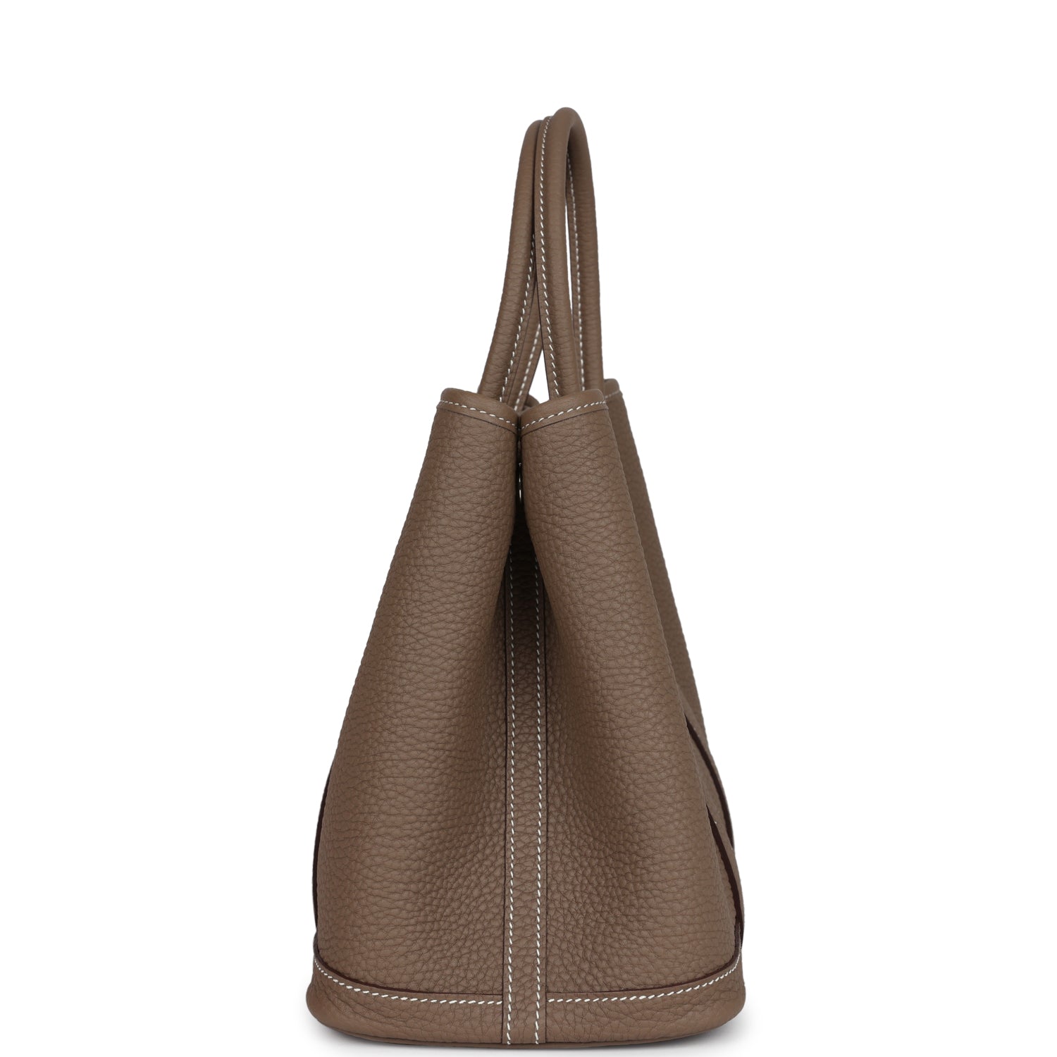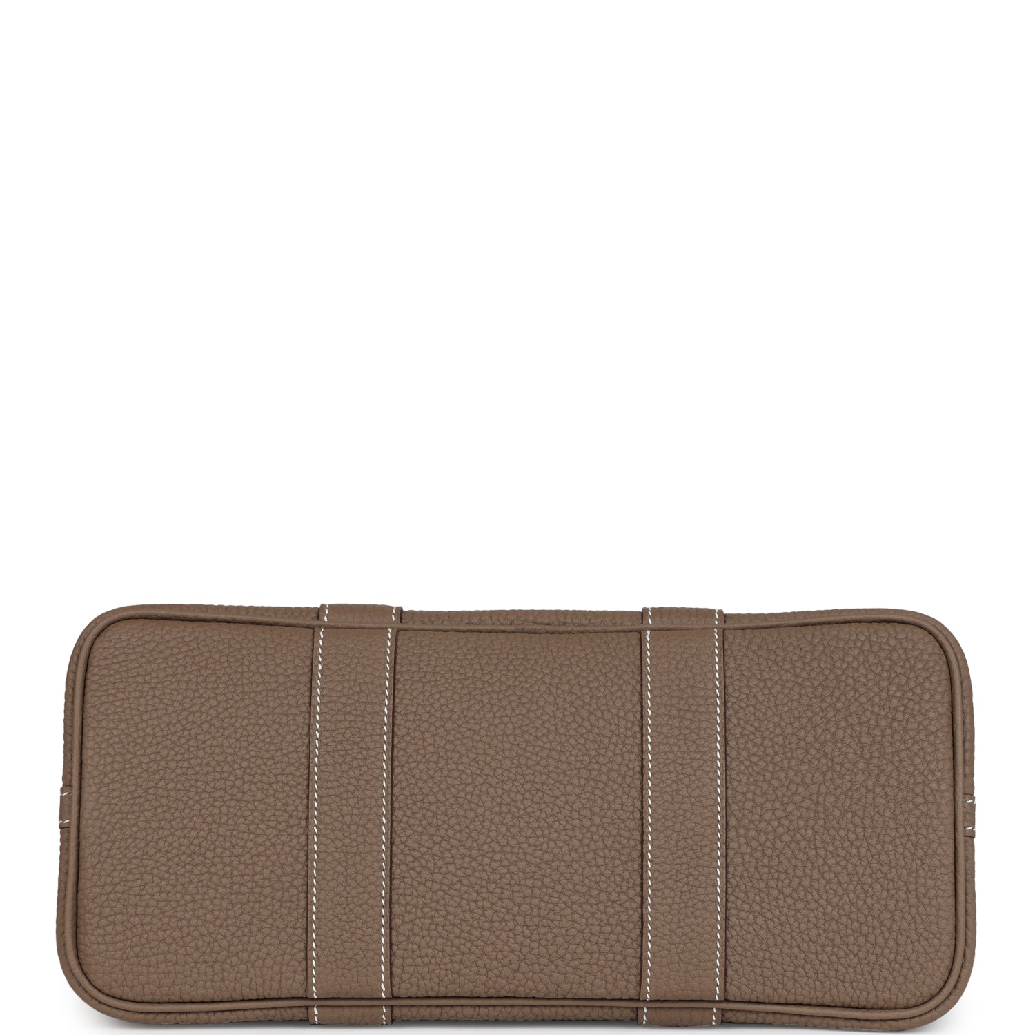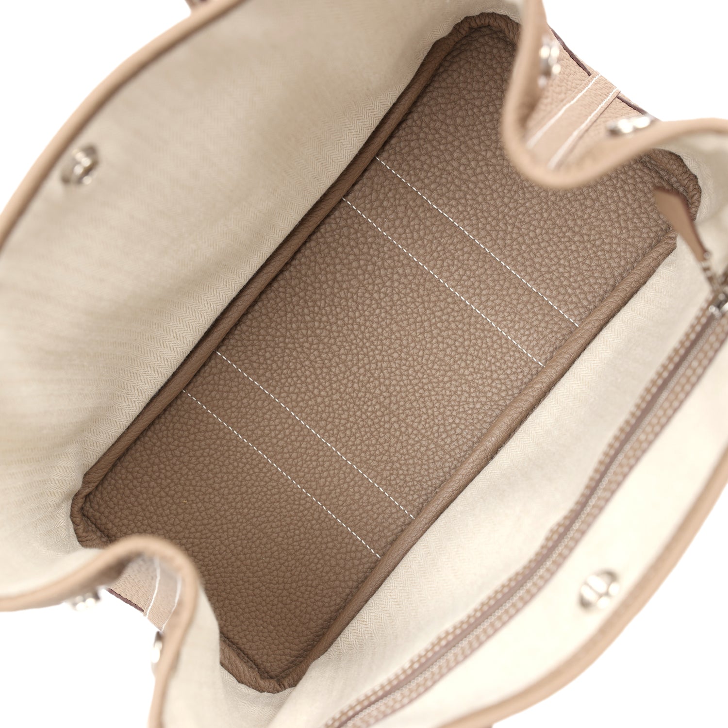 This Hermes Garden Party is in Etoupe Negonda leather with palladium hardware, contrast stitching, one engraved palladium front snap closure with two snap closures on side to adjust bag width. This bag features two top handles and flat interior zipper pocket with engraved zipper pull.