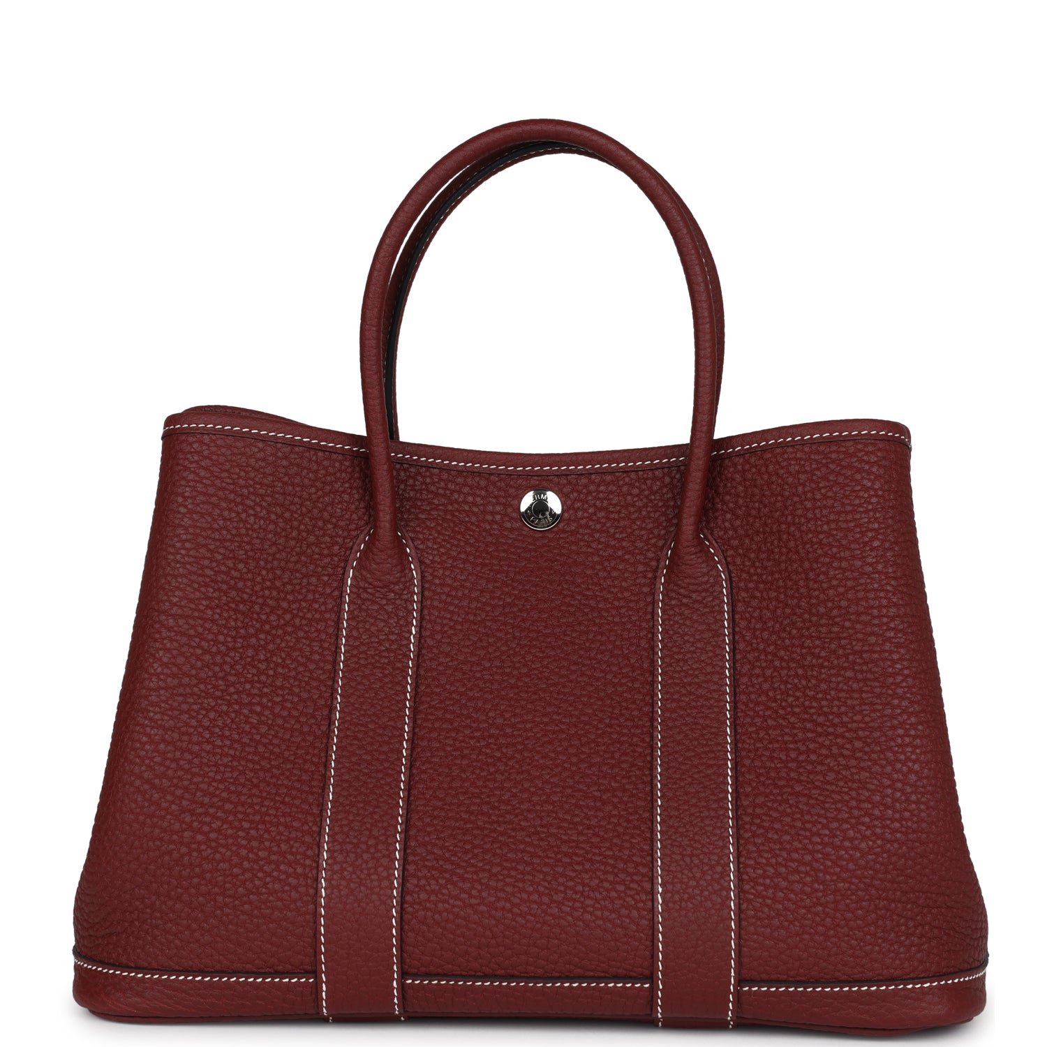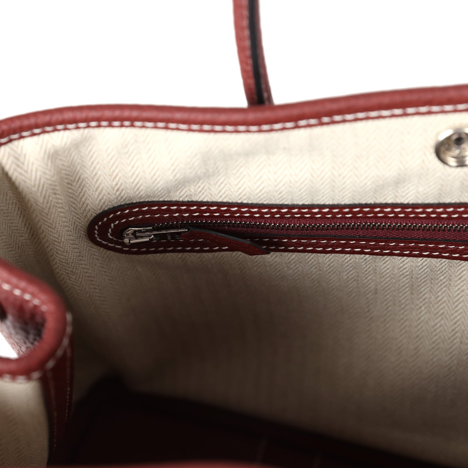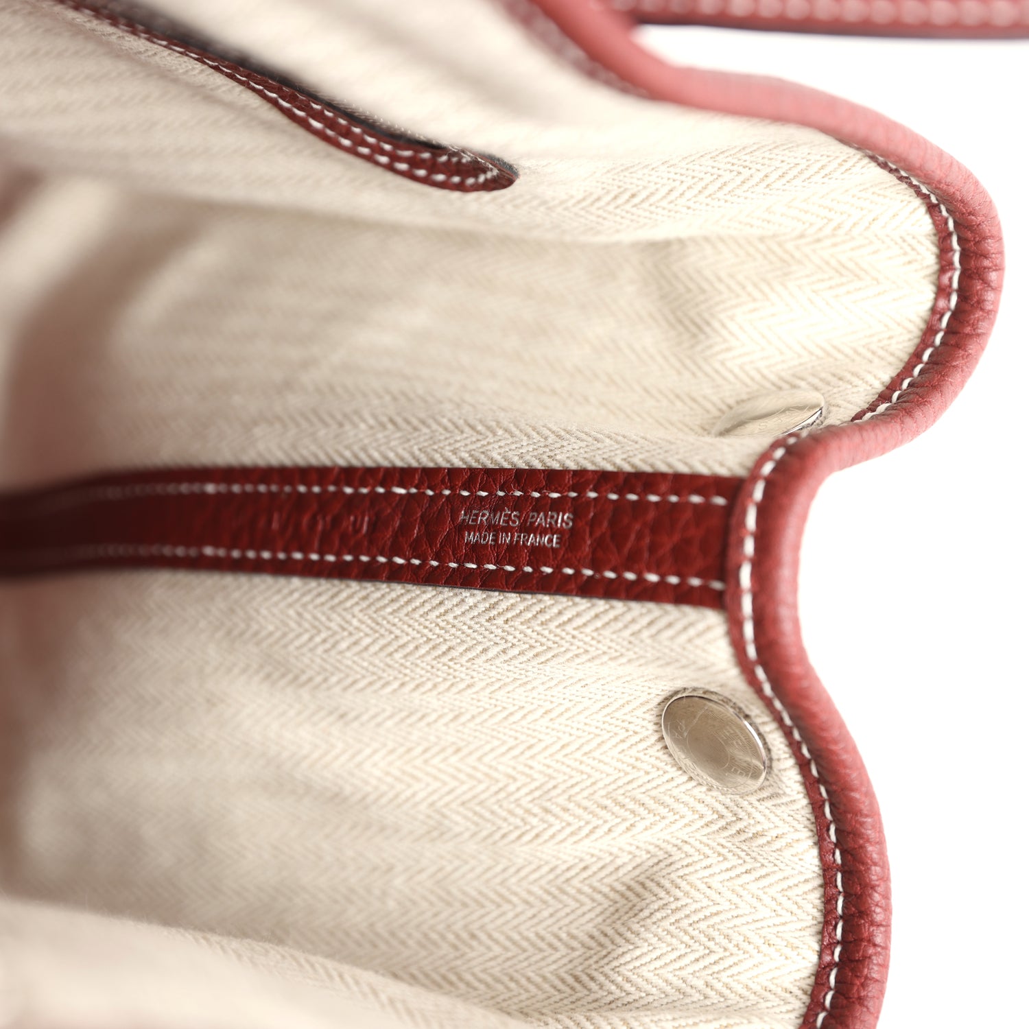 This Hermes Garden Party is in Rouge H Negonda leather with palladium hardware, classic herringbone toile lining, contrast white stitching, one engraved palladium front snap closure with two snap closures on side to adjust bag width. This bag features two top handles and flat interior zipper pocket with engraved zipper pull.