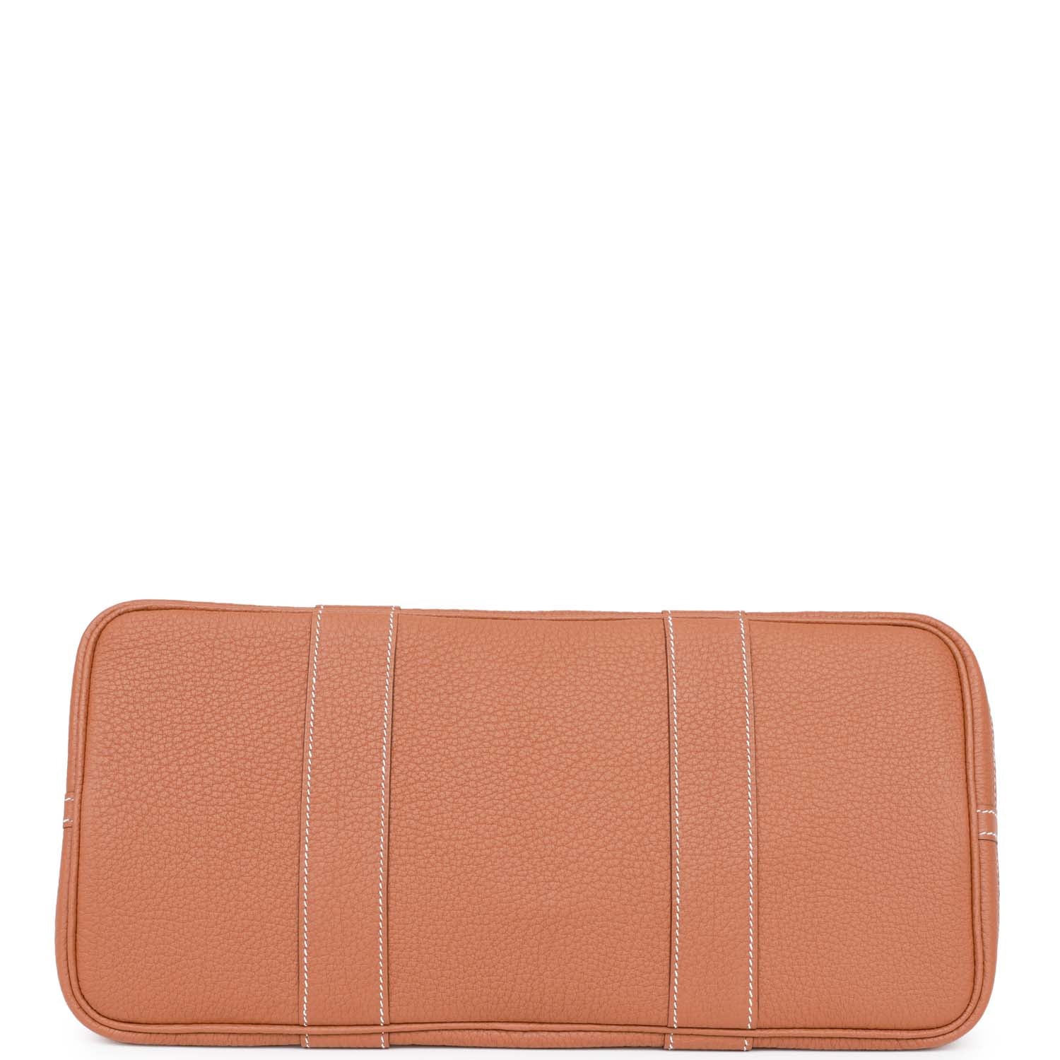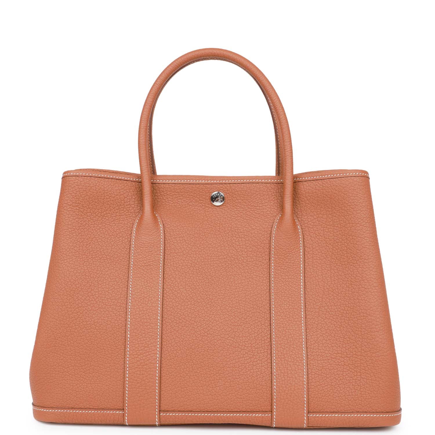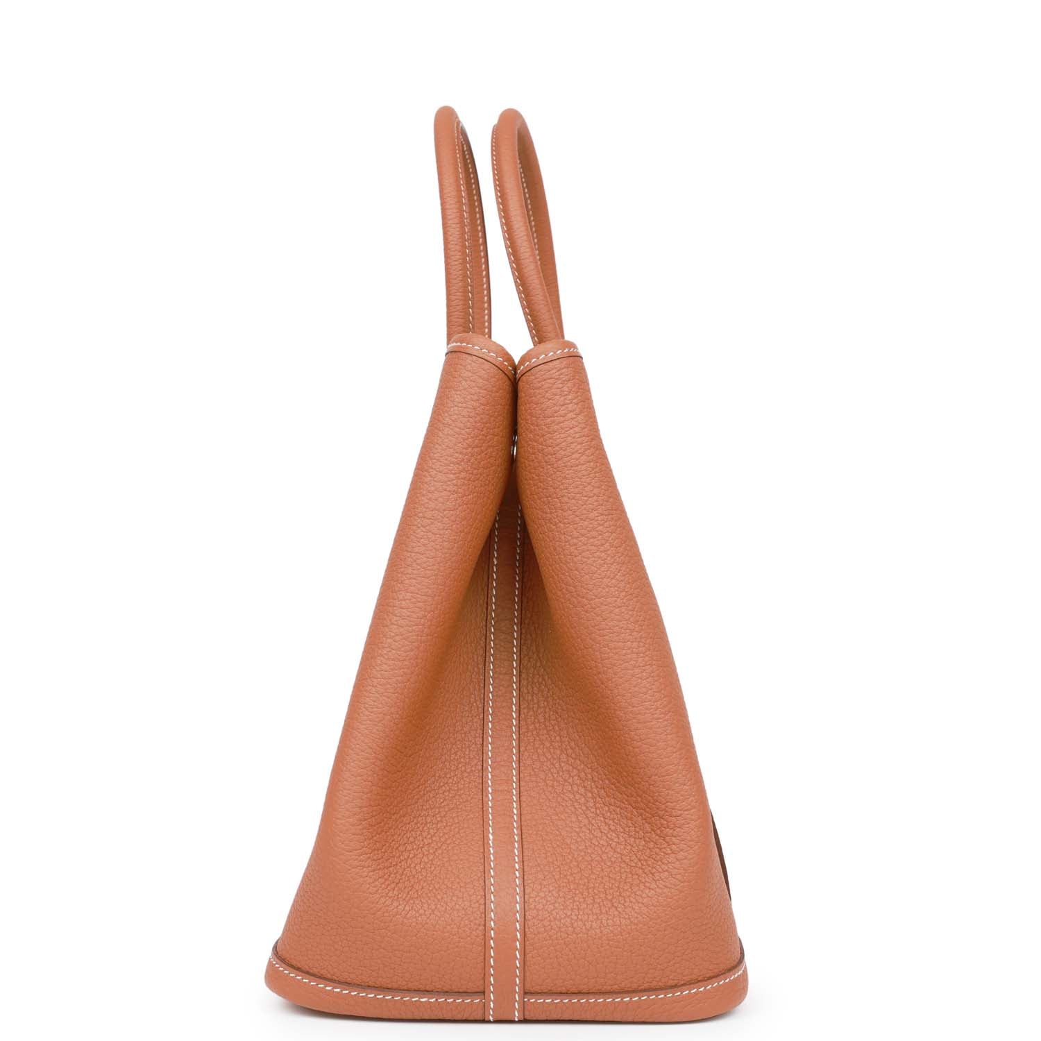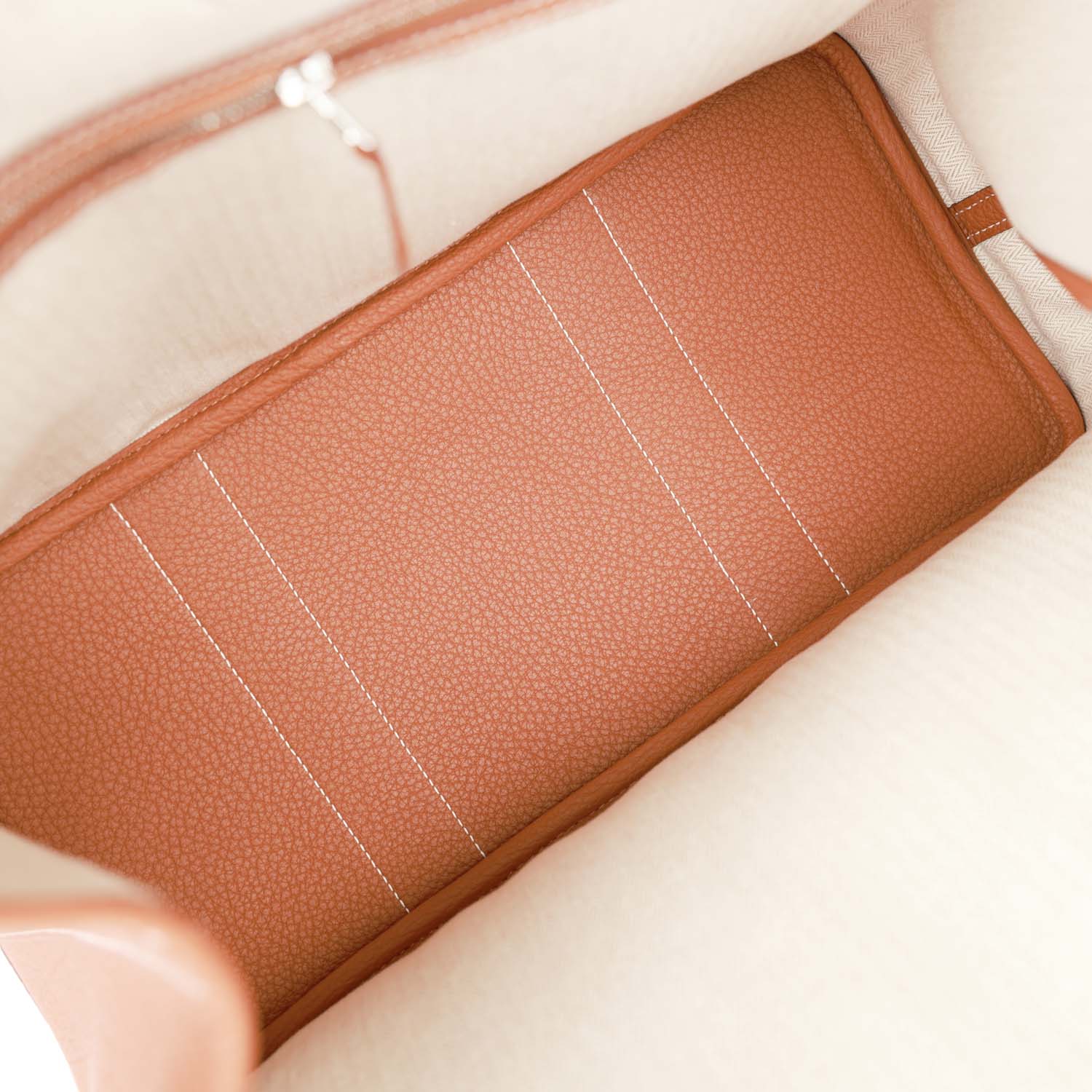 This Hermes Garden Party is of Gold Negonda with palladium plated hardware, tonal stitching, Clou de Selle snap closure, and double rolled handles.