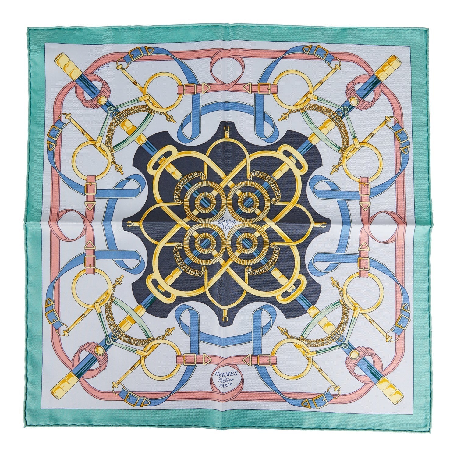 Hermes "Gavroche" silk twill pocket square scarf by Virginie Jamin in a Vert Amande colorway with Ciel and Vieux Rose secondary colors.