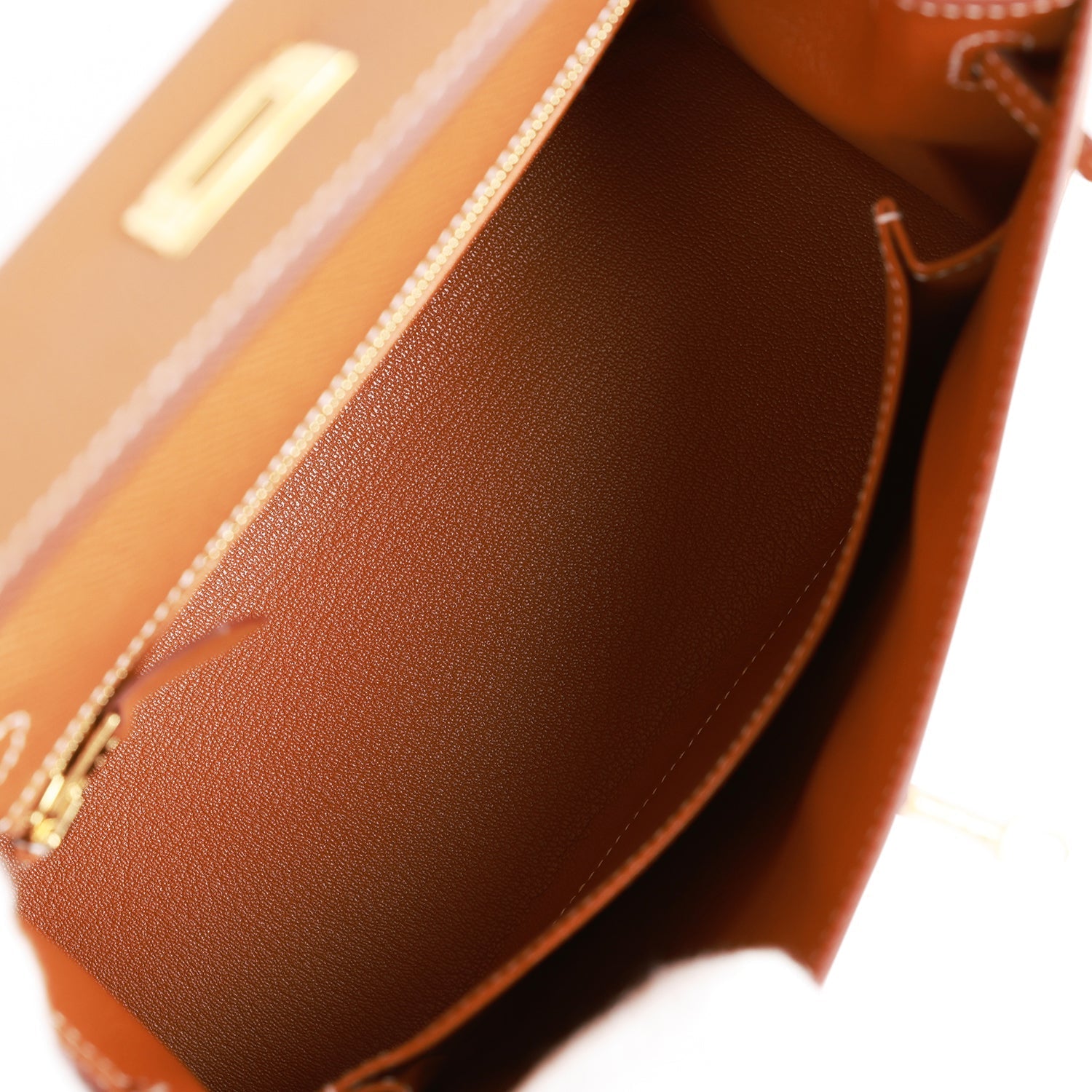This Kelly is in Gold Epsom leather with gold hardware, has contrast stitching, front flap, two straps with center toggle closure, clochette with lock and two keys, single rolled handle and an optional shoulder strap.