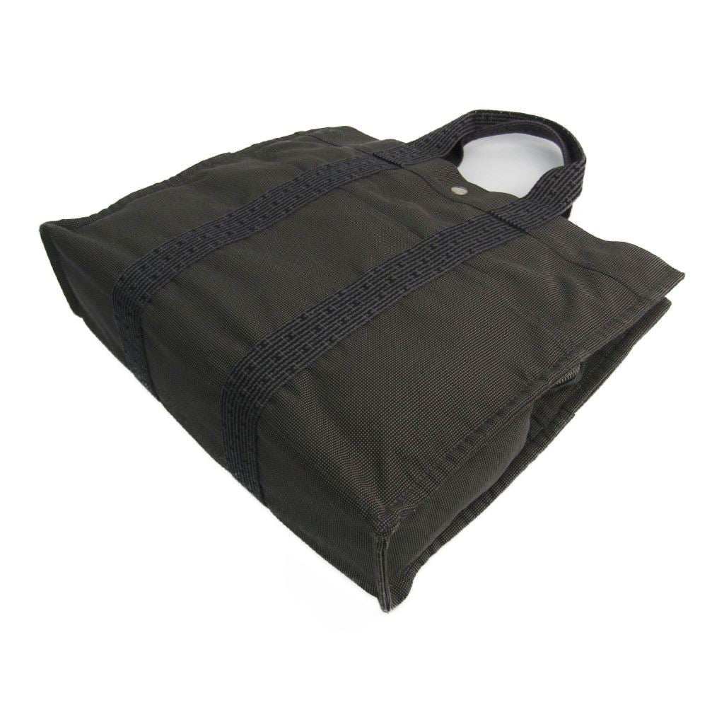 This is an , HERMES Herline MM Tote. It's the medium-sized Herline bag. It features a gray canvas with silver-tone hardware, canvas handles, an open pocket, and a double zip closure. It's a chic Hermes tote for every day.