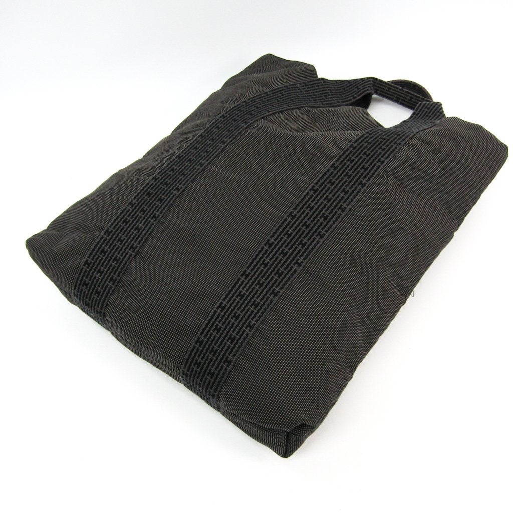 This is an , HERMES Herline Sac Cabas Tote Bag. It features a dark gray canvas with silver-tone hardware, canvas handles, a front pocket, an interior pocket, and a zip closure. It's a chic Hermes tote for every day.