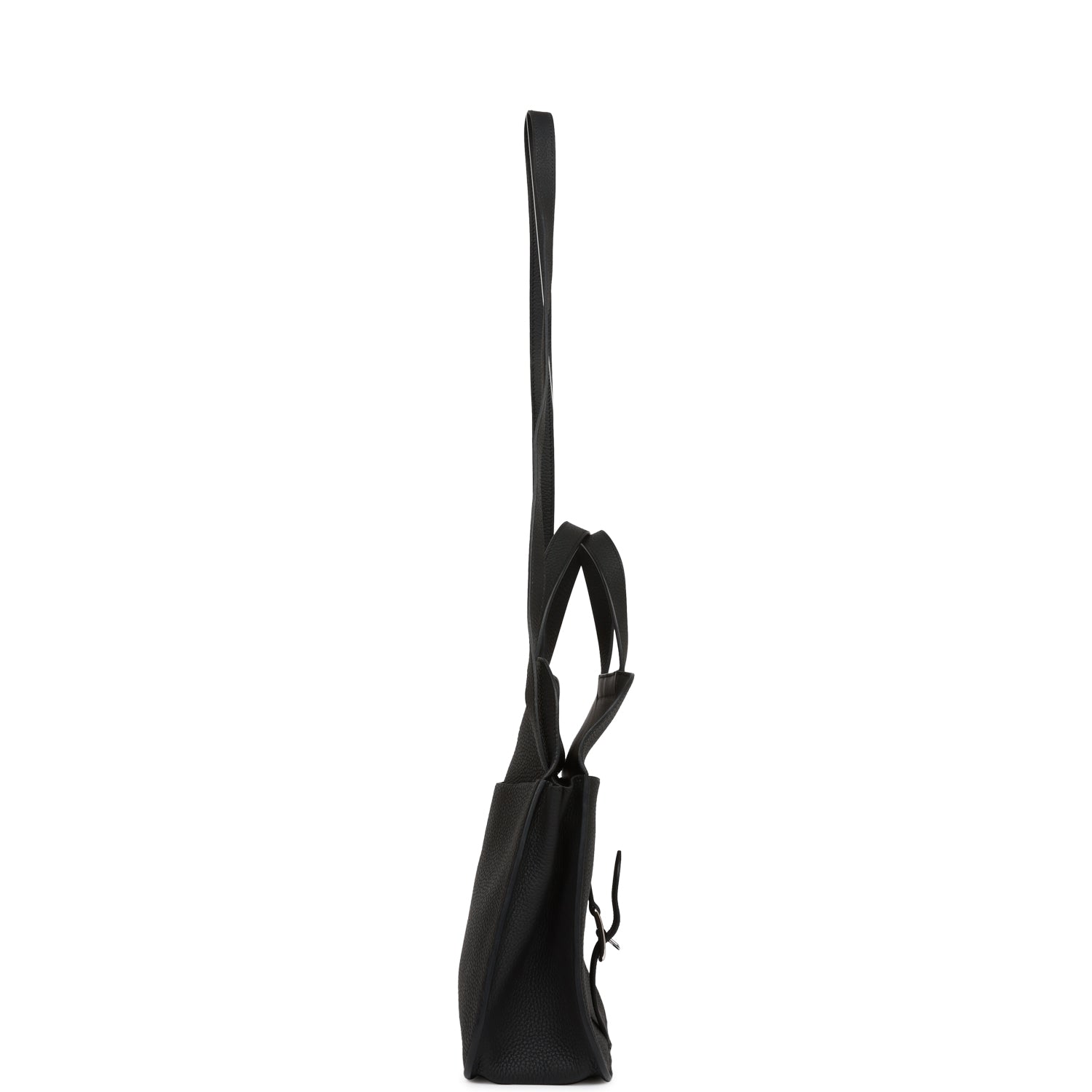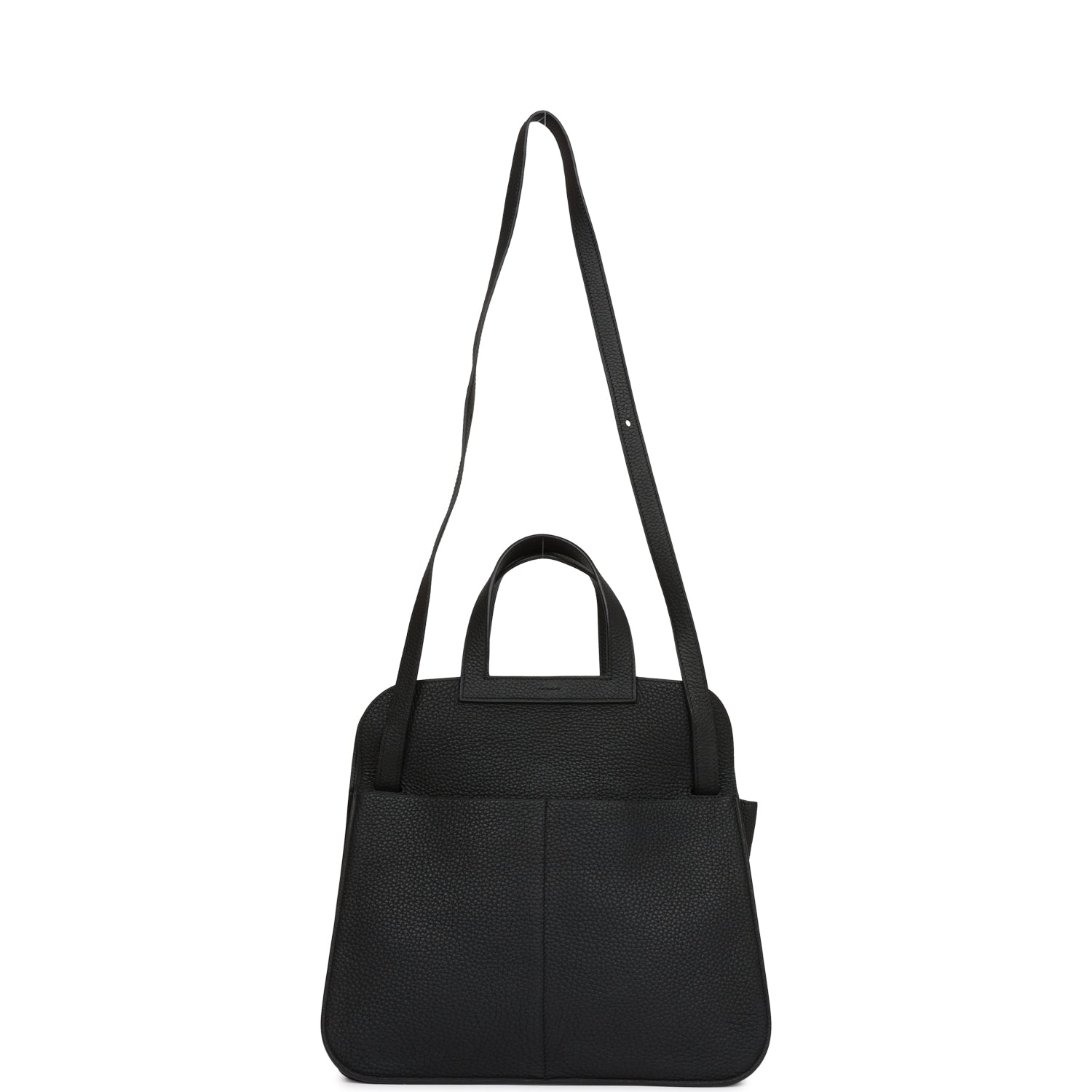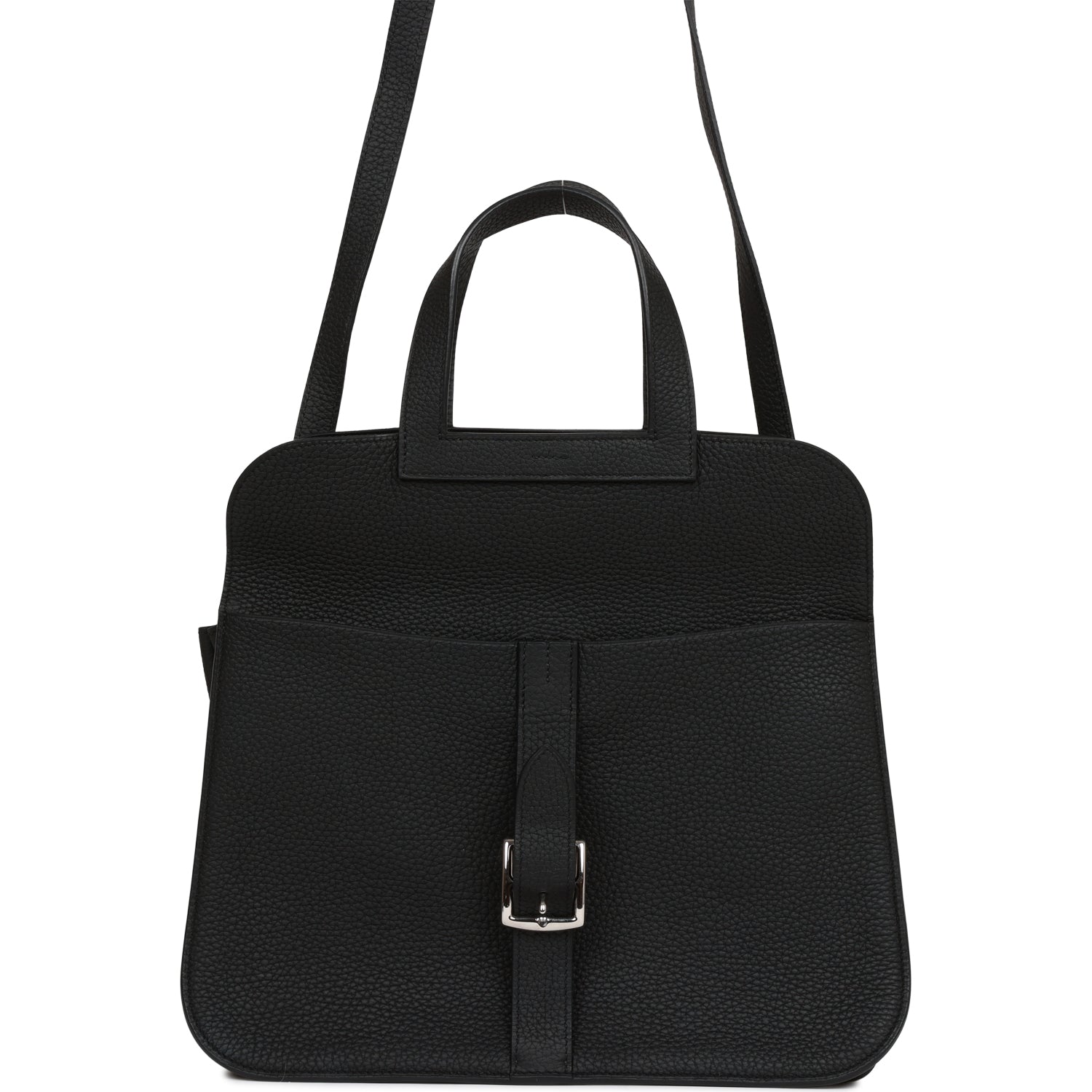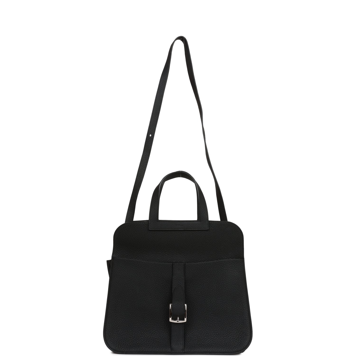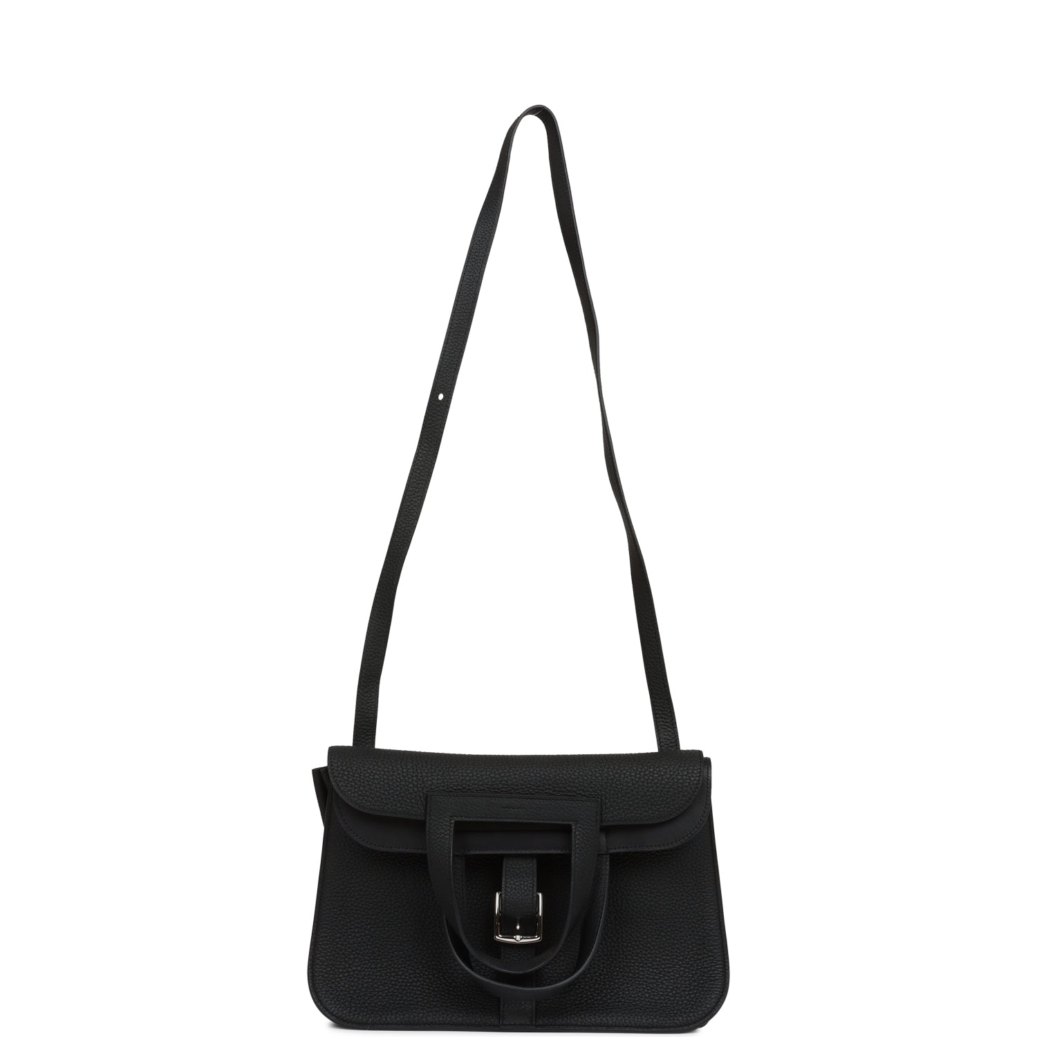 This Halzan is in Black clemence leather with palladium hardware and has tonal stitching, foldable top handle and crossbody strap for multiple ways to wear.