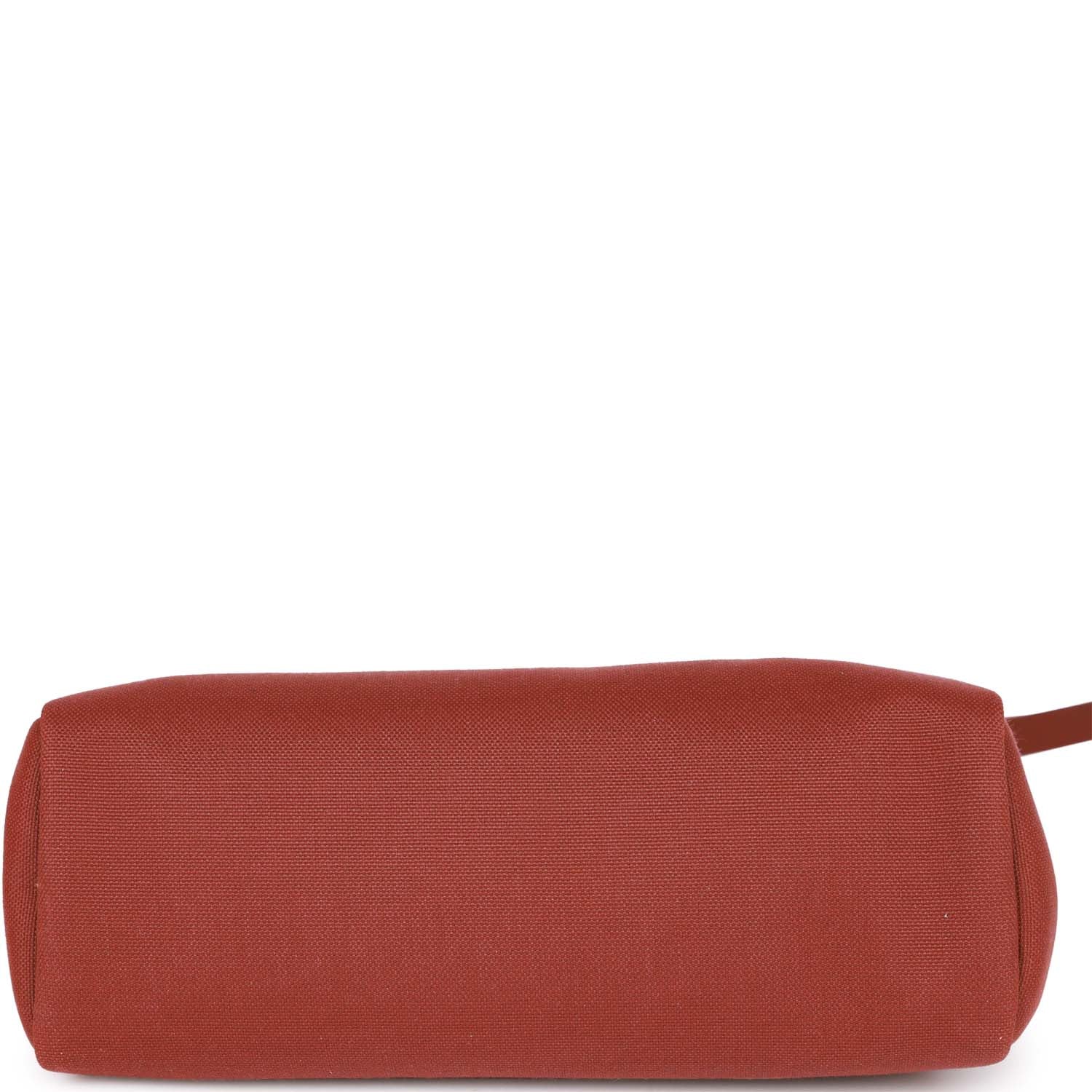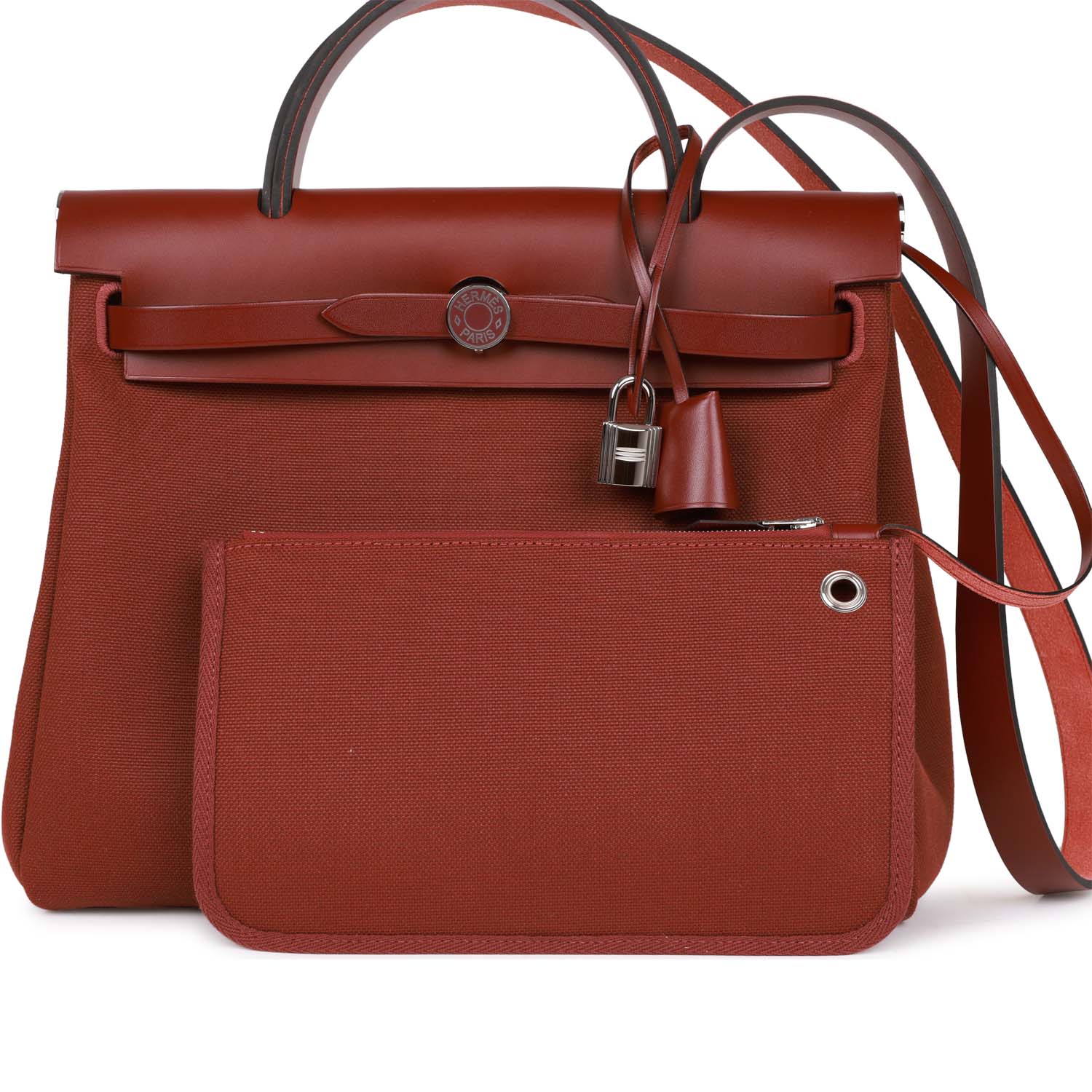 This Herbag Zip PM 31cm is in Rouge H Toile and vache hunter leather with palladium hardware and has tonal stitching, front flap, two straps with center clou de selle closure, clochette with lock and two keys, back zip pocket, single rolled handle and shoulder strap.