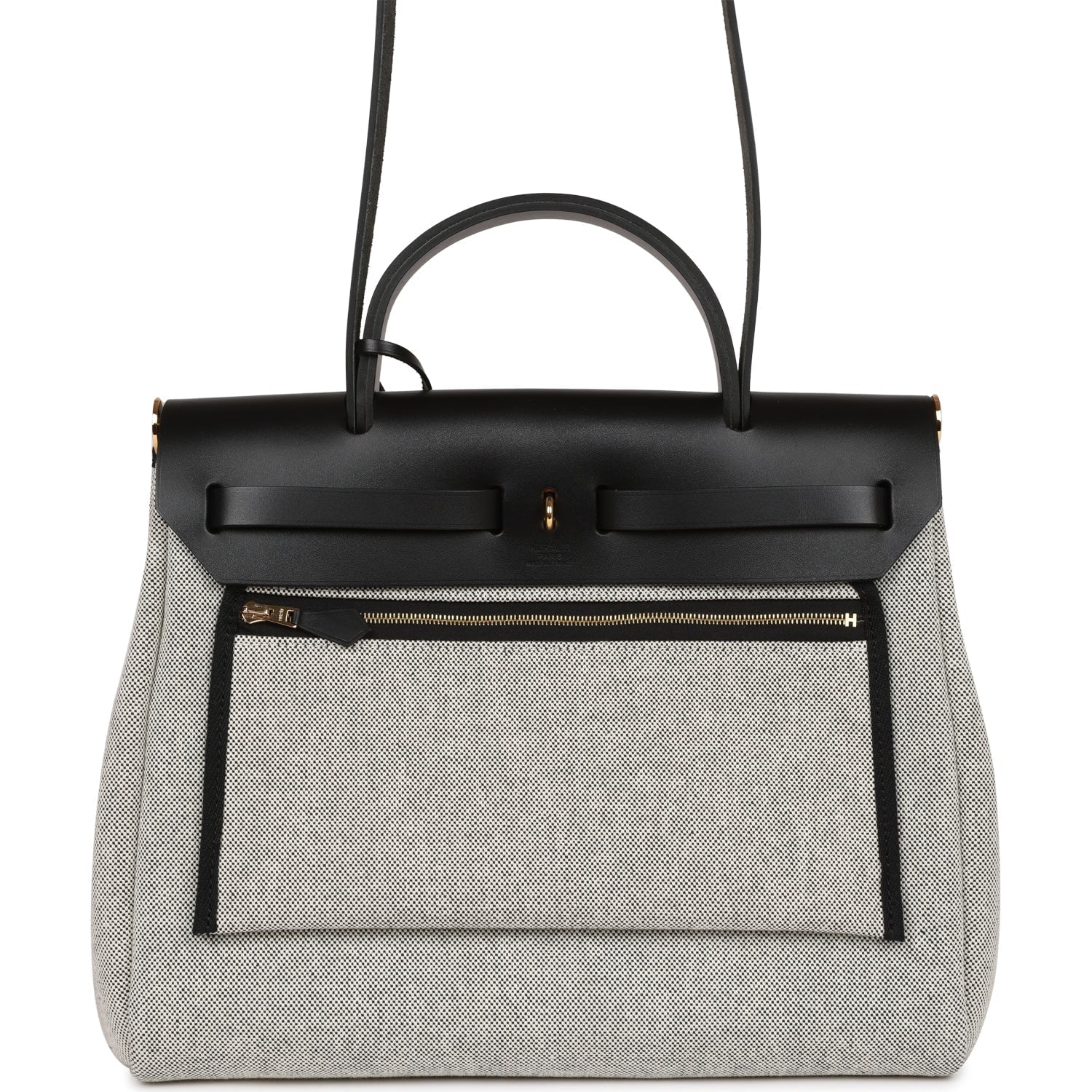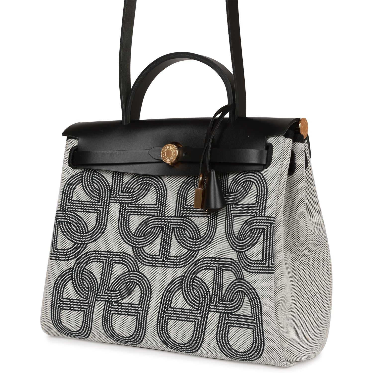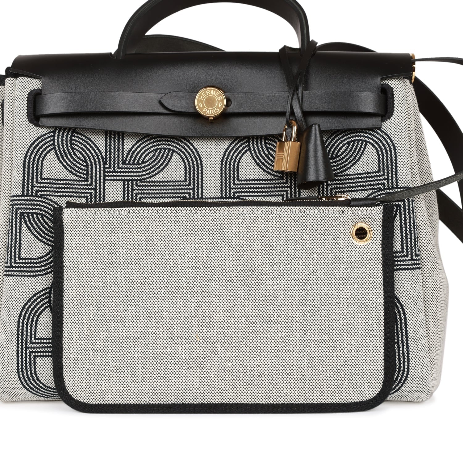 This Hermes Limited Edition Herbag 31 cm is of "Chain D'ancre" Ecru and Black Vache Leather with gold hardware has tonal stitching, clou de selle closure, top handle and shoulder strap in hunter leather, clochette, interior zip pouch and zip pocket on back of bag.