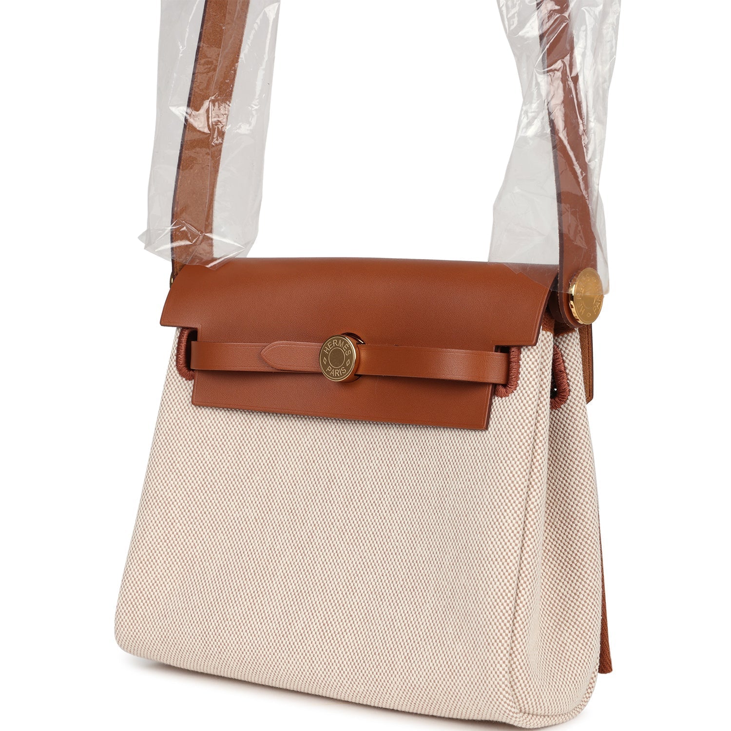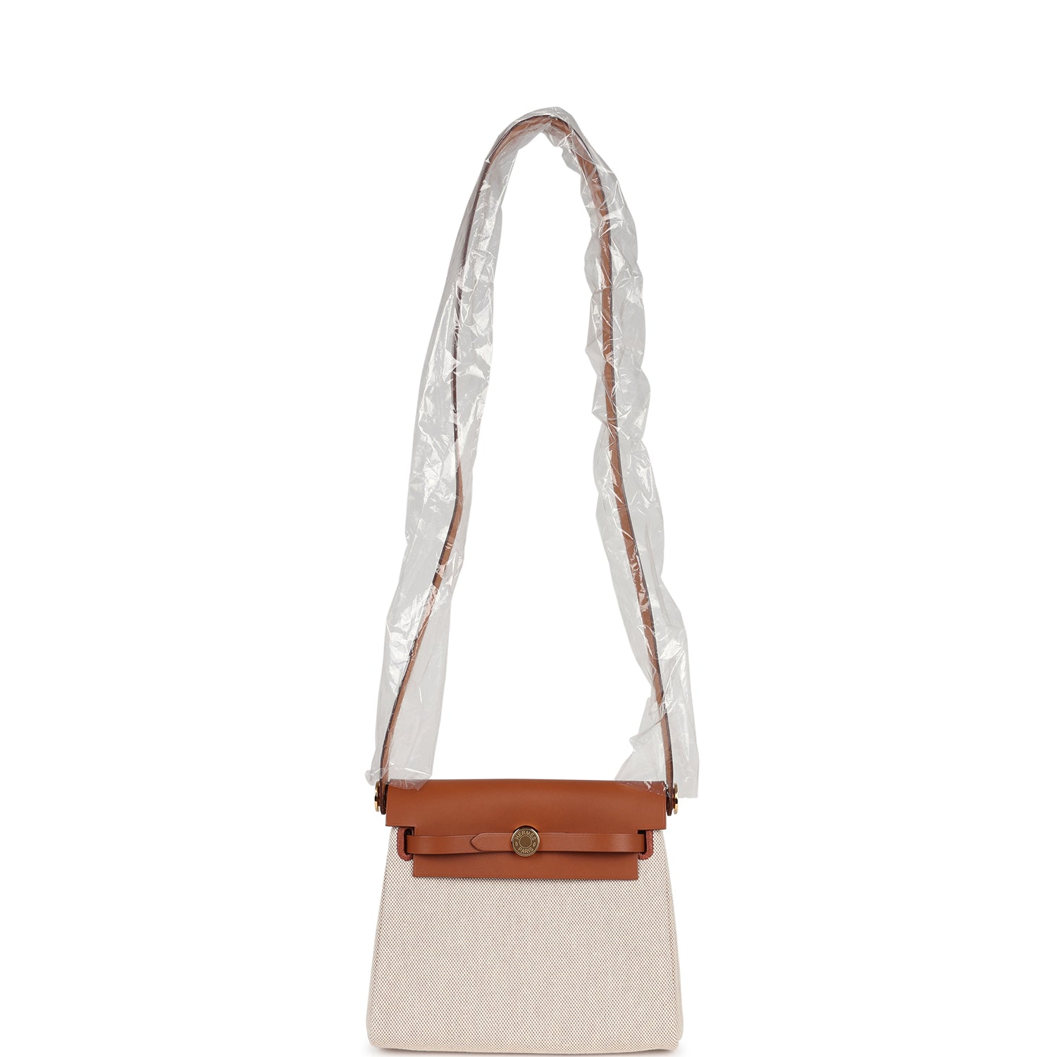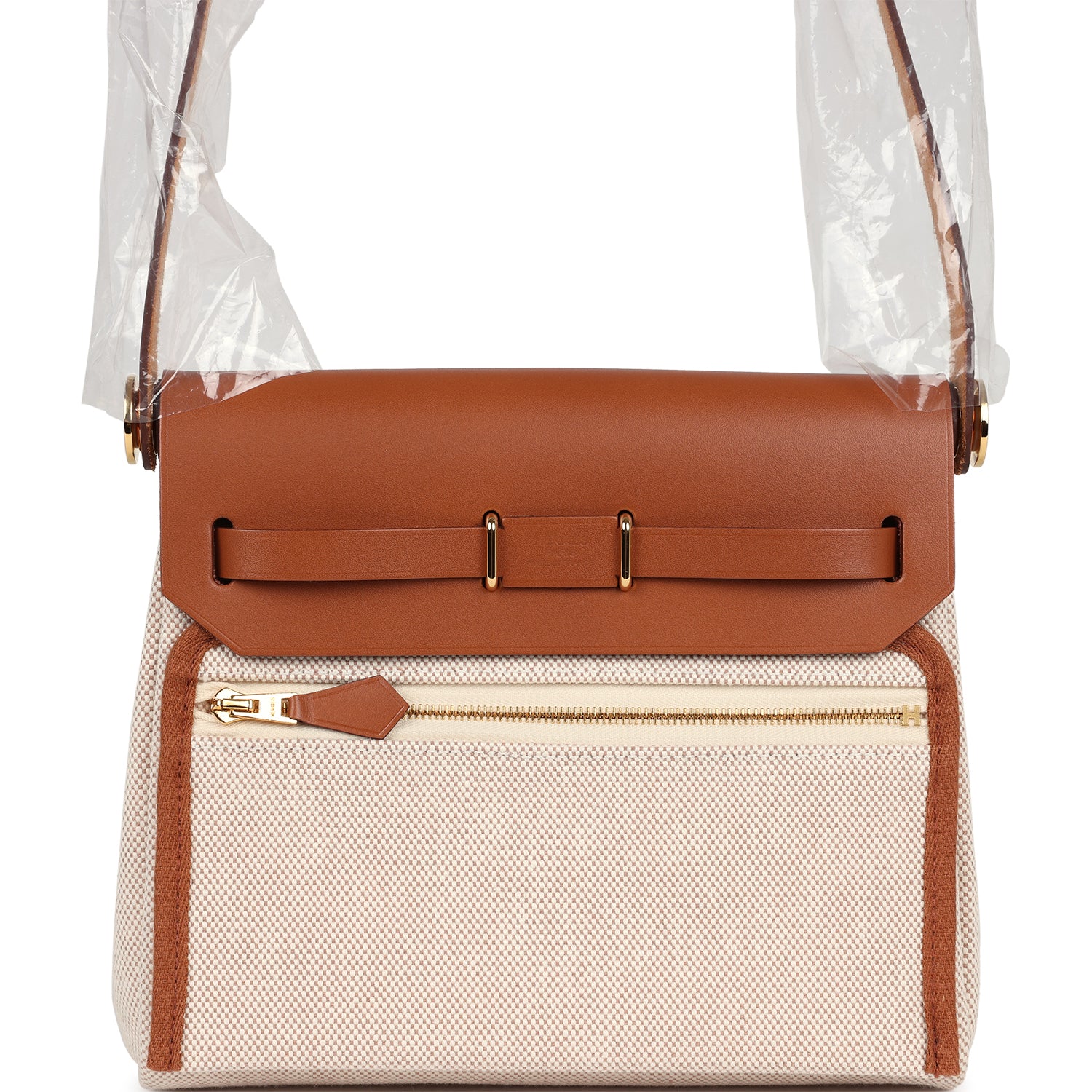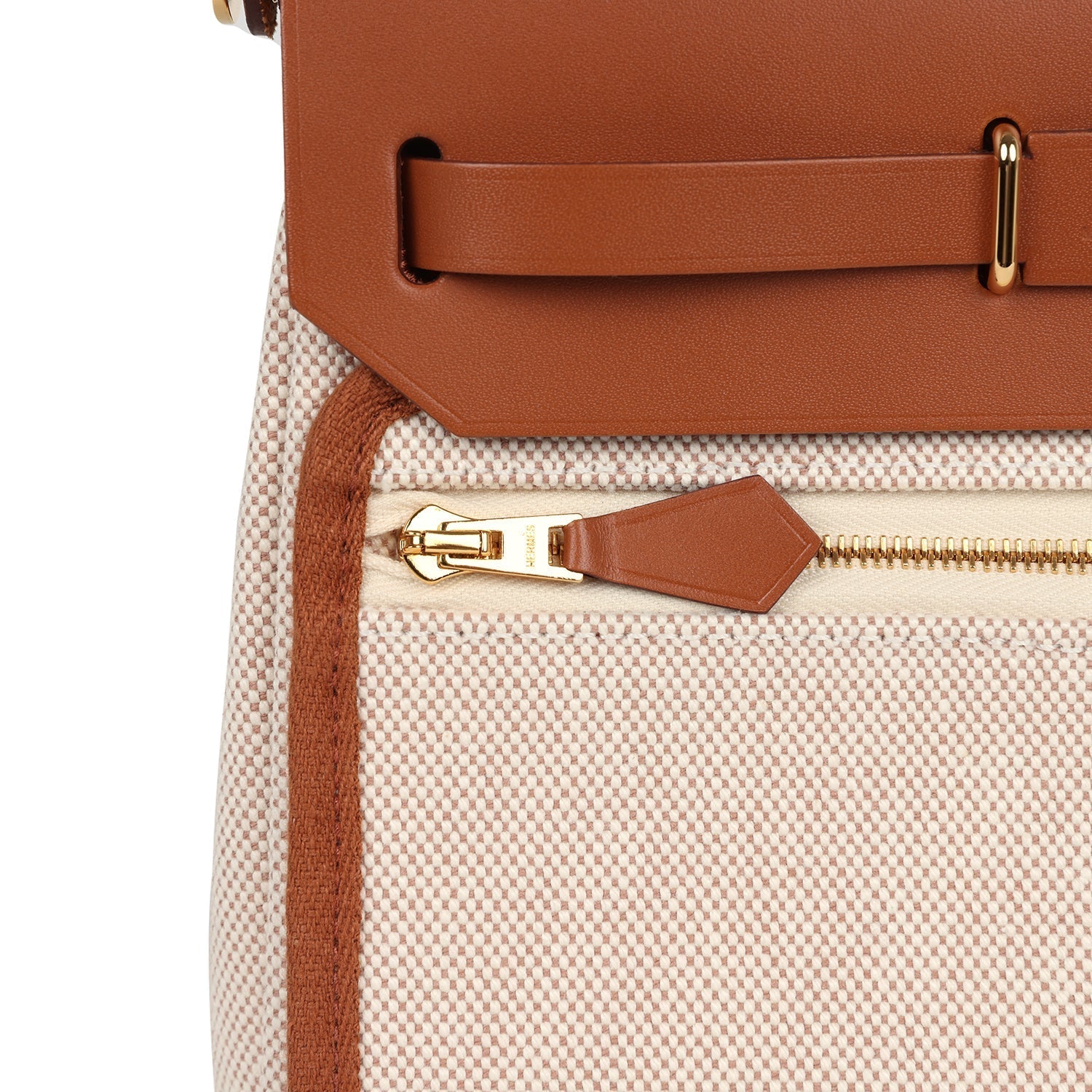 This Hermes Herbag Zip 20 Mini Ecru and Beige Toile H Canvas and Fauve Vache Hunter with gold hardware has tonal stitching, front flap, two straps with center clou de selle closure, back zip pocket and black shoulder strap.