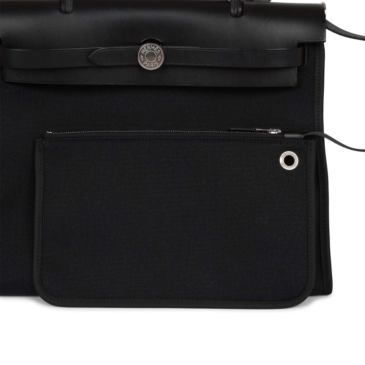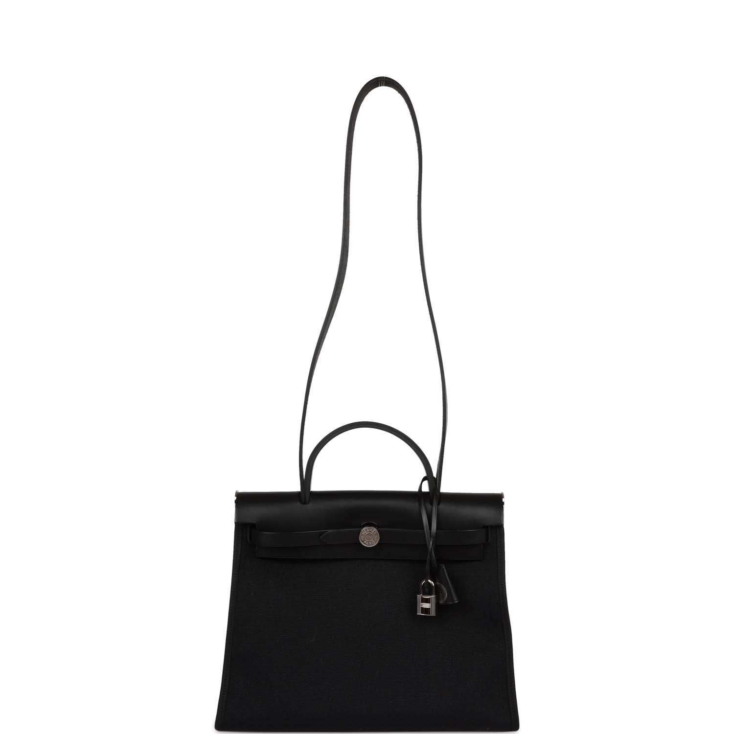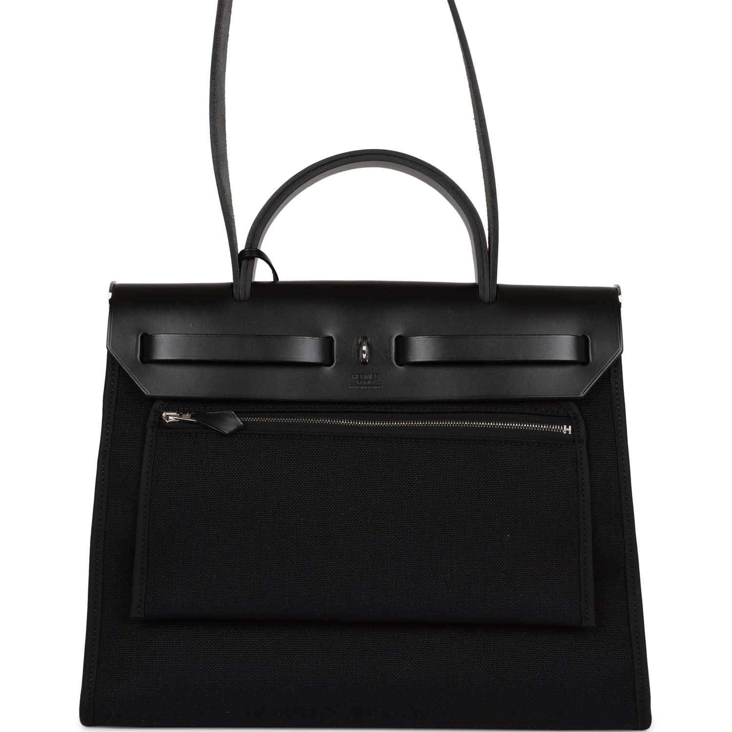 This Herbag Zip PM is of Black Toile H and Berline Hunter leather with palladium hardware and has tonal stitching, front flap, two straps with center clou de selle closure, clochette with lock and two keys, back zip pocket, single rolled handle and shoulder strap.
