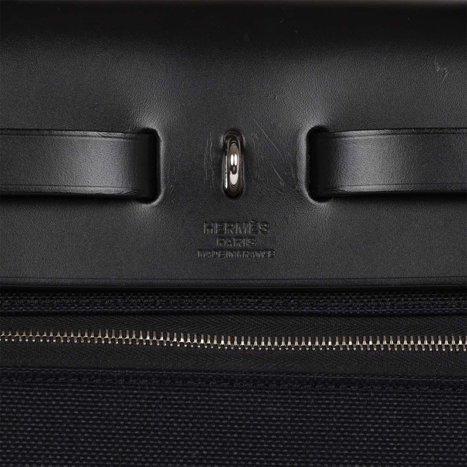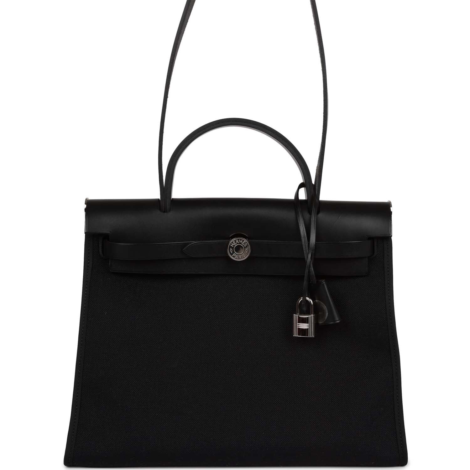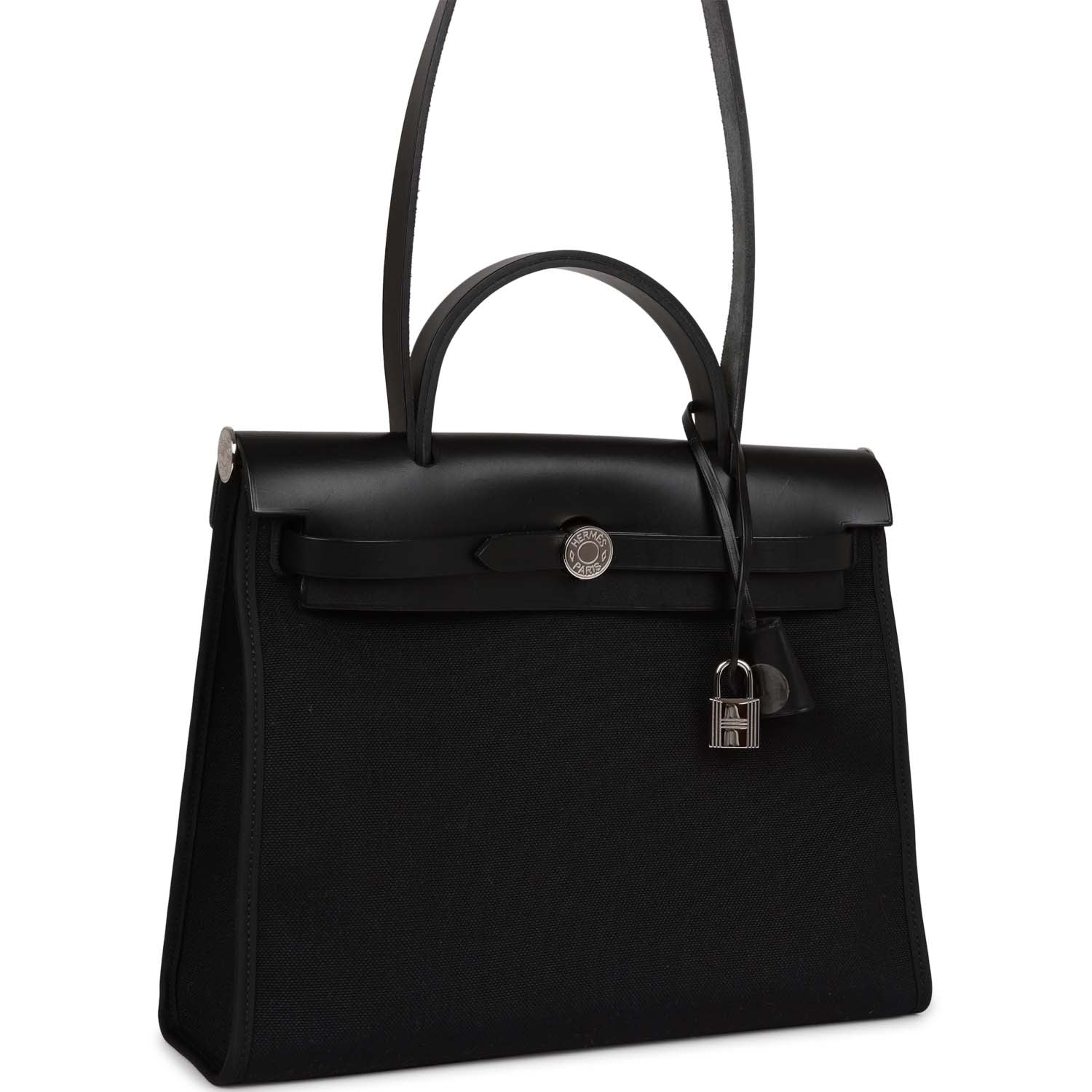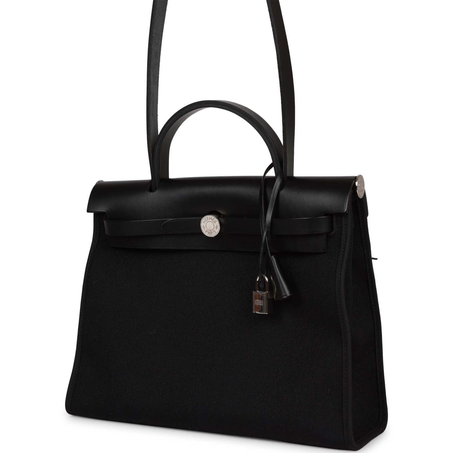 This Herbag Zip PM is of Black Toile H and Berline Hunter leather with palladium hardware and has tonal stitching, front flap, two straps with center clou de selle closure, clochette with lock and two keys, back zip pocket, single rolled handle and shoulder strap.