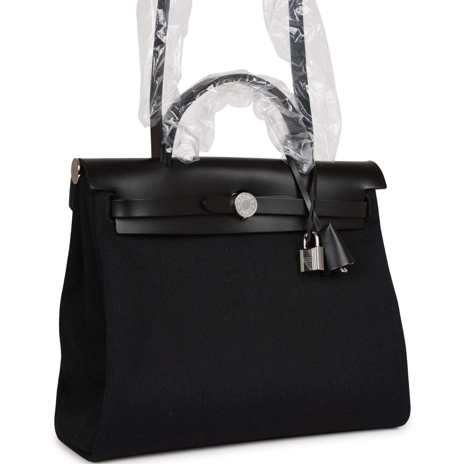 This Herbag Zip PM is of Black Toile H and Berline Hunter leather with palladium hardware and has tonal stitching, front flap, two straps with center clou de selle closure, clochette with lock and two keys, back zip pocket, single rolled handle and shoulder strap.