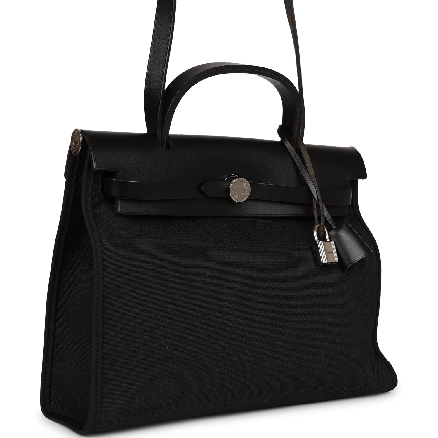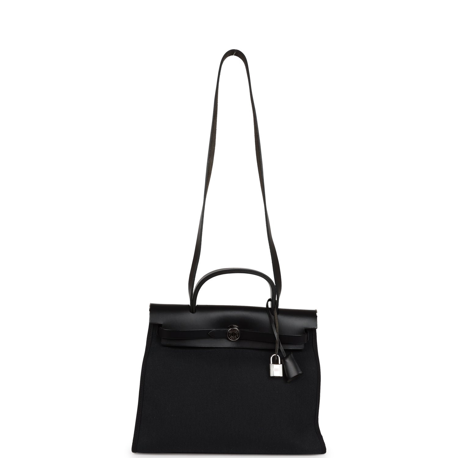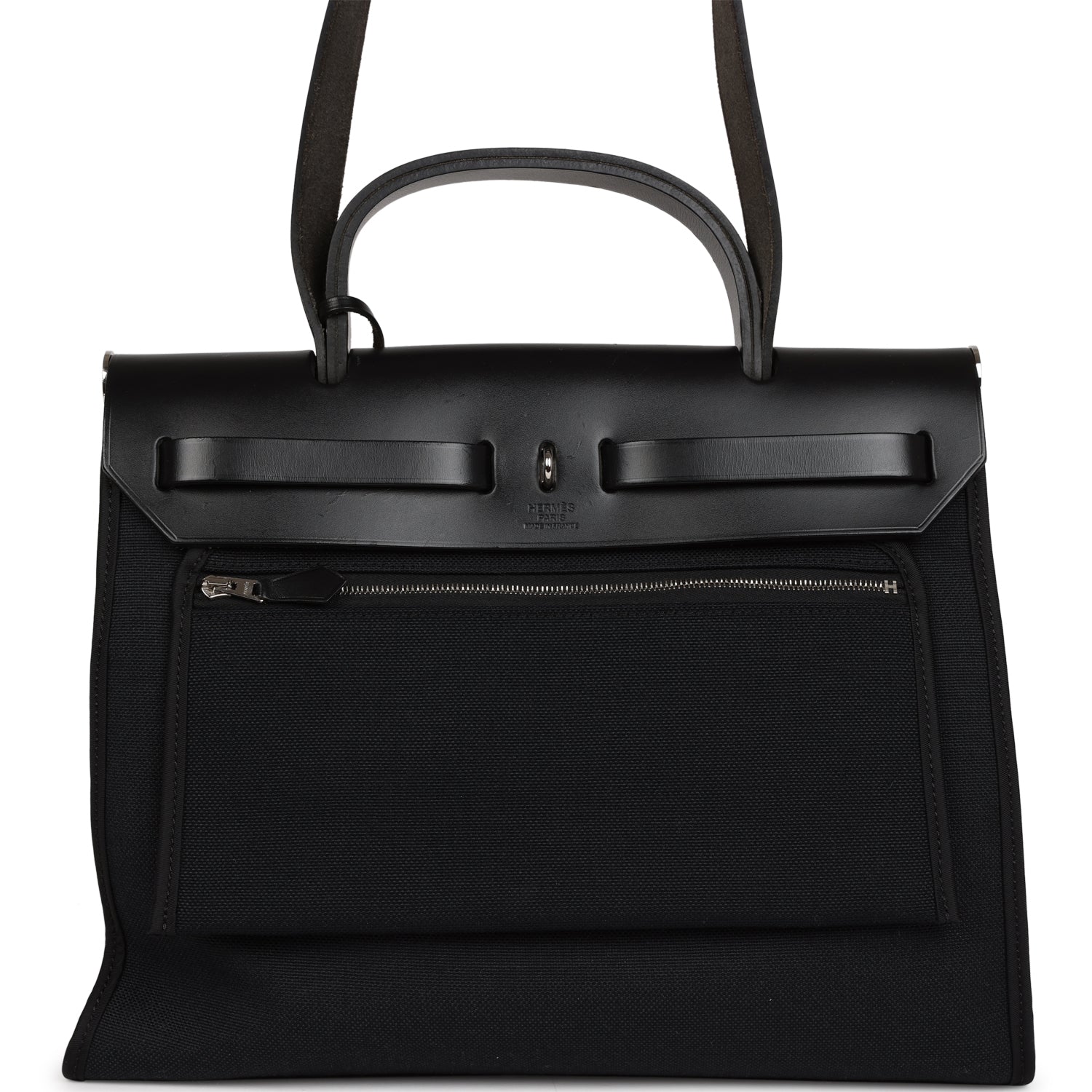 This Herbag Zip PM is of Black Toile H and Berline Hunter leather with palladium hardware and has tonal stitching, front flap, two straps with center clou de selle closure, clochette with lock and two keys, back zip pocket, single rolled handle and shoulder strap.