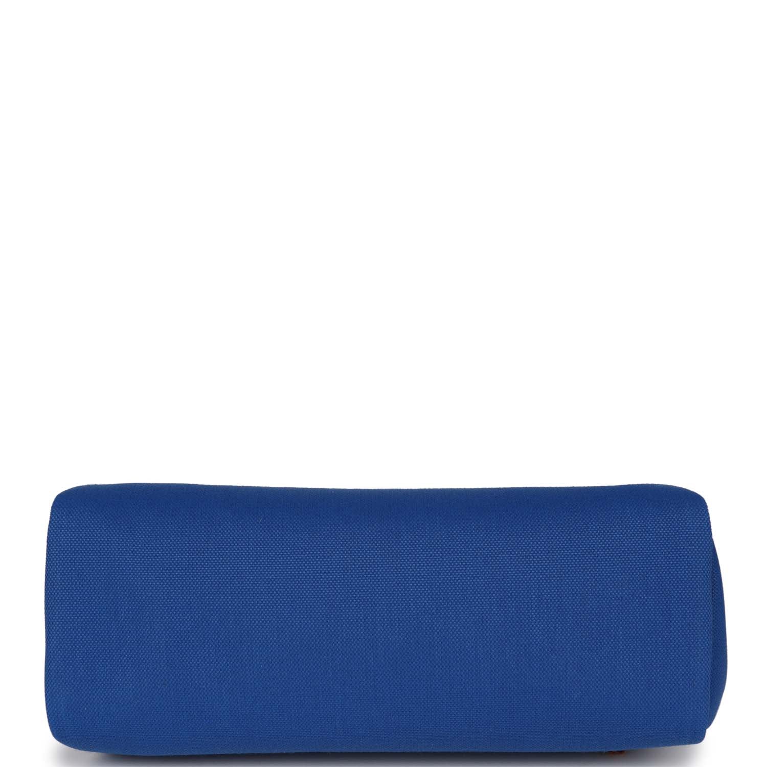 This Herbag Zip PM is in Bleu France Toile H and Fauve Vache Hunter leather with palladium hardware and has tonal stitching, front flap, two straps with center clou de selle closure, clochette with lock and two keys, back zip pocket, single rolled handle and shoulder strap.