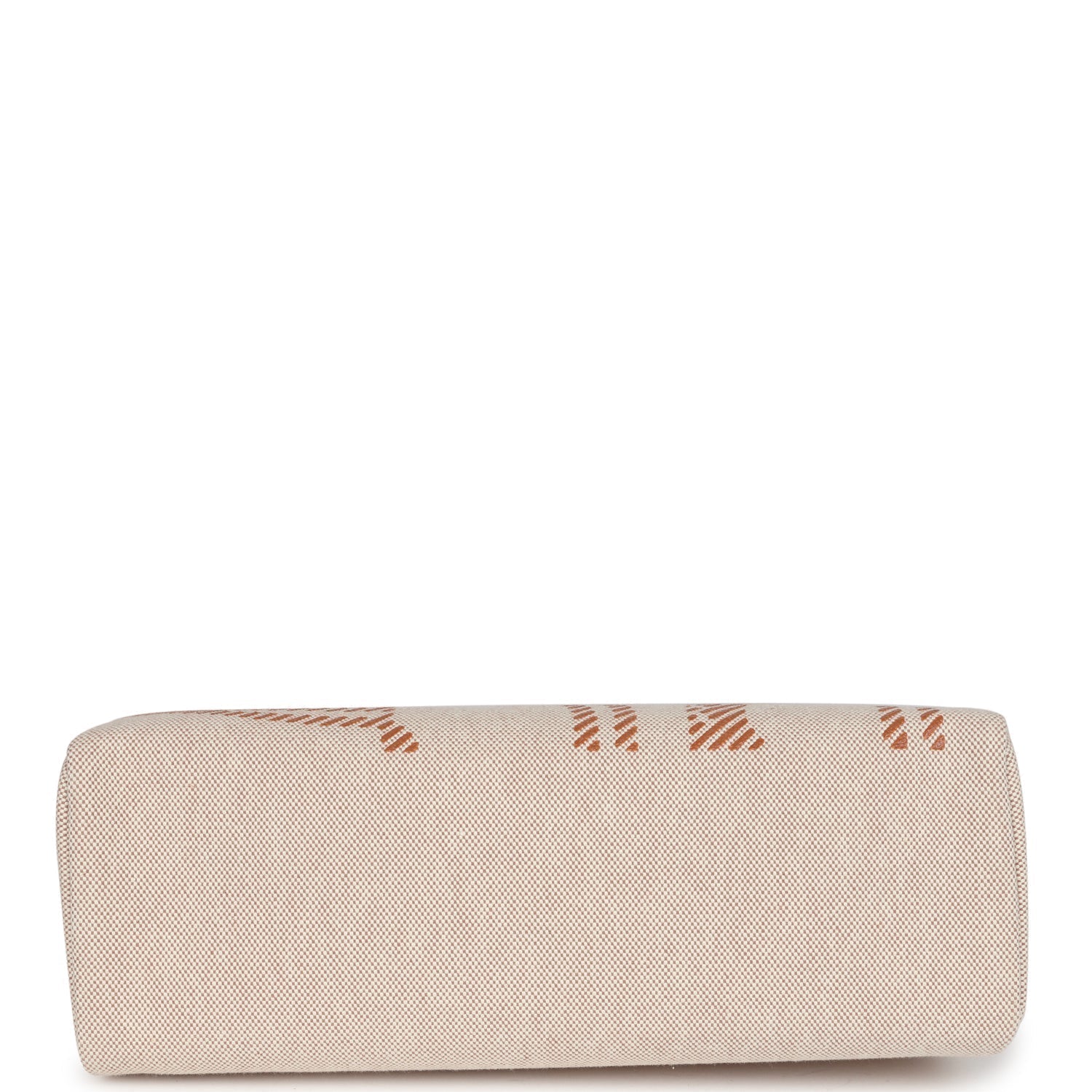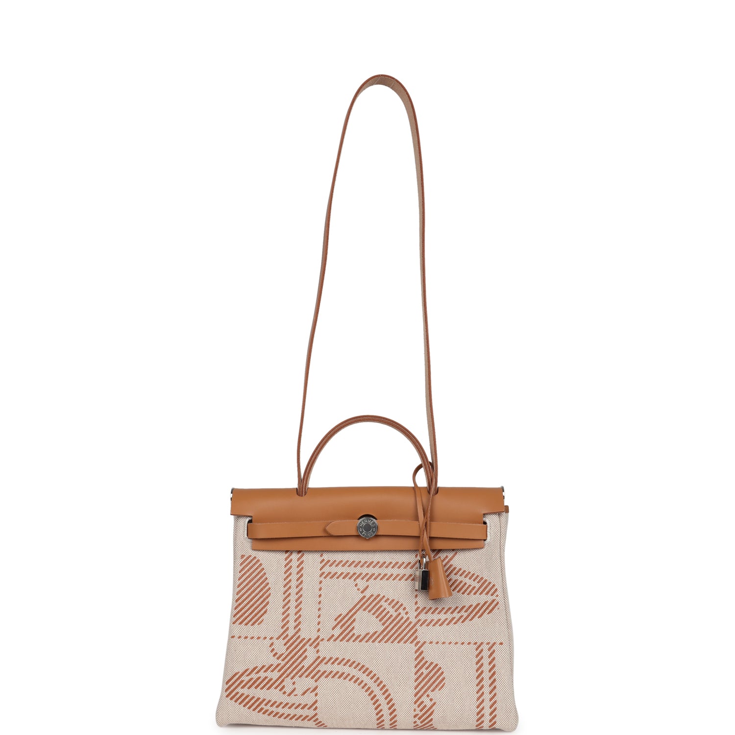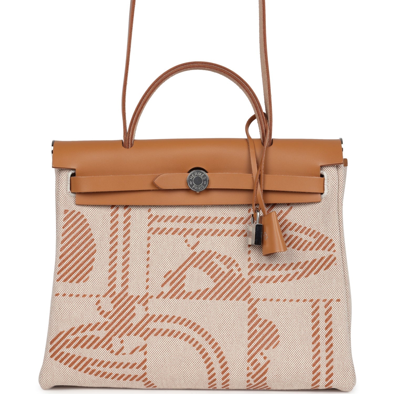 This Hermes Herbag Zip PM 31 "Brides De Gala" is in Natural Sable and Ecru Toile H and Berline Hunter leather with palladium hardware and has tonal stitching, front flap, two straps with center clou de selle closure, clochette with lock and two keys, back zip pocket, single rolled handle and shoulder strap.