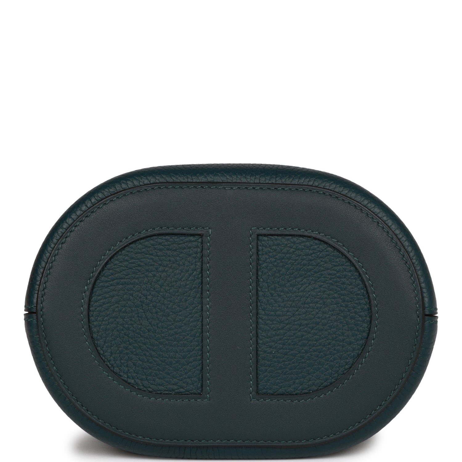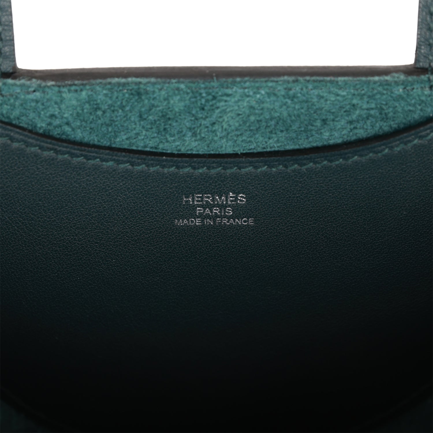 This In-The-Loop 18 is in Vert Cypress clemence and swift leather with palladium hardware and has contrast stitching with two top handles.