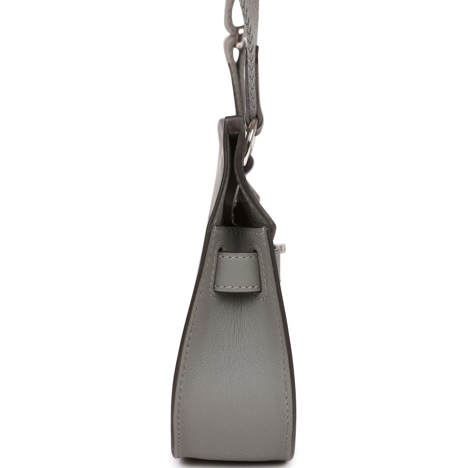 This Jypsiere mini is in Gris Meyer swift leather with palladium hardware and has tonal stitching, a single flap, two pull straps, turnlock closure, and an adjustable wooly shoulder strap.